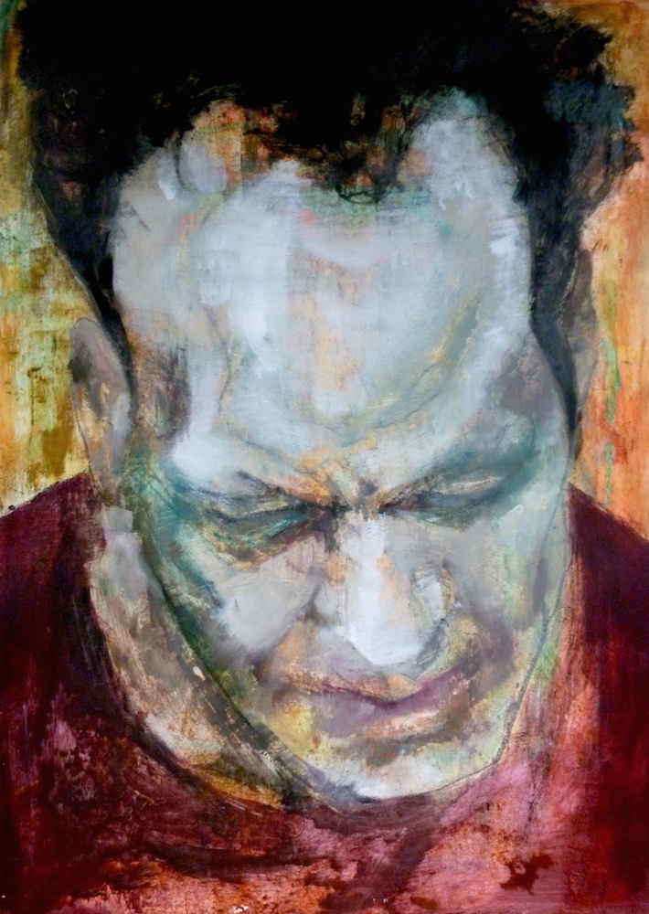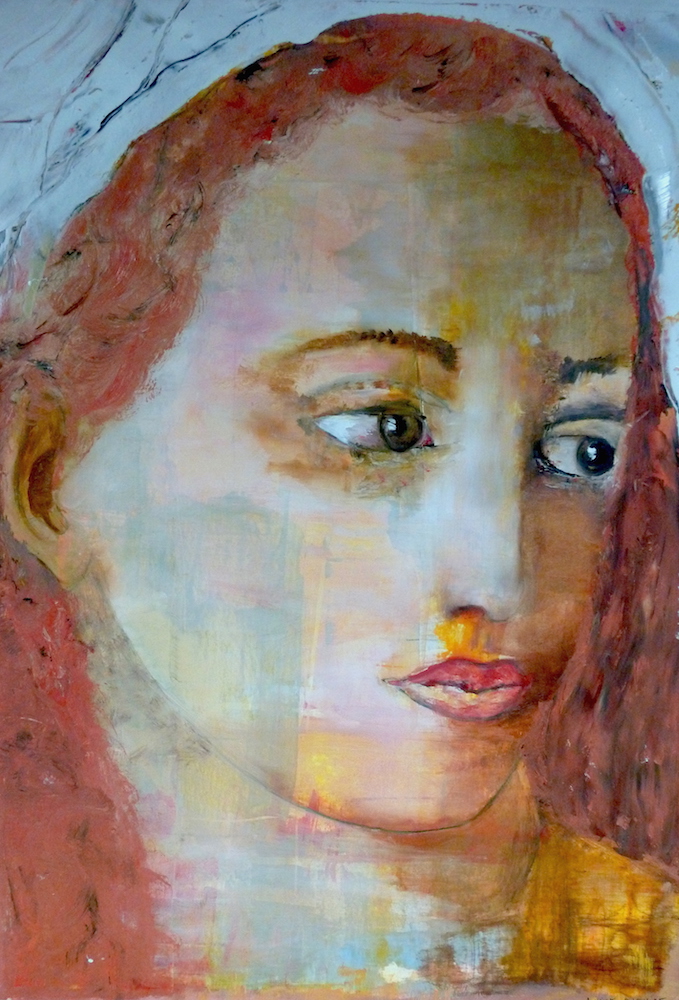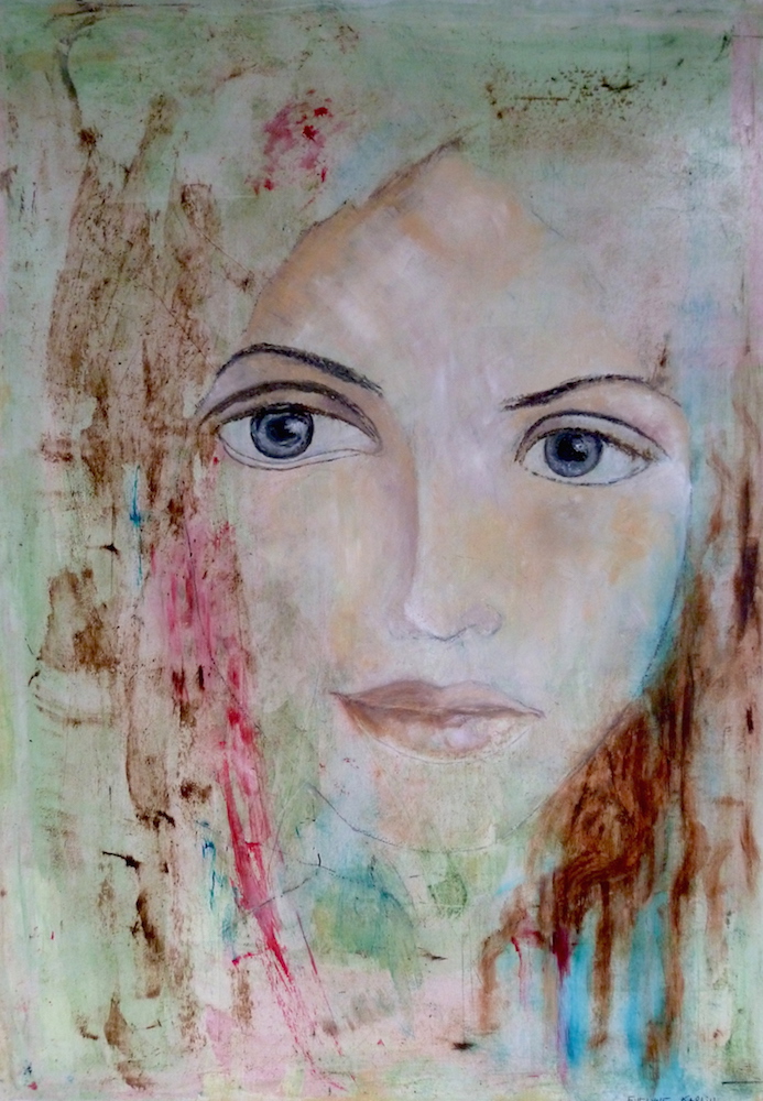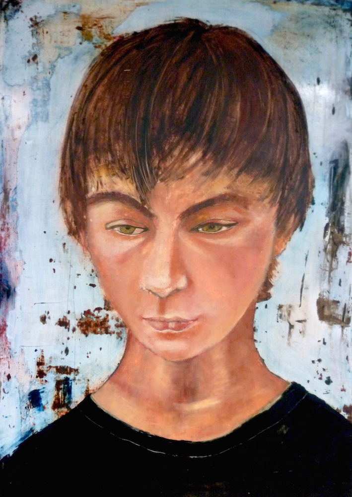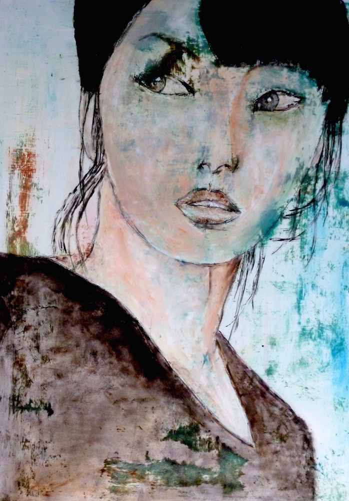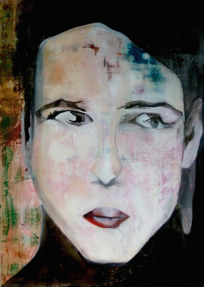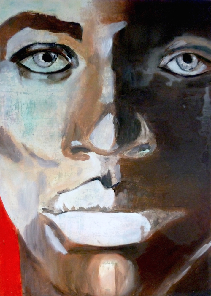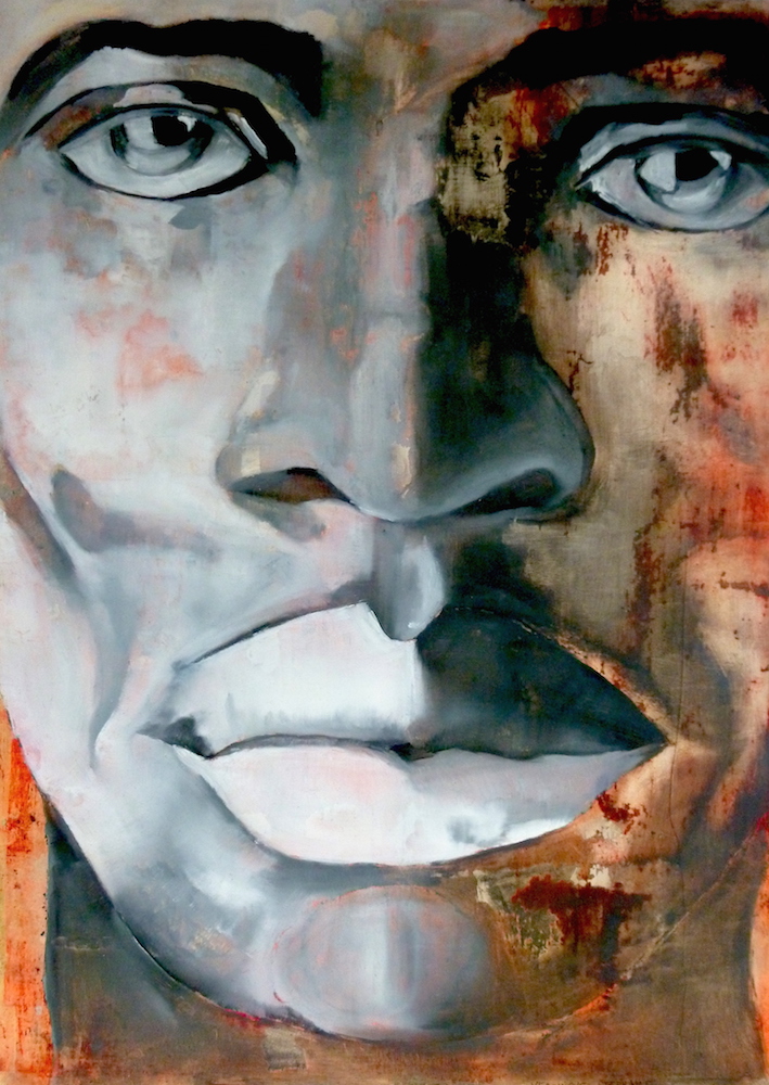 Janvier 2017 – Format 50×70 – Peinture à l’huile sur carton plume fond patiné au chiffon, portrait en transparence