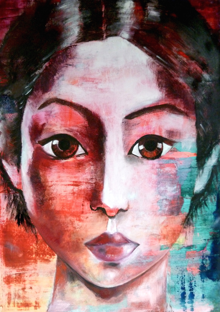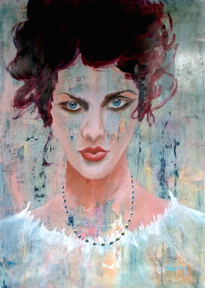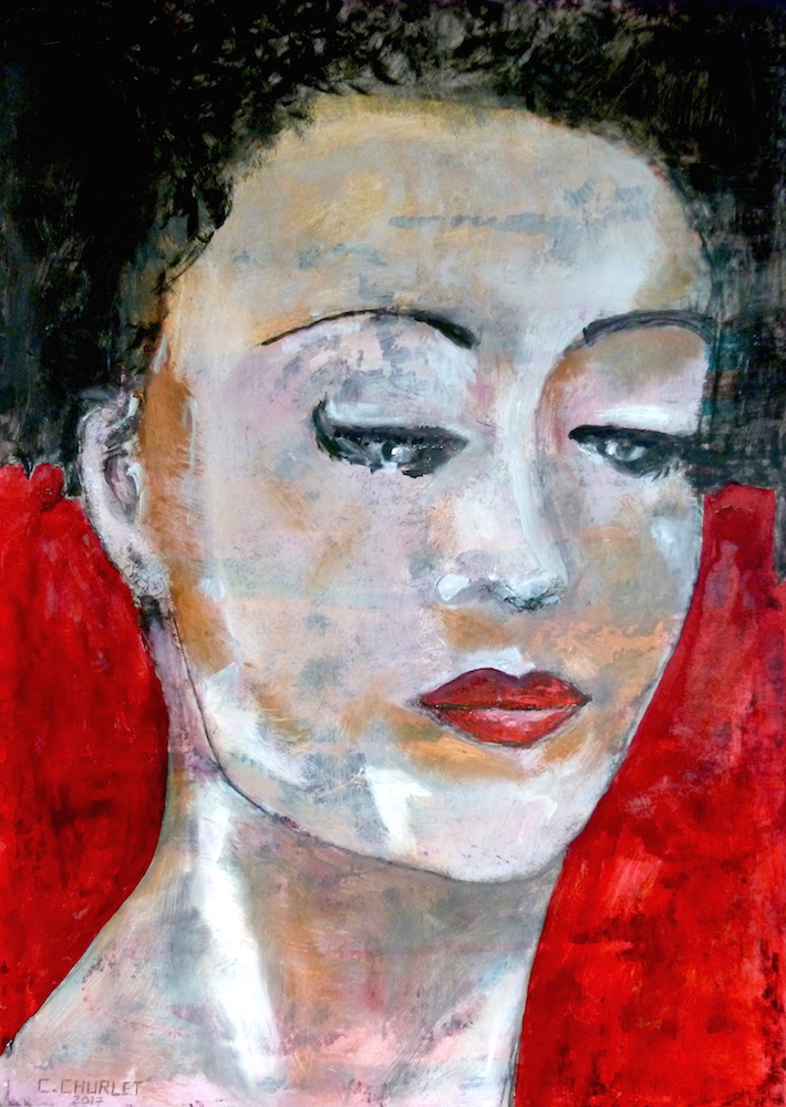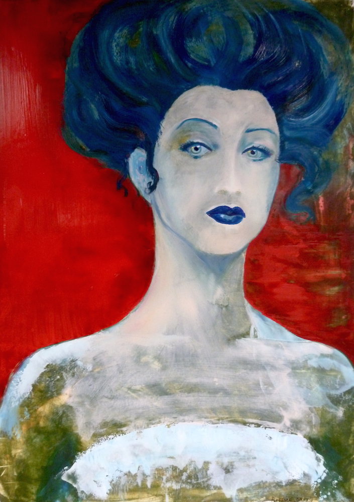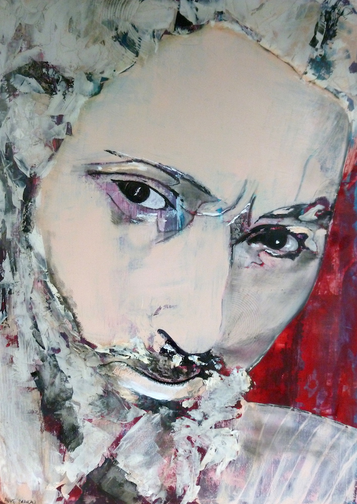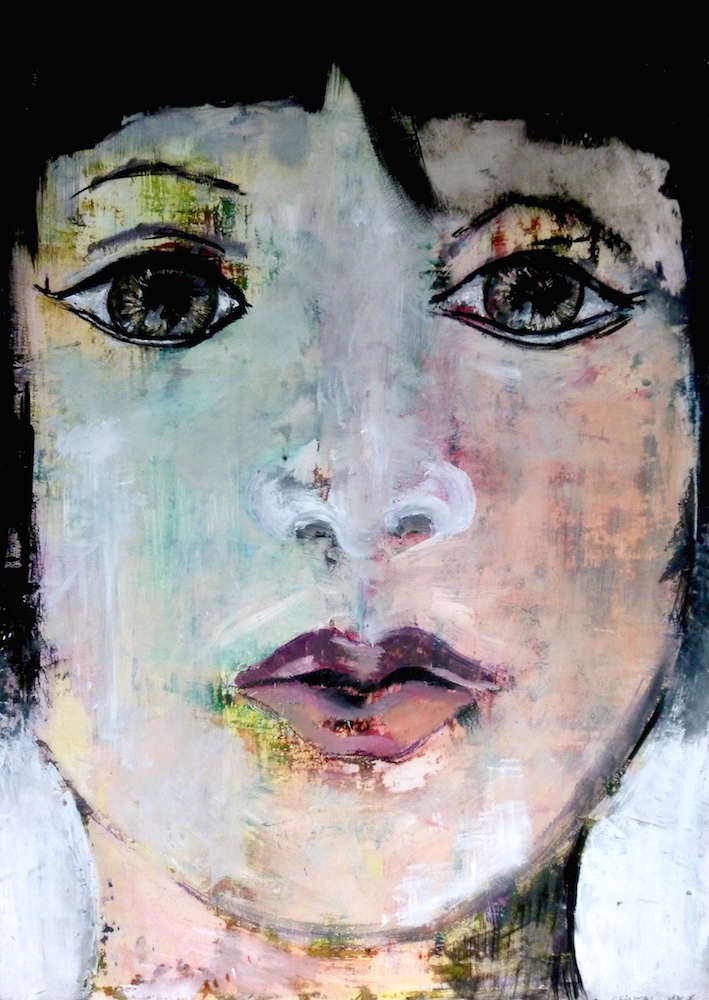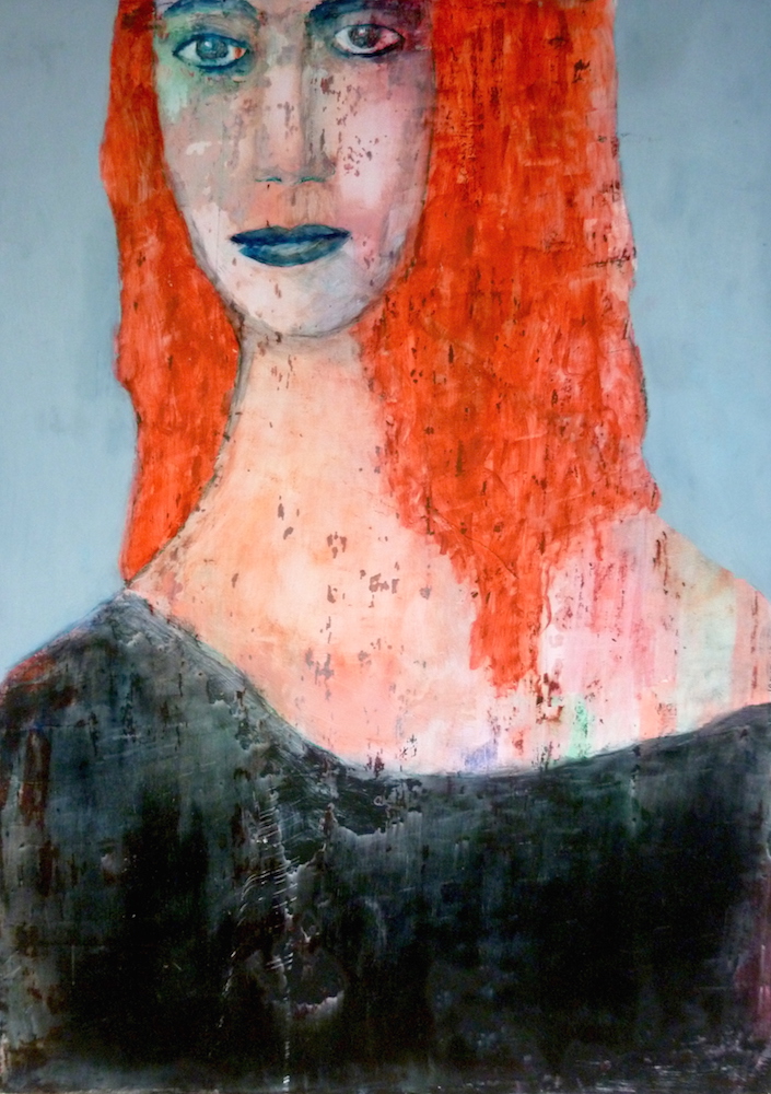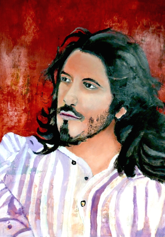 Janvier 2017 – Format 50×70 – Peinture à l’huile sur carton plume fond patiné au chiffon, portrait en transparence