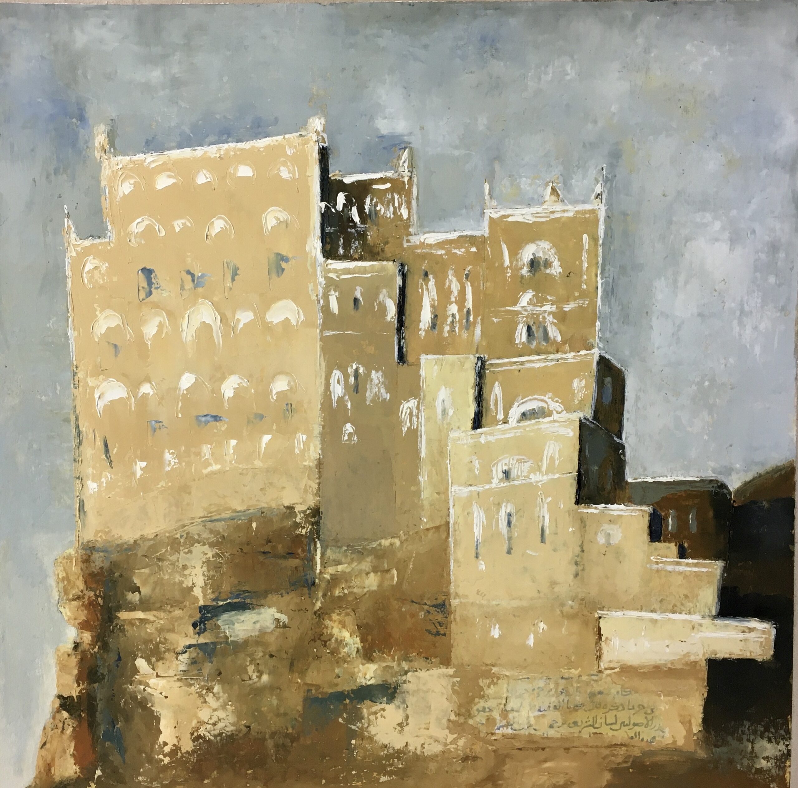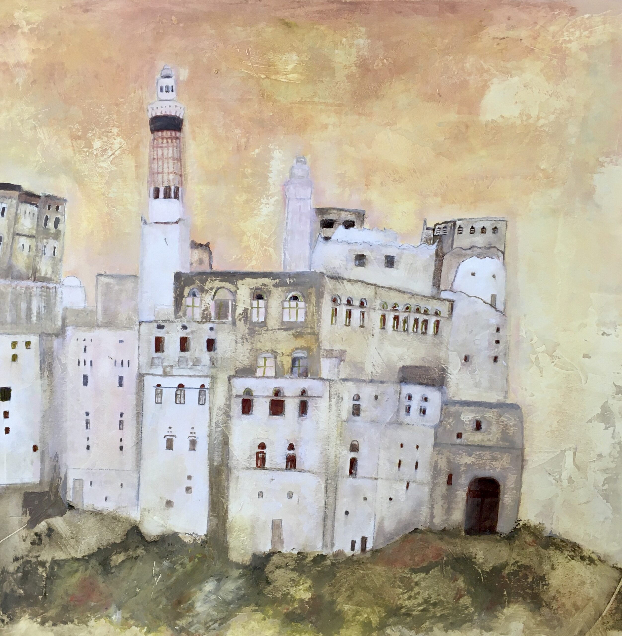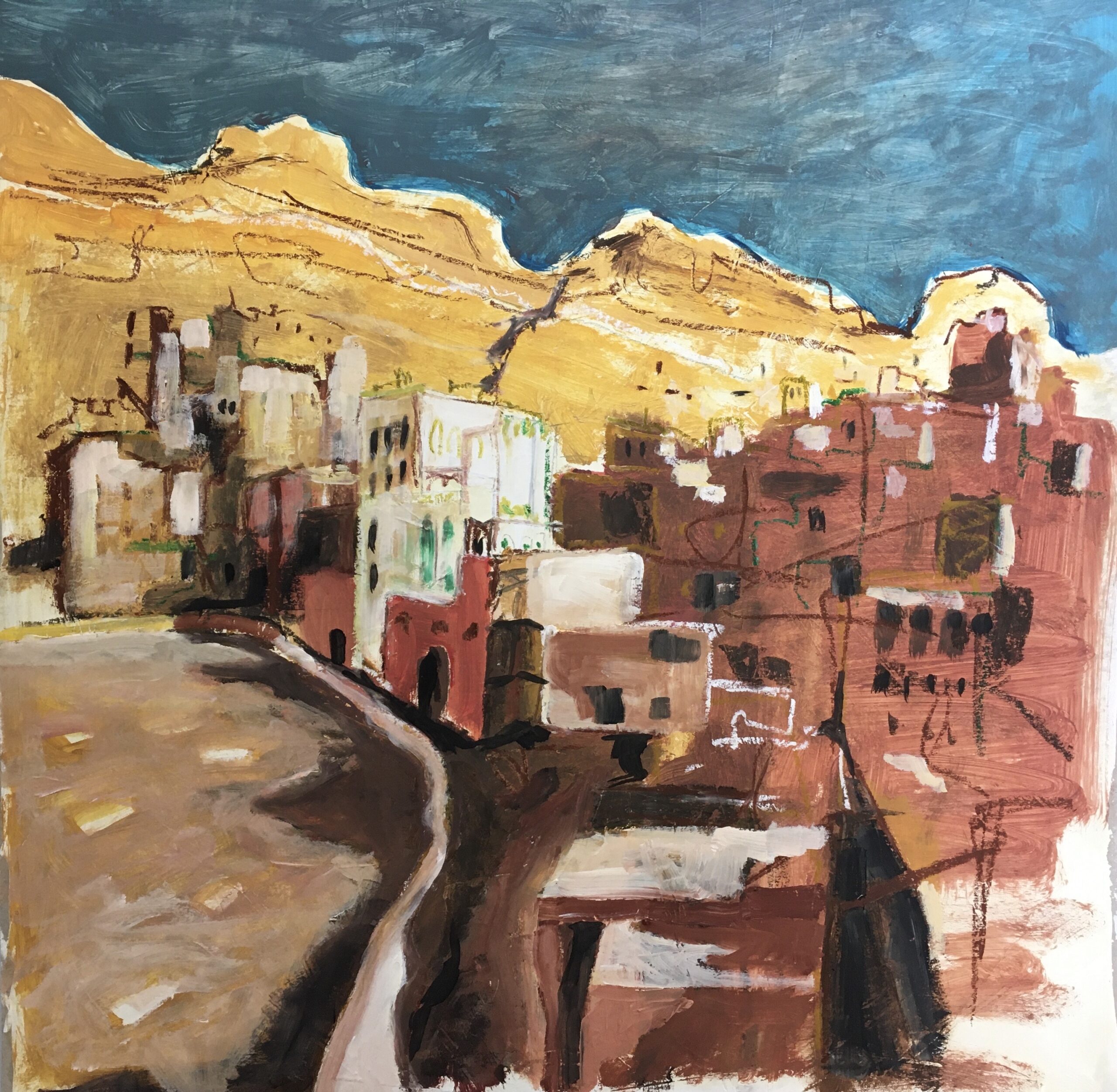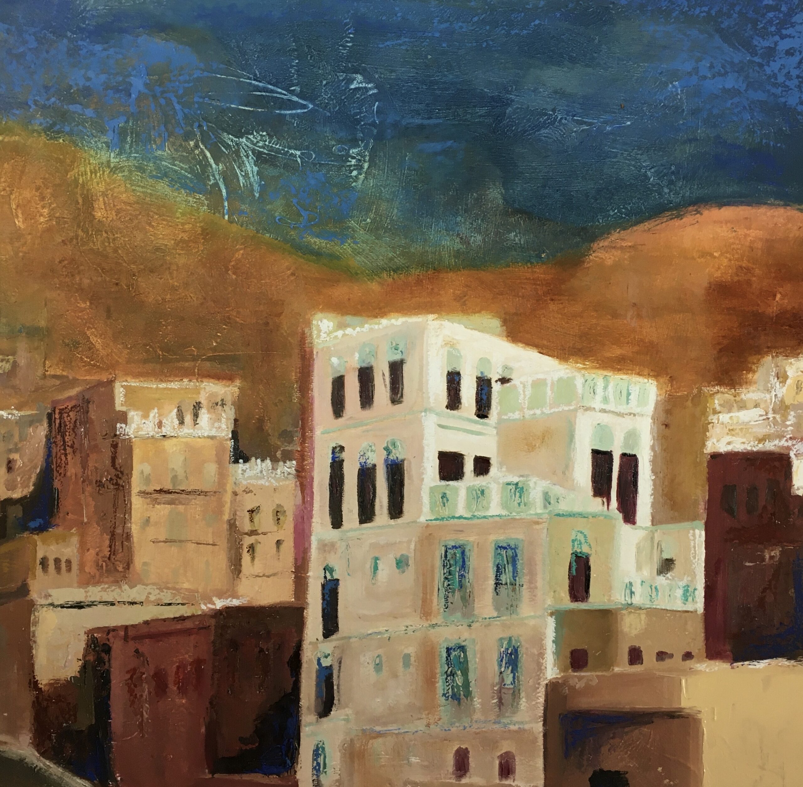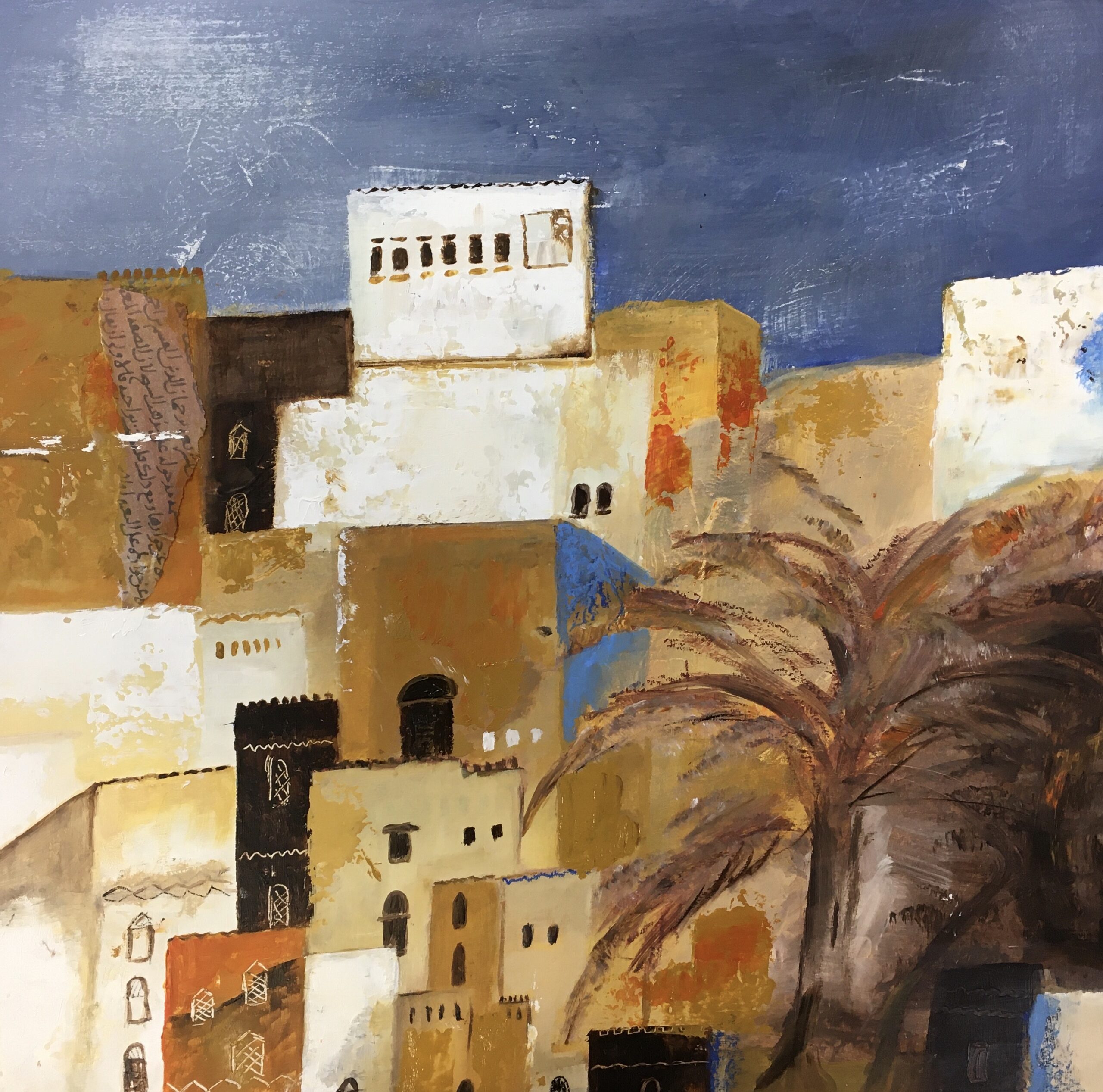 Villes et villages du Yémen, peinture à l’huile avec rehauts au pastel et collages