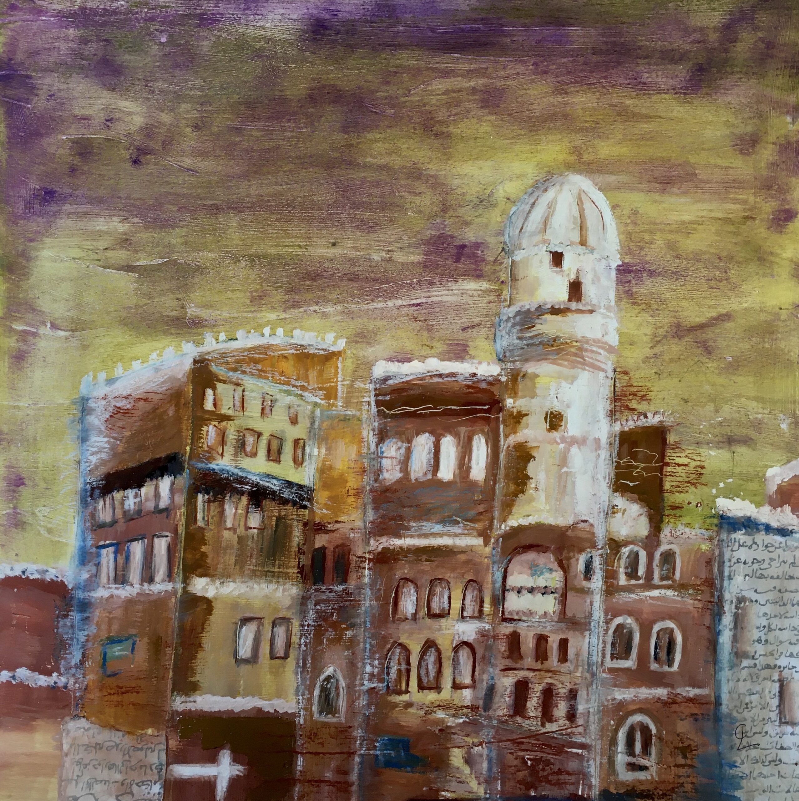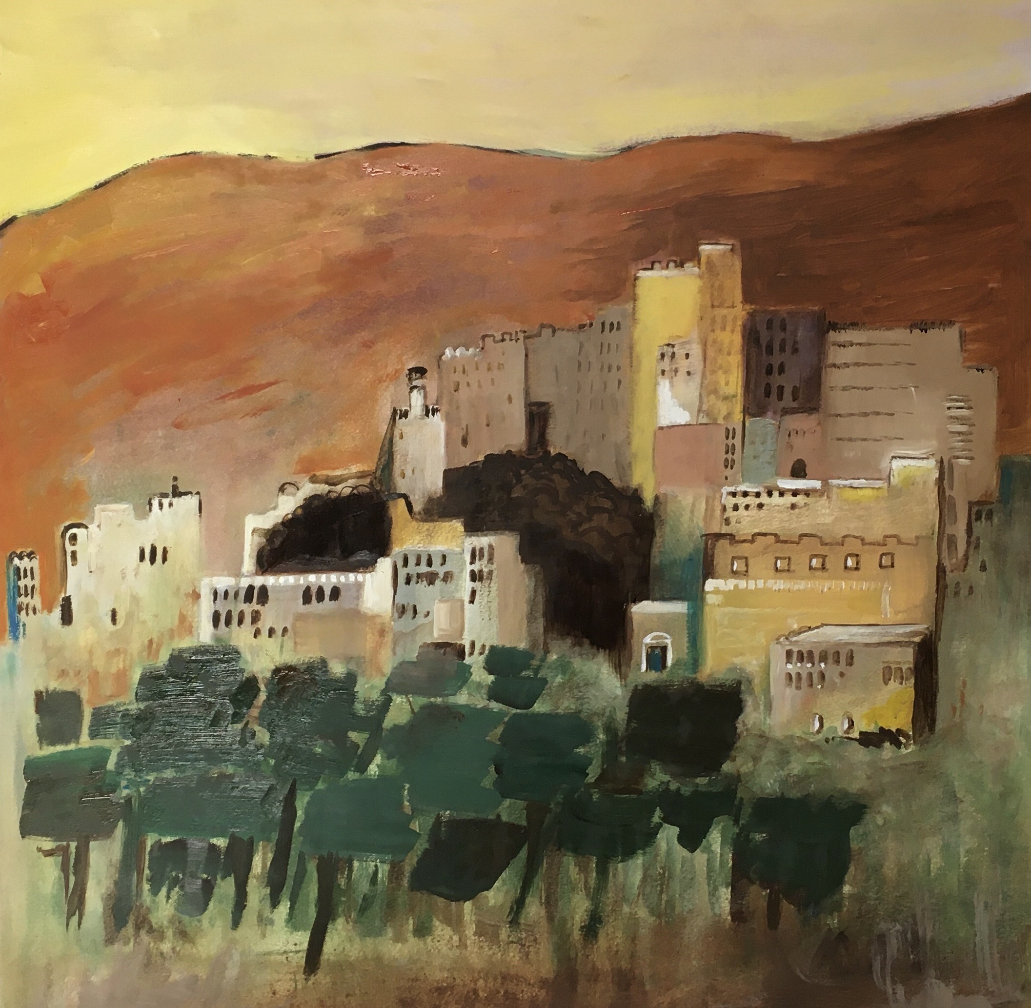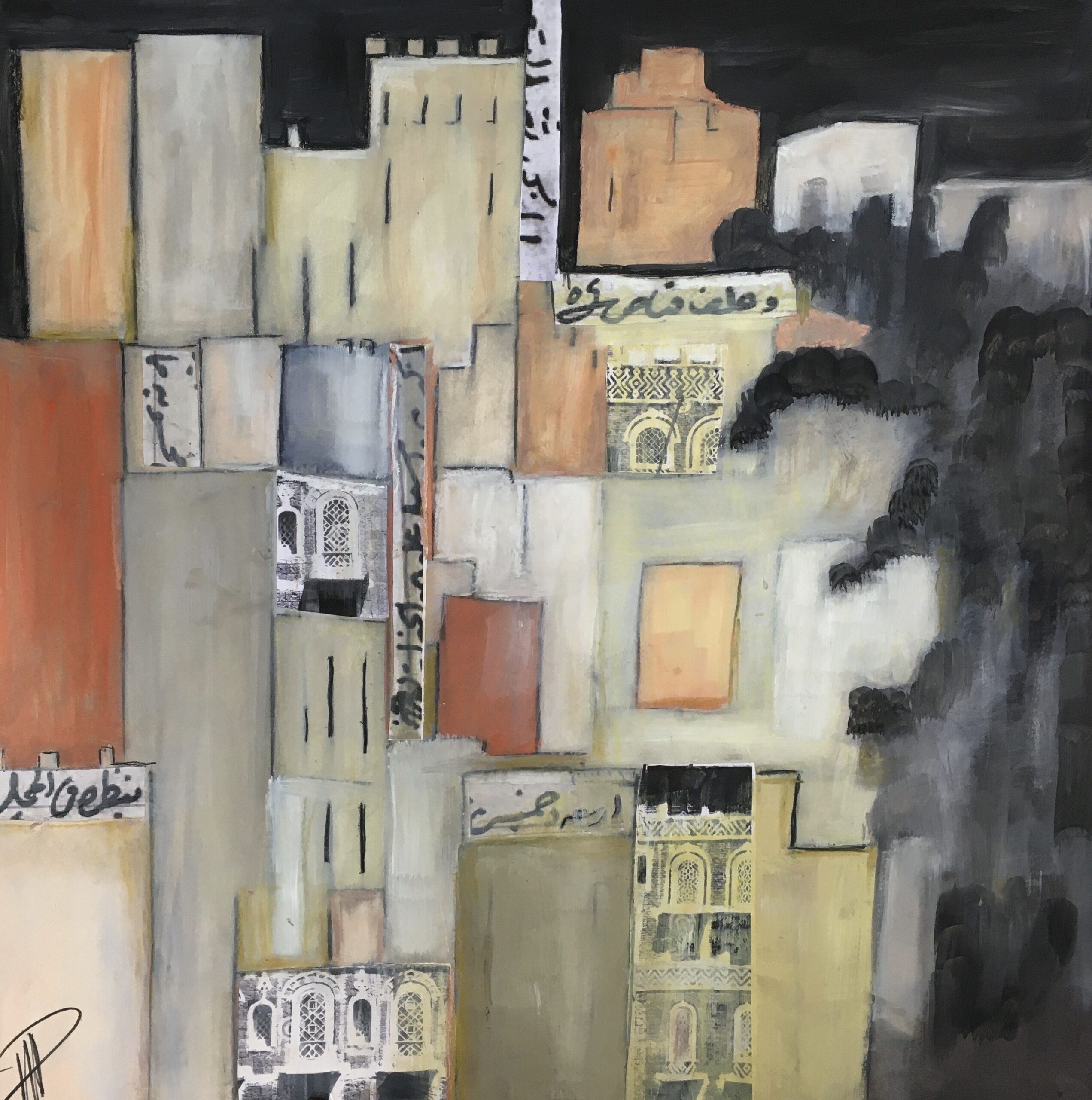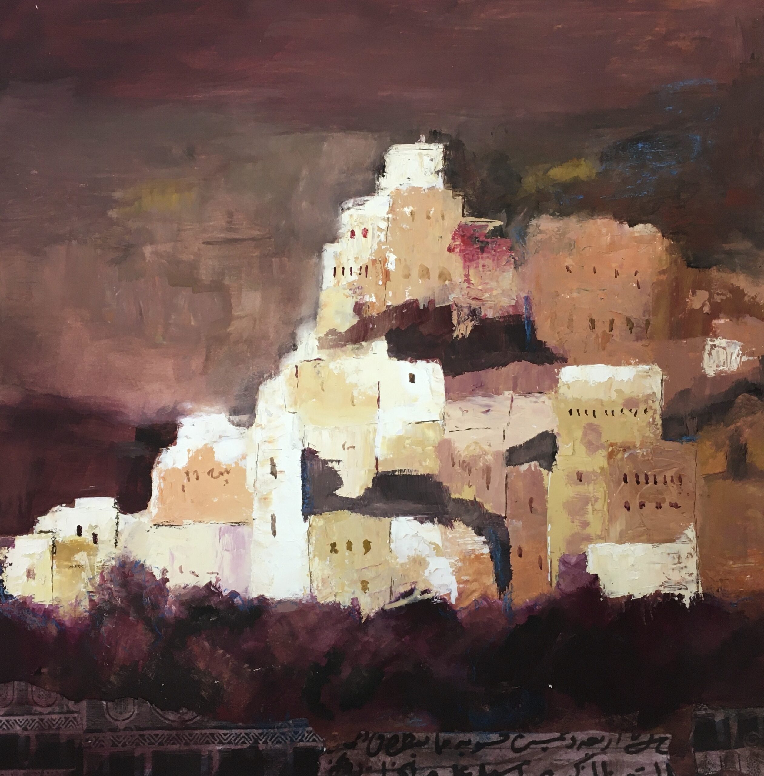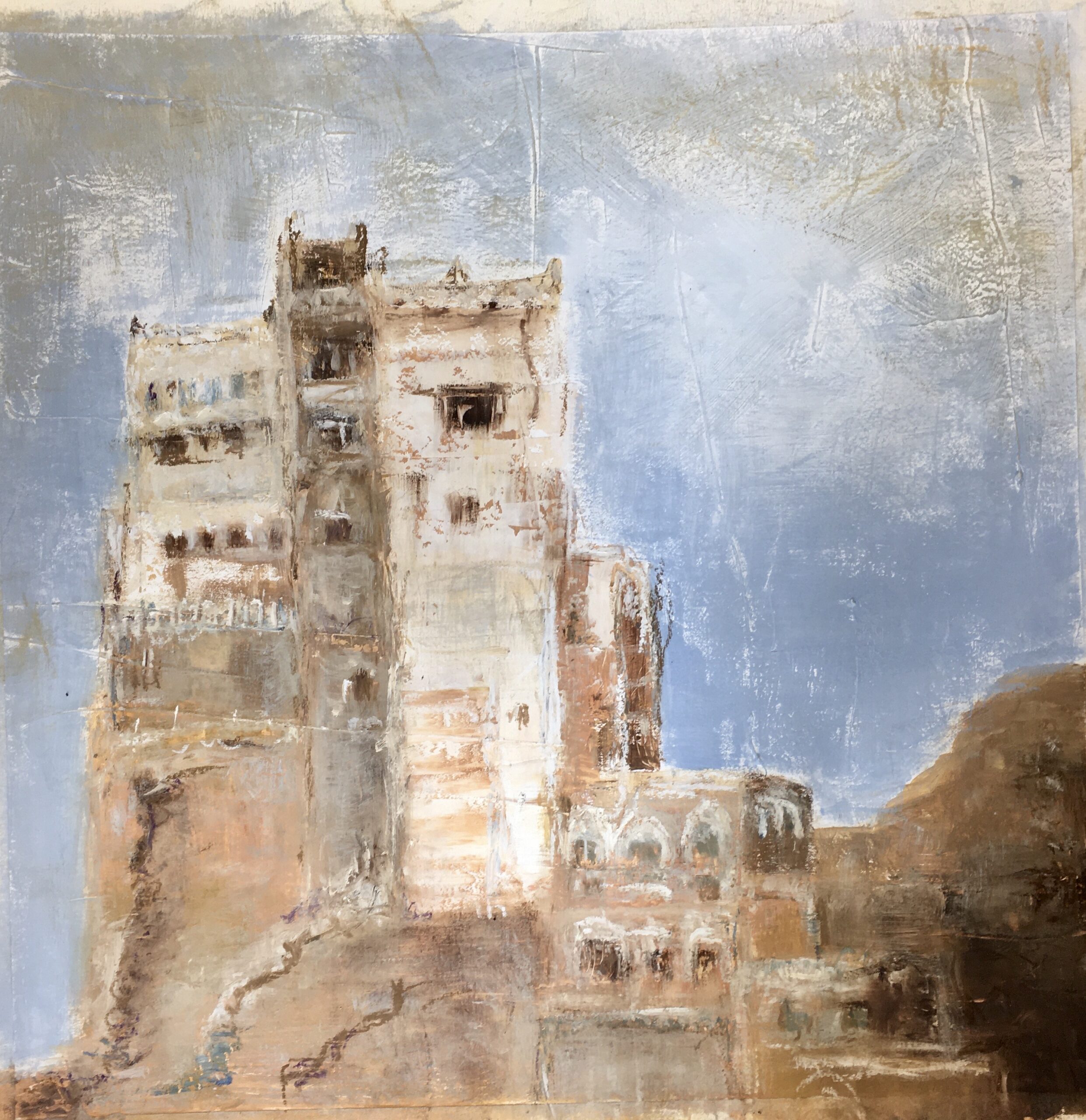 Villes et villages du Yémen, peinture à l’huile avec rehauts au pastel et collages