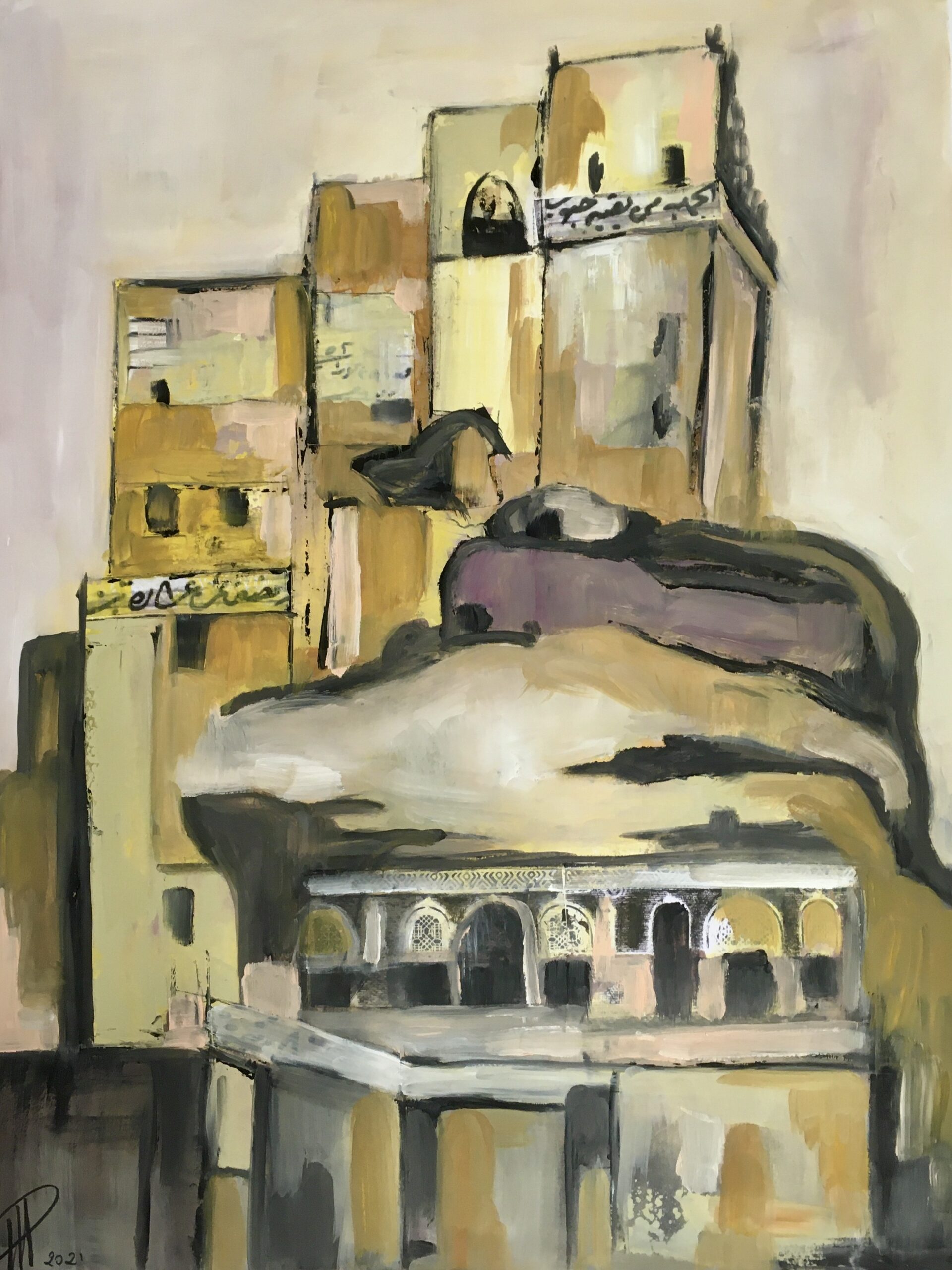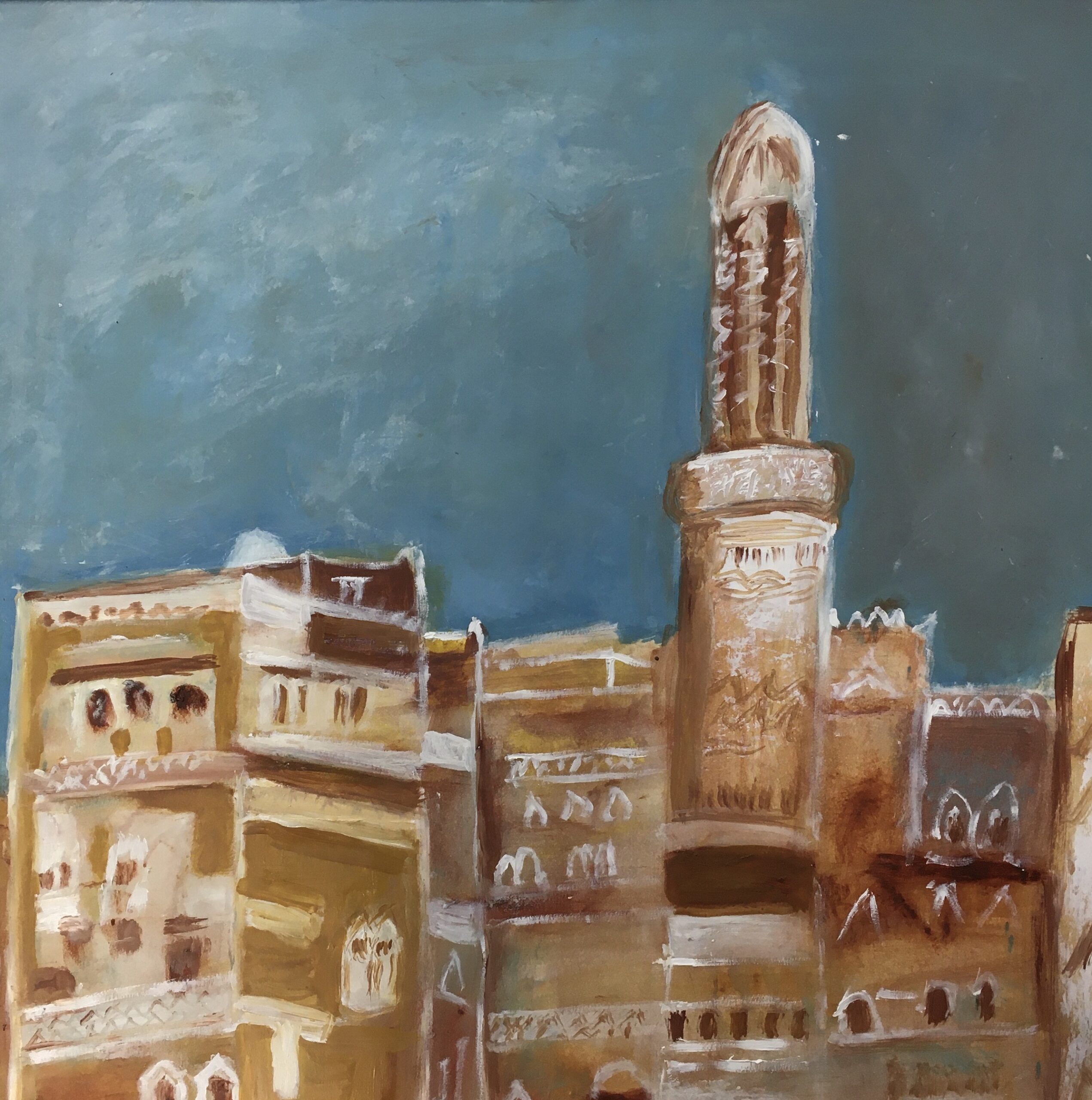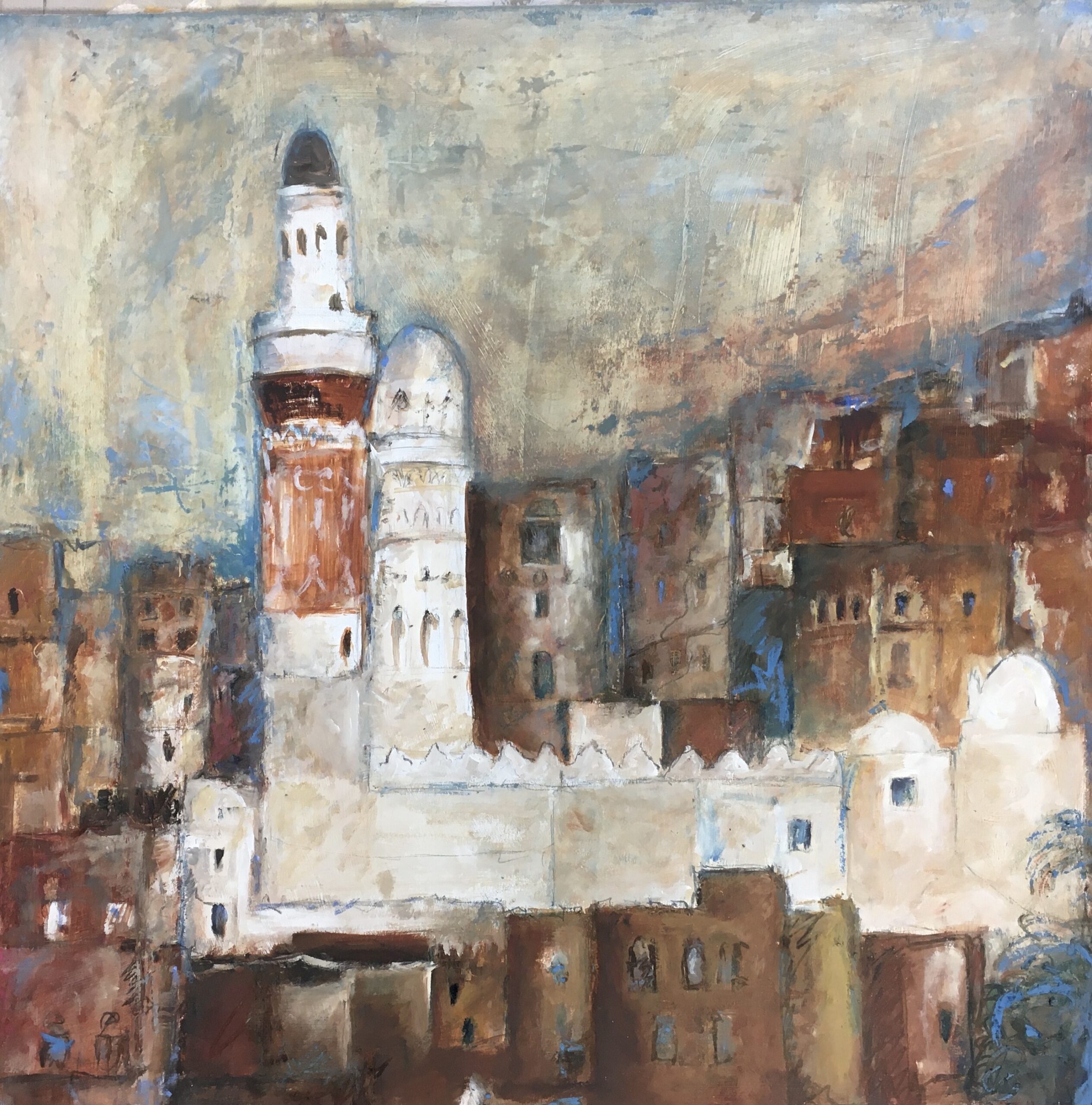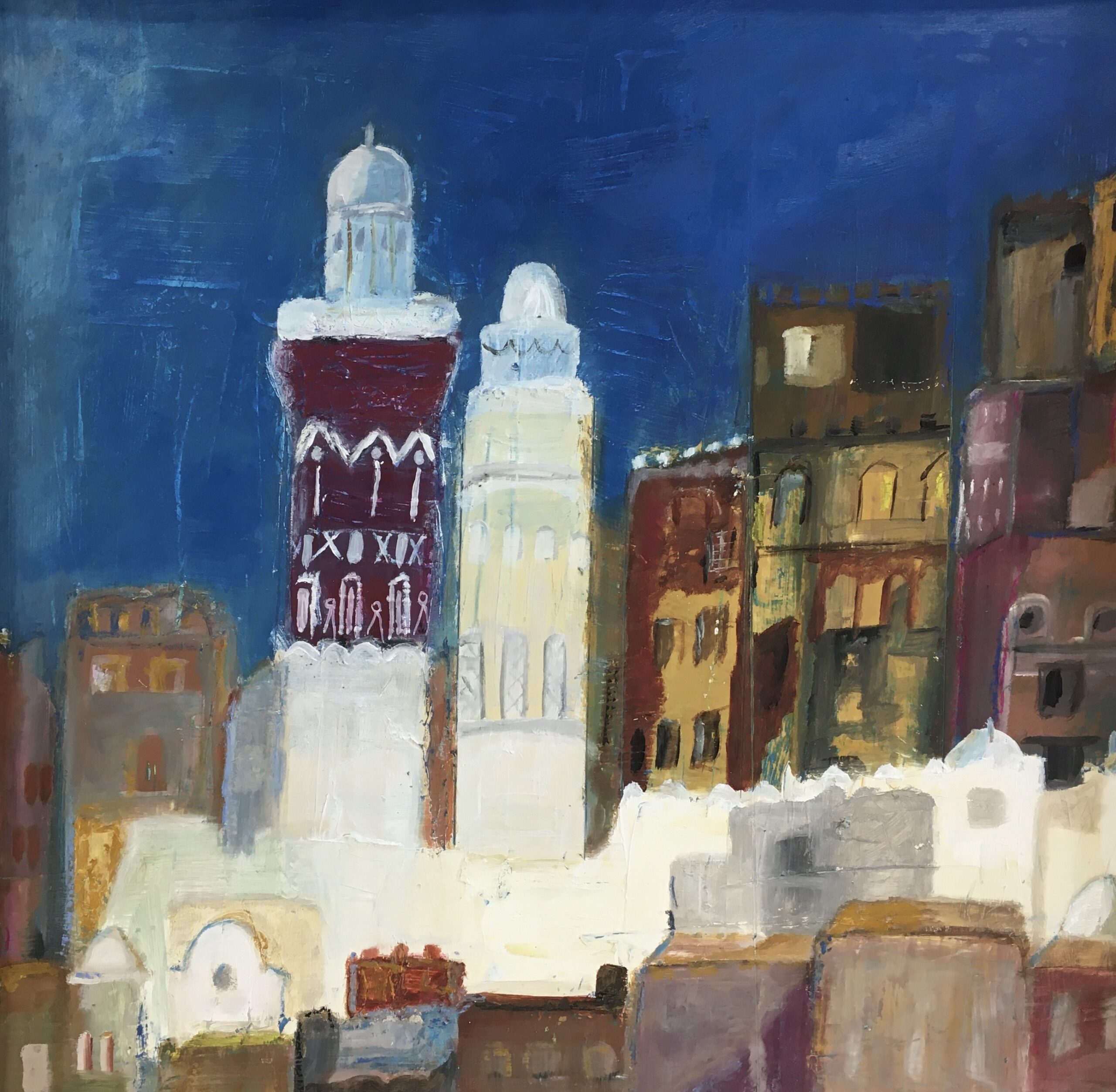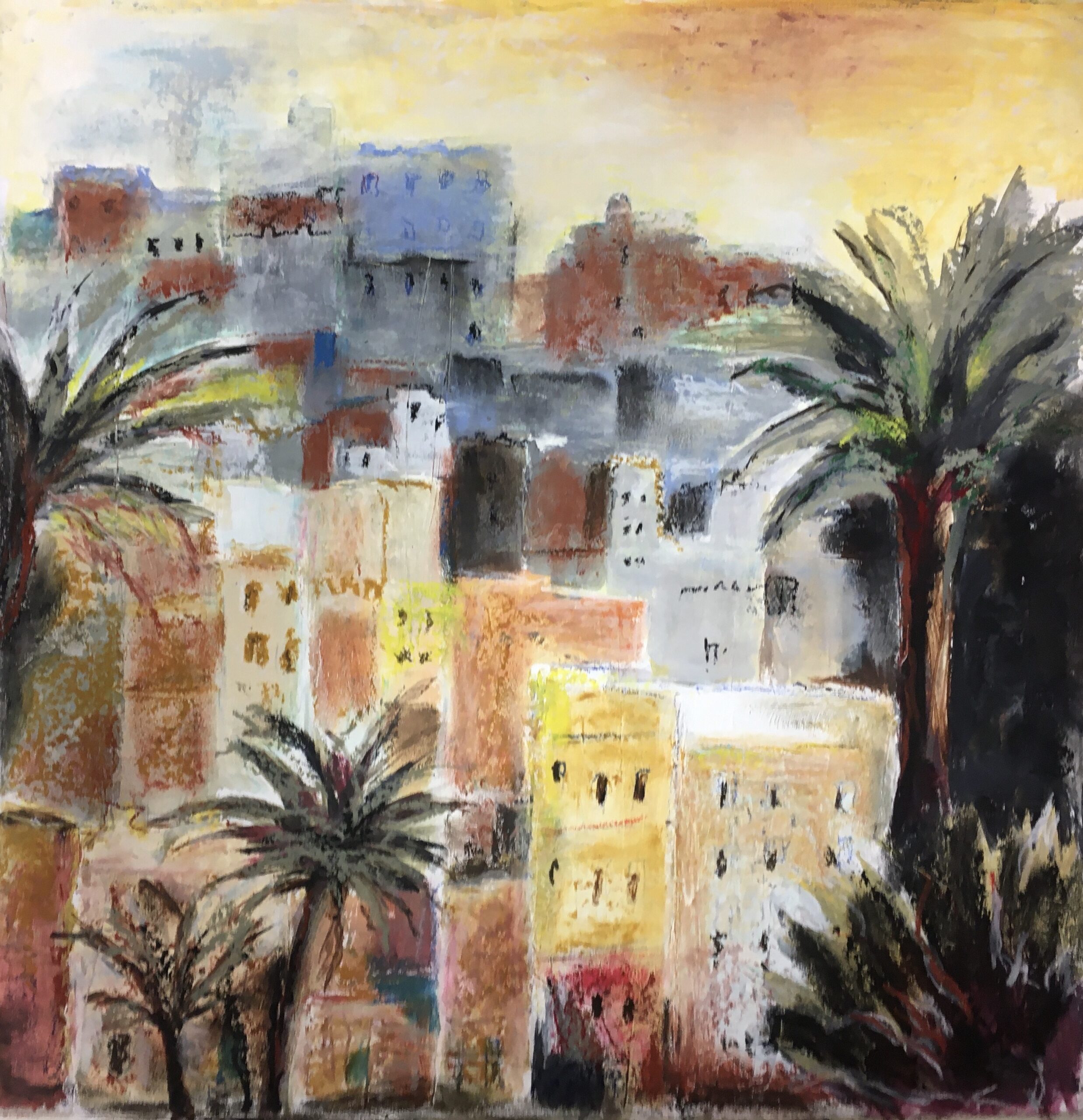 Villes et villages du Yémen, peinture à l’huile avec rehauts au pastel et collages