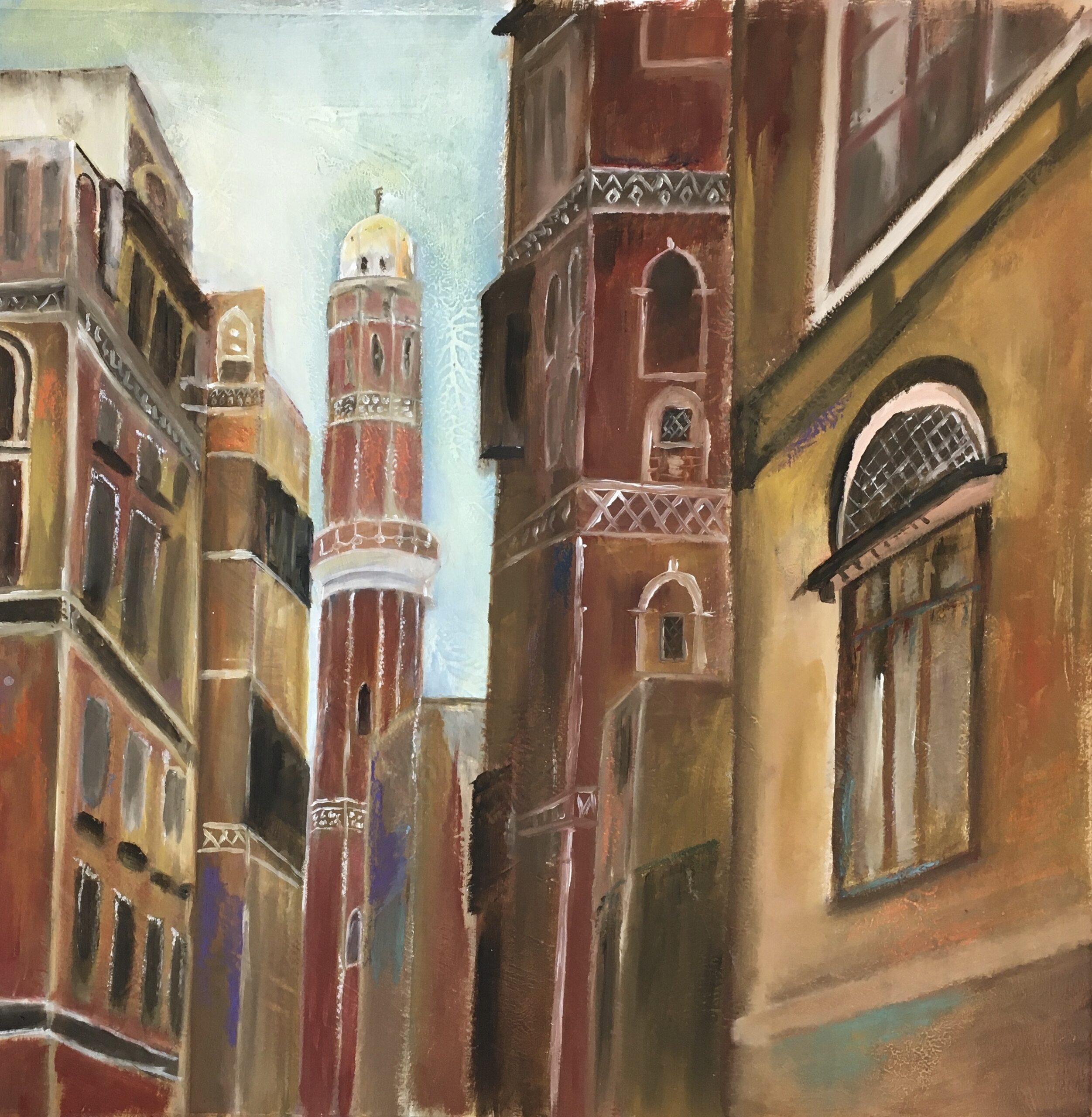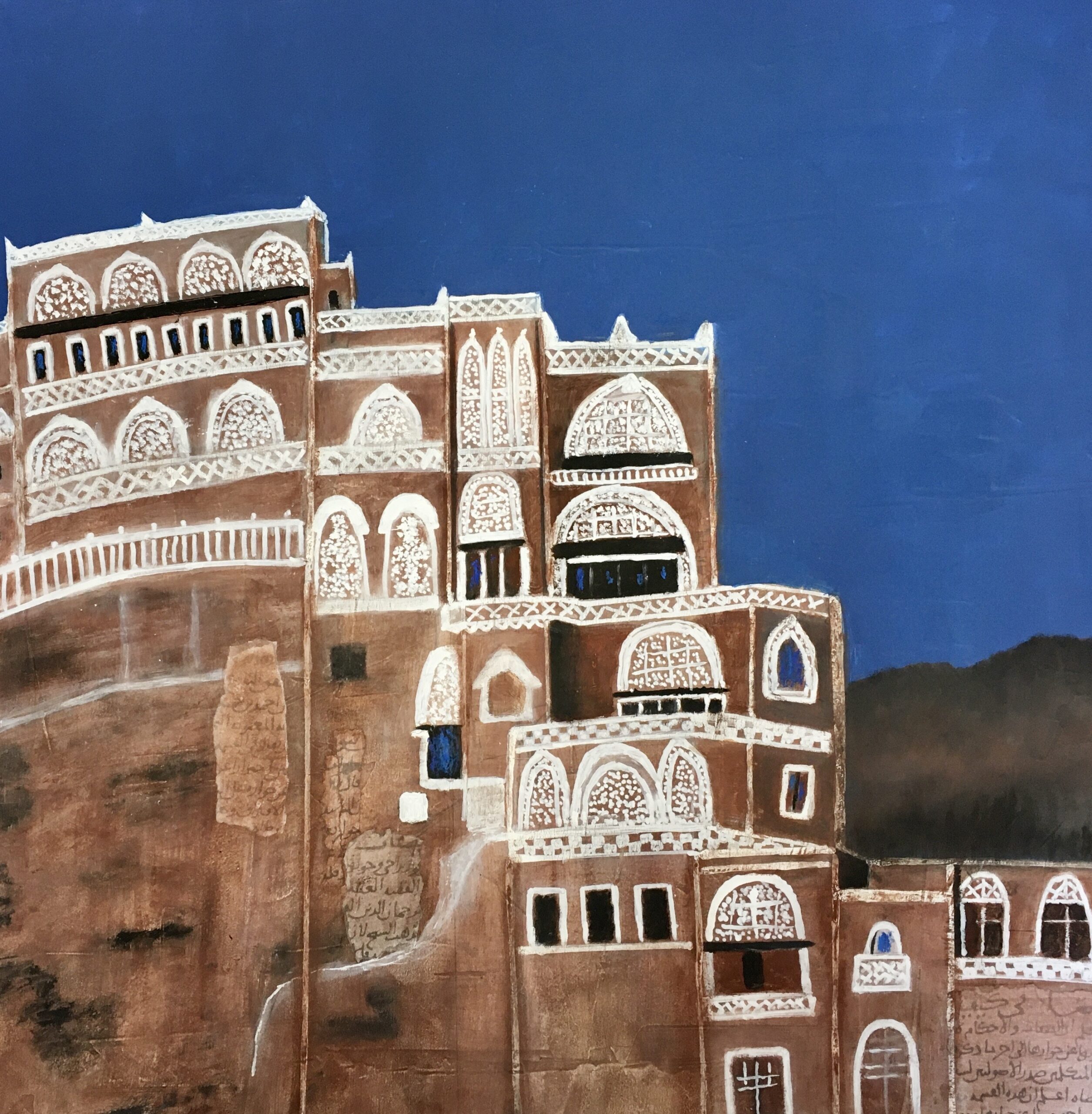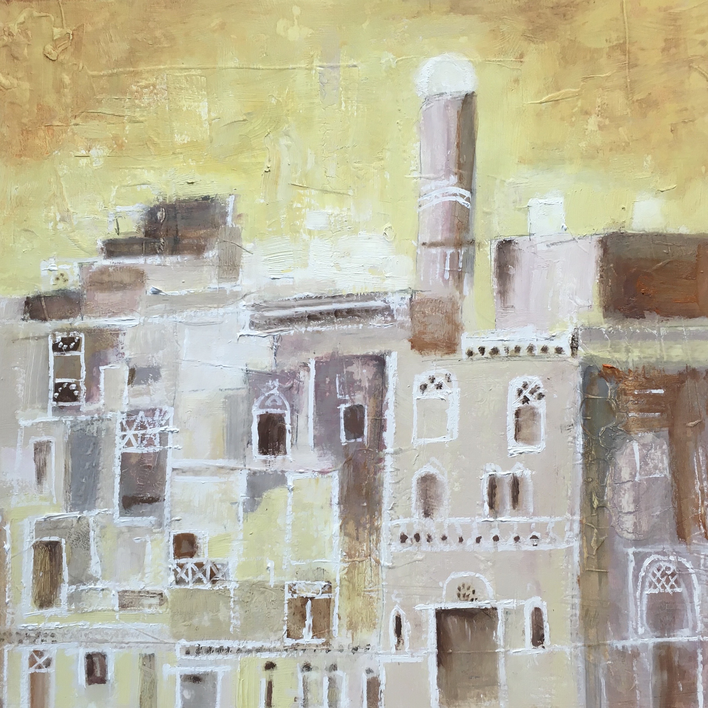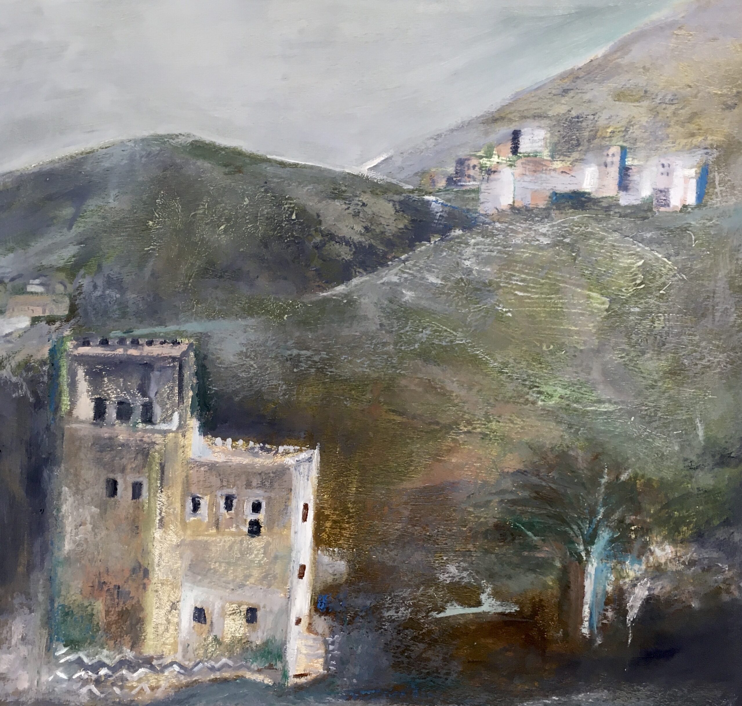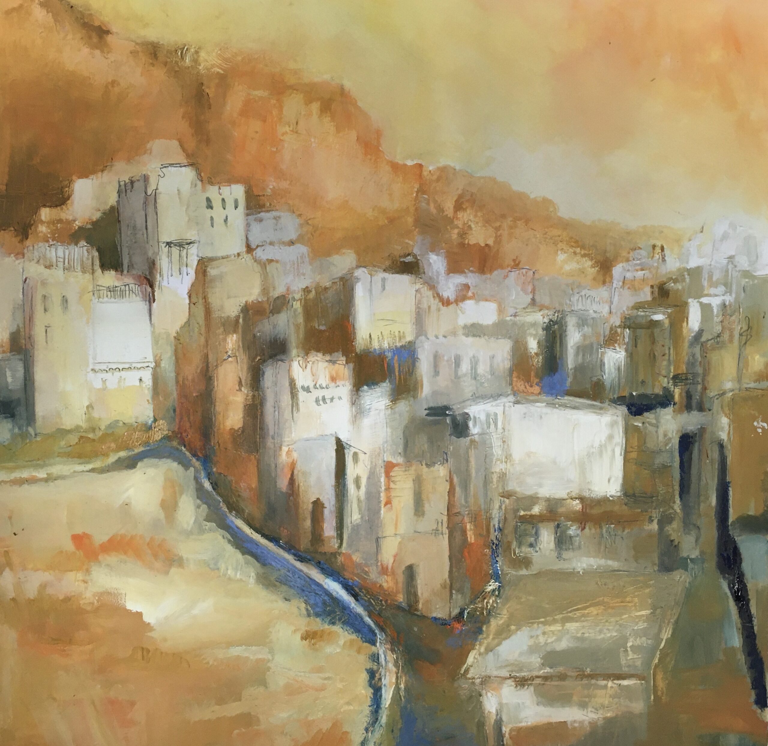 Villes et villages du Yémen, peinture à l’huile avec rehauts au pastel et collages