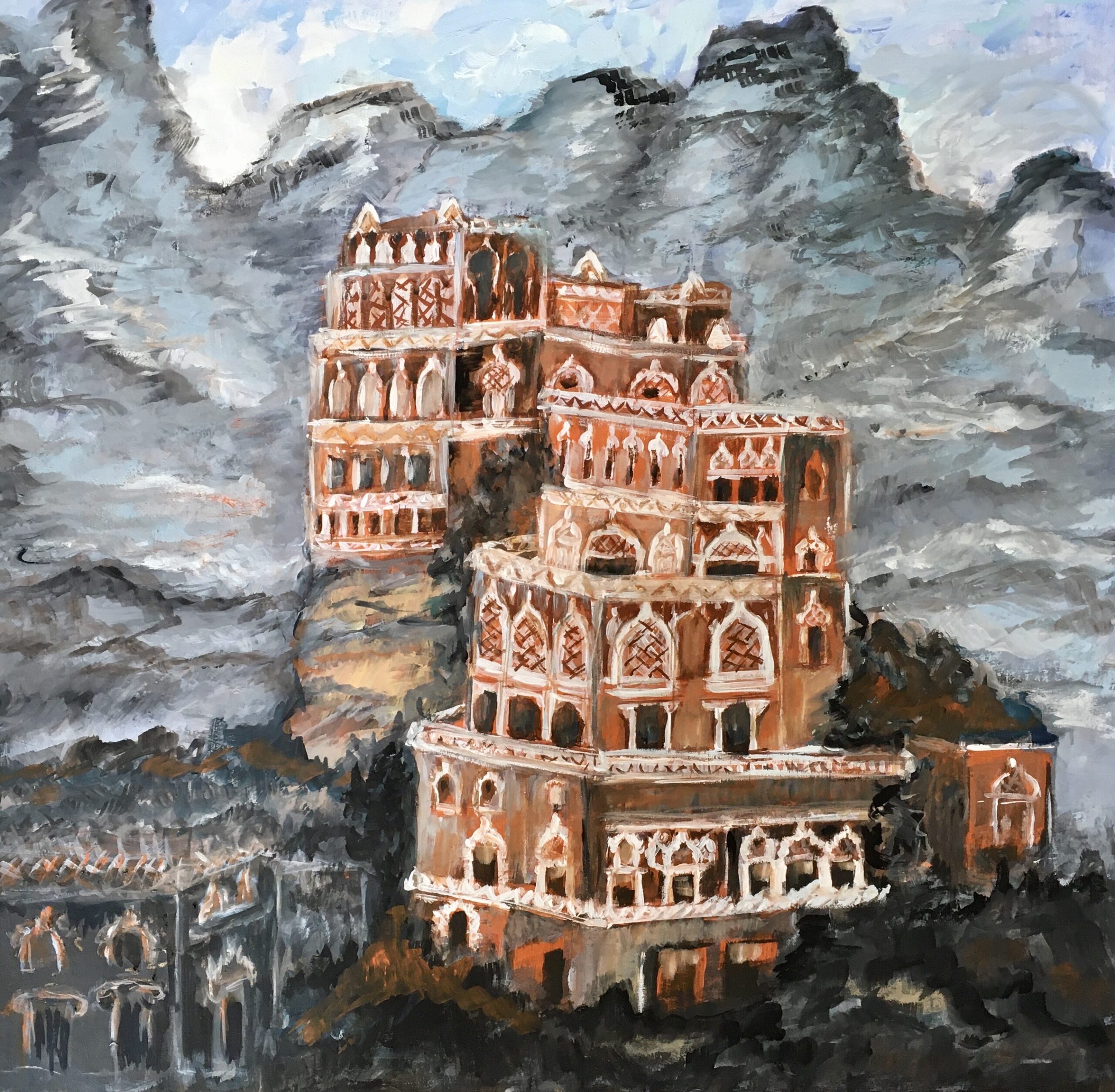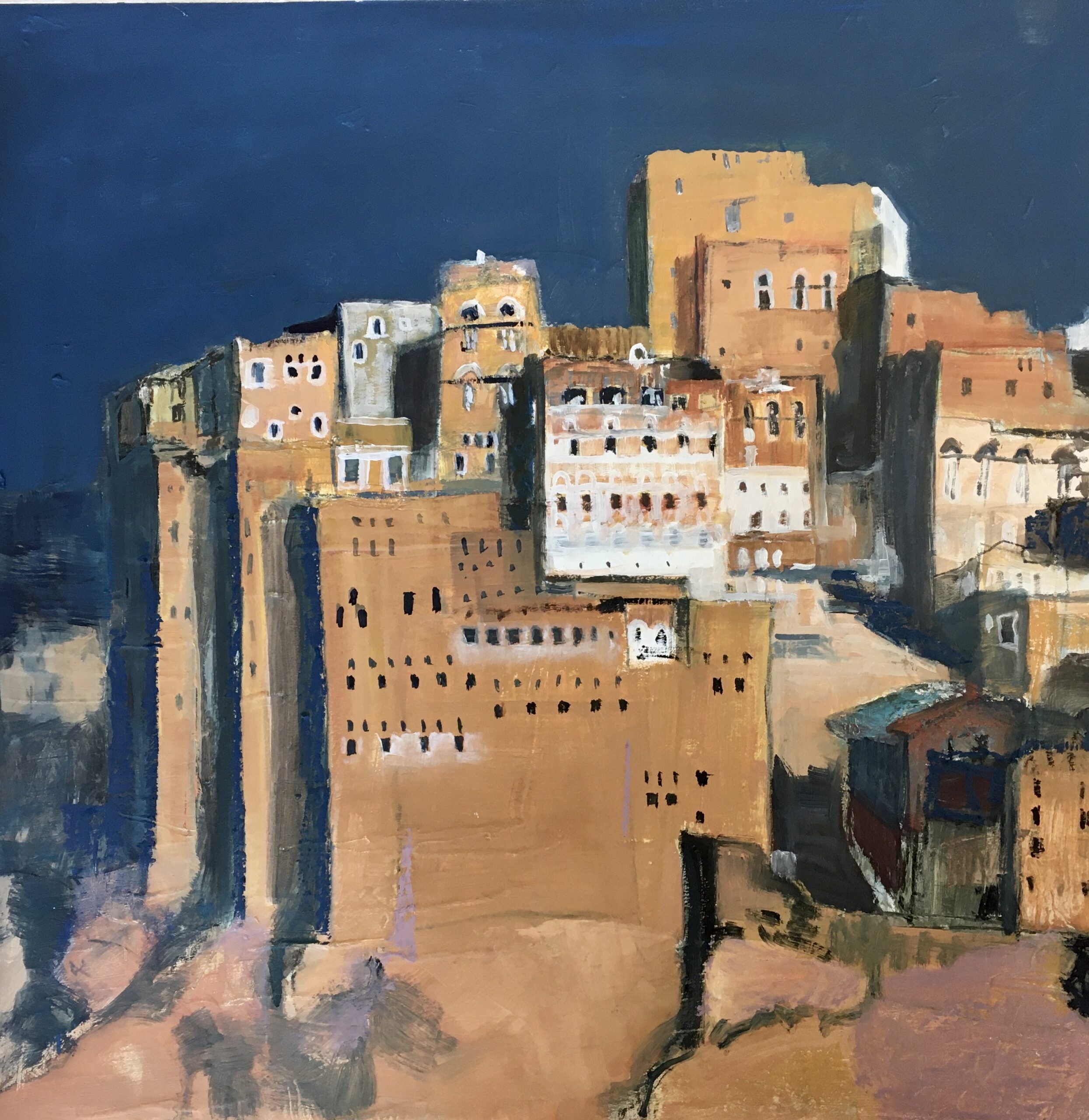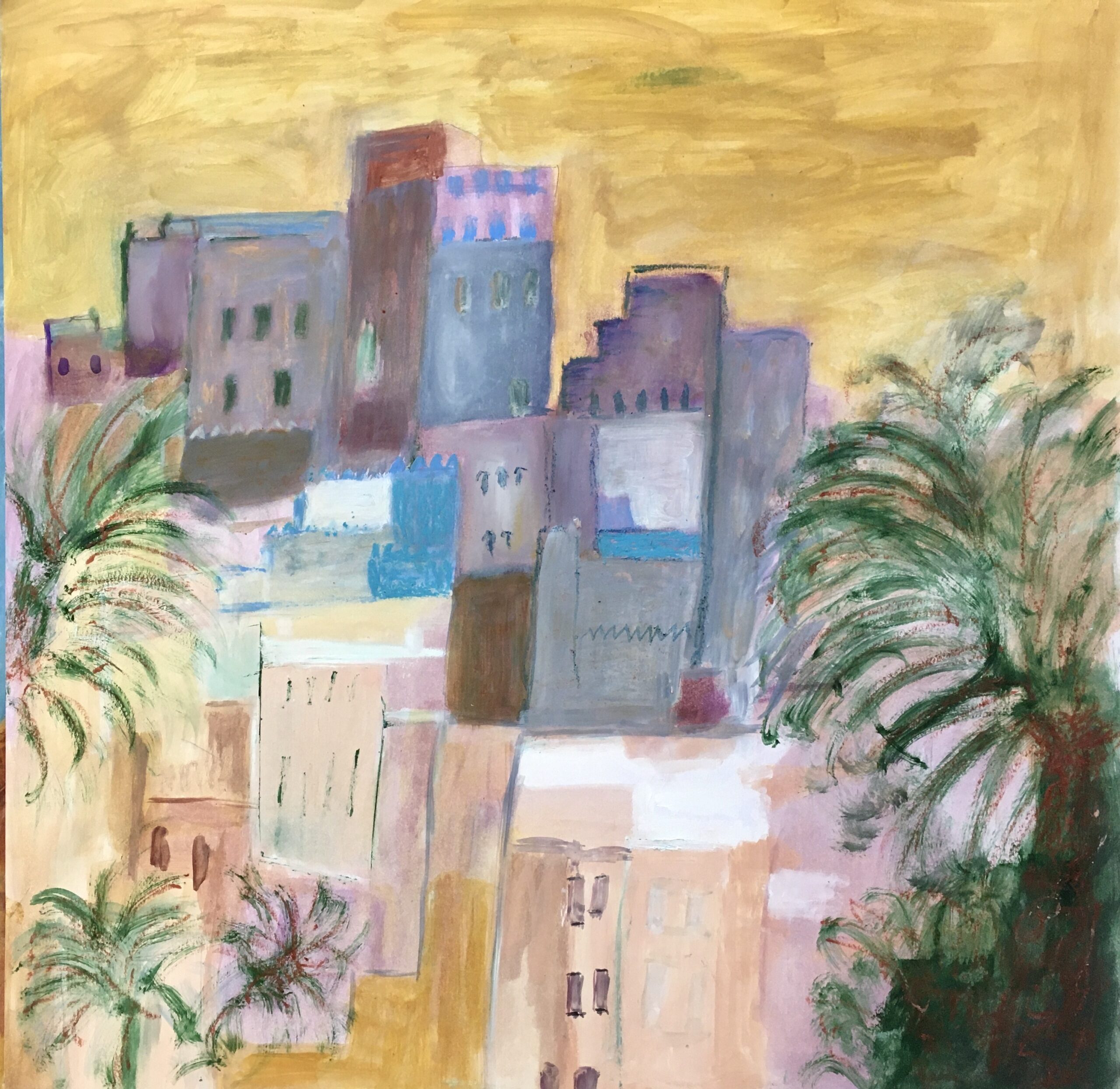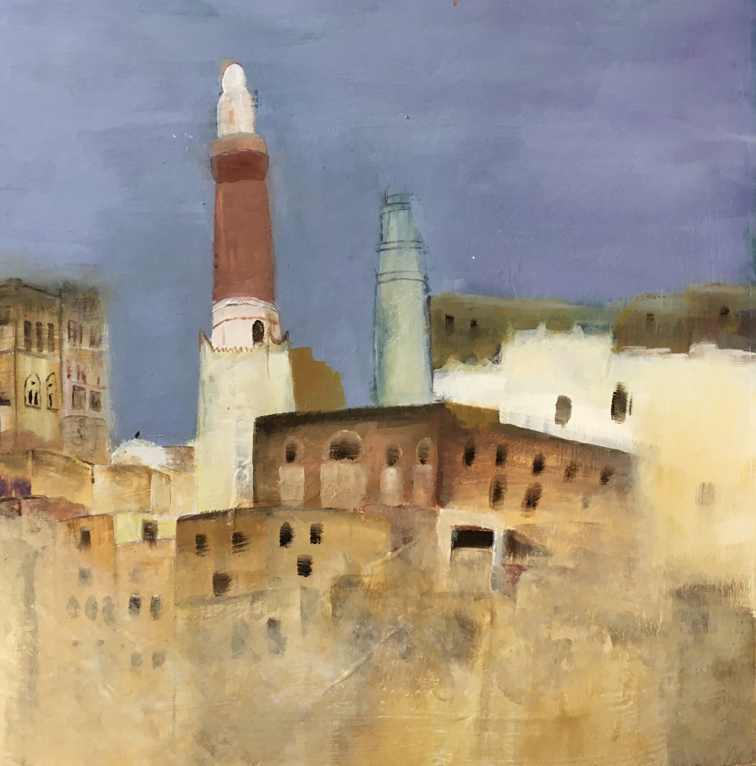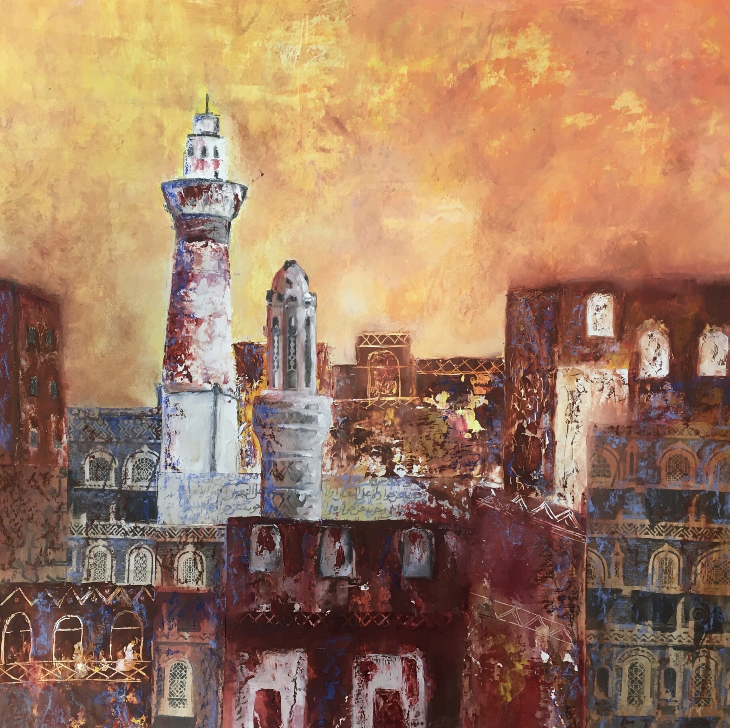 Villes et villages du Yémen, peinture à l’huile avec rehauts au pastel et collages