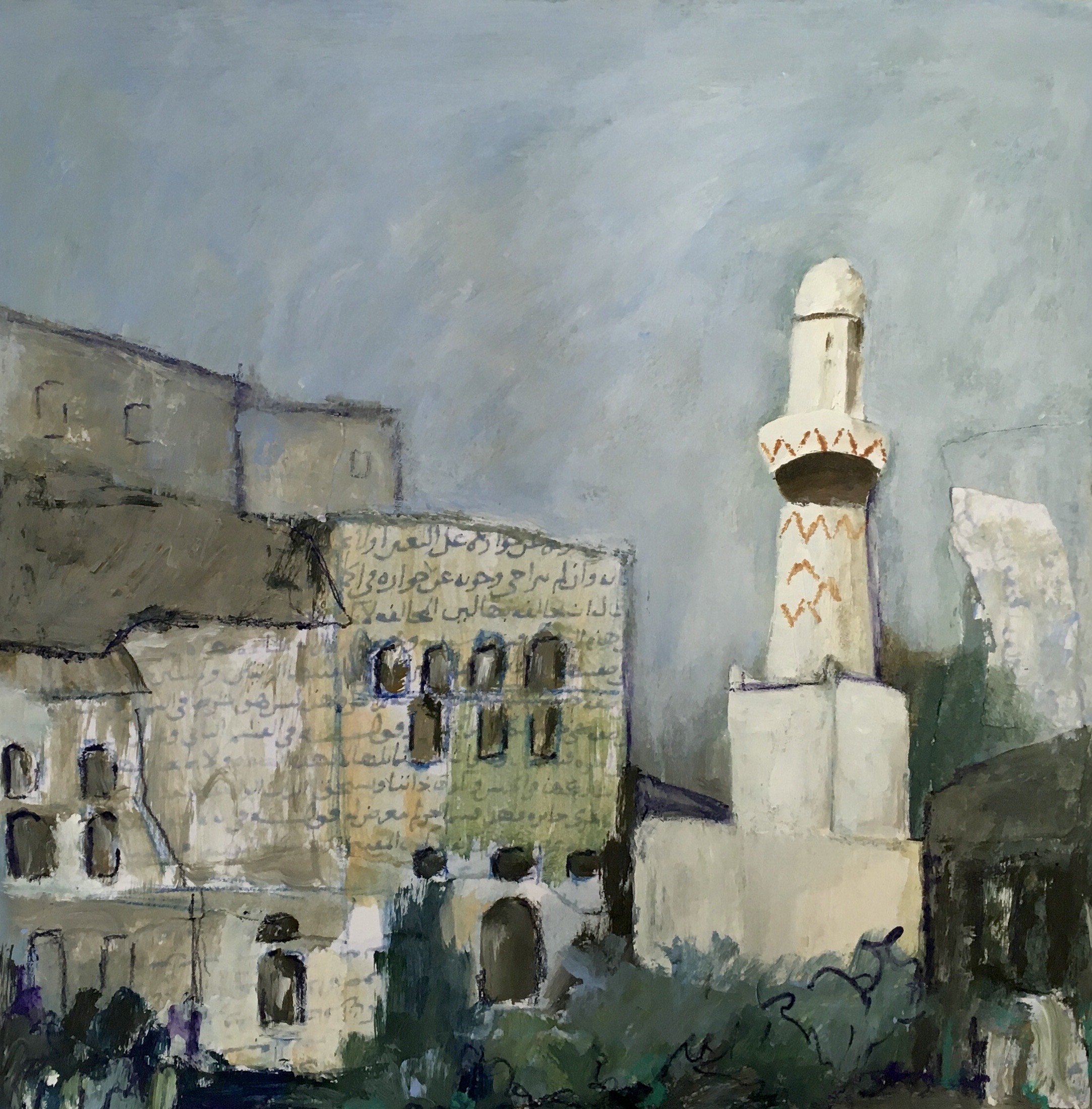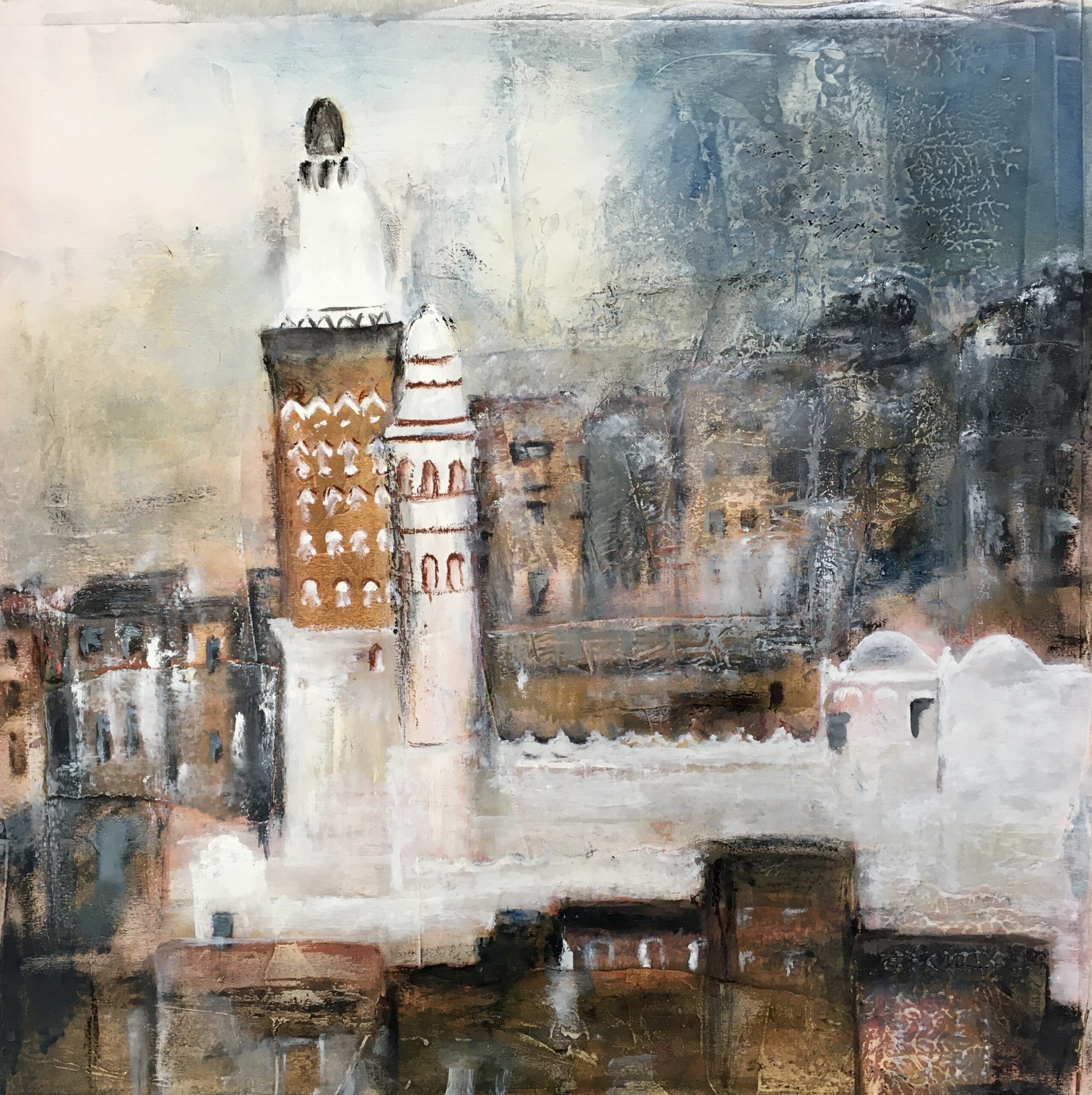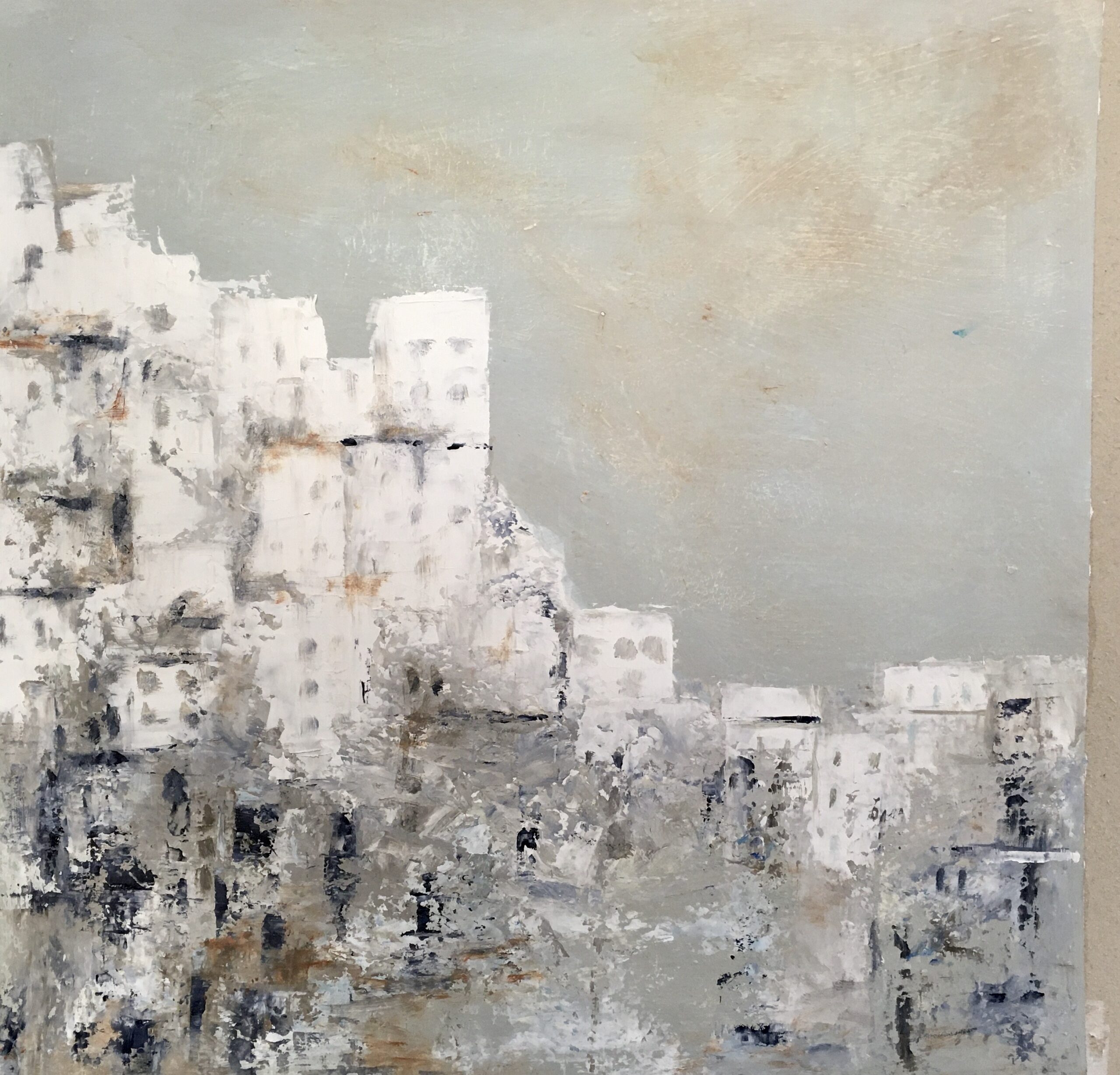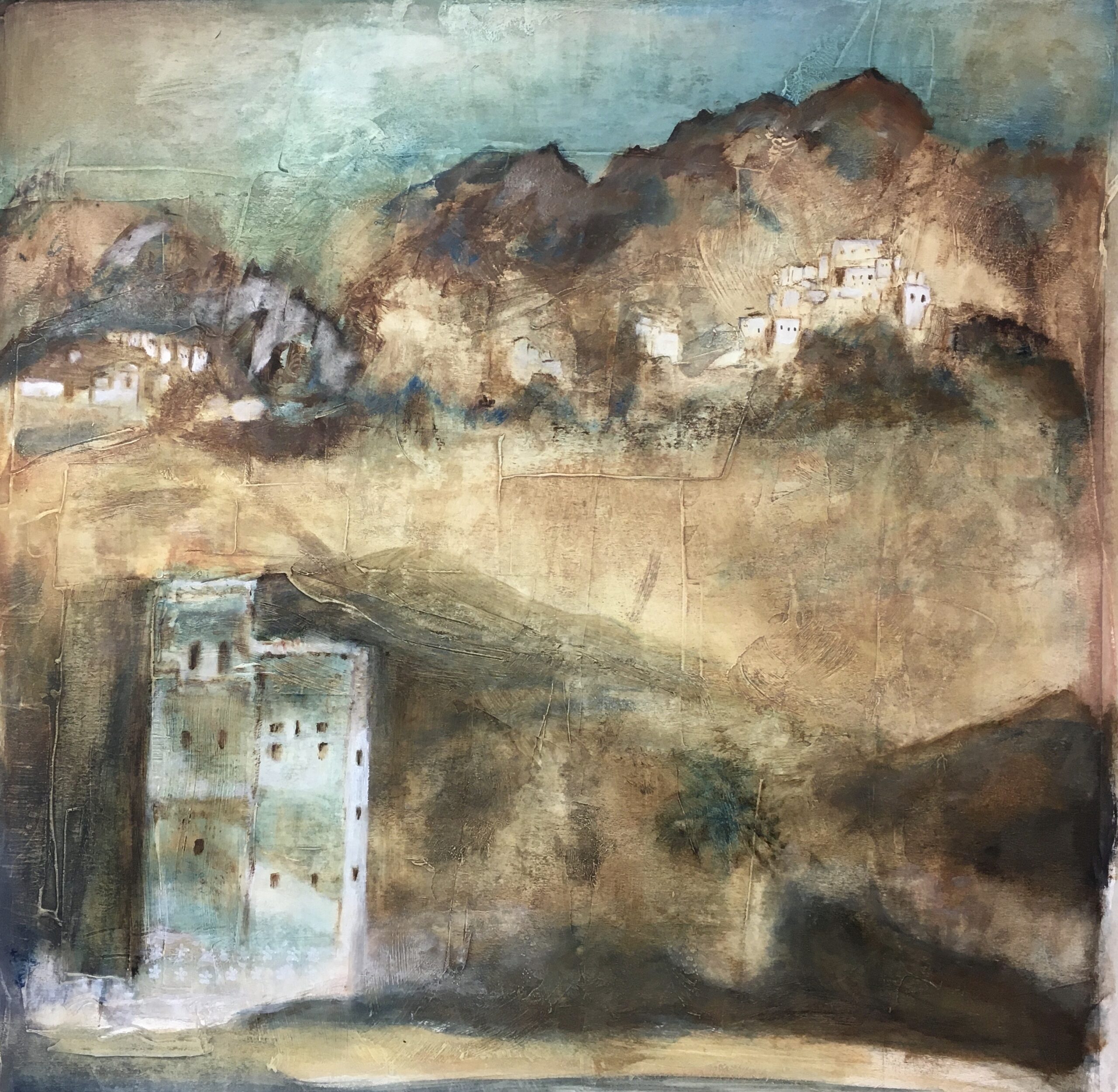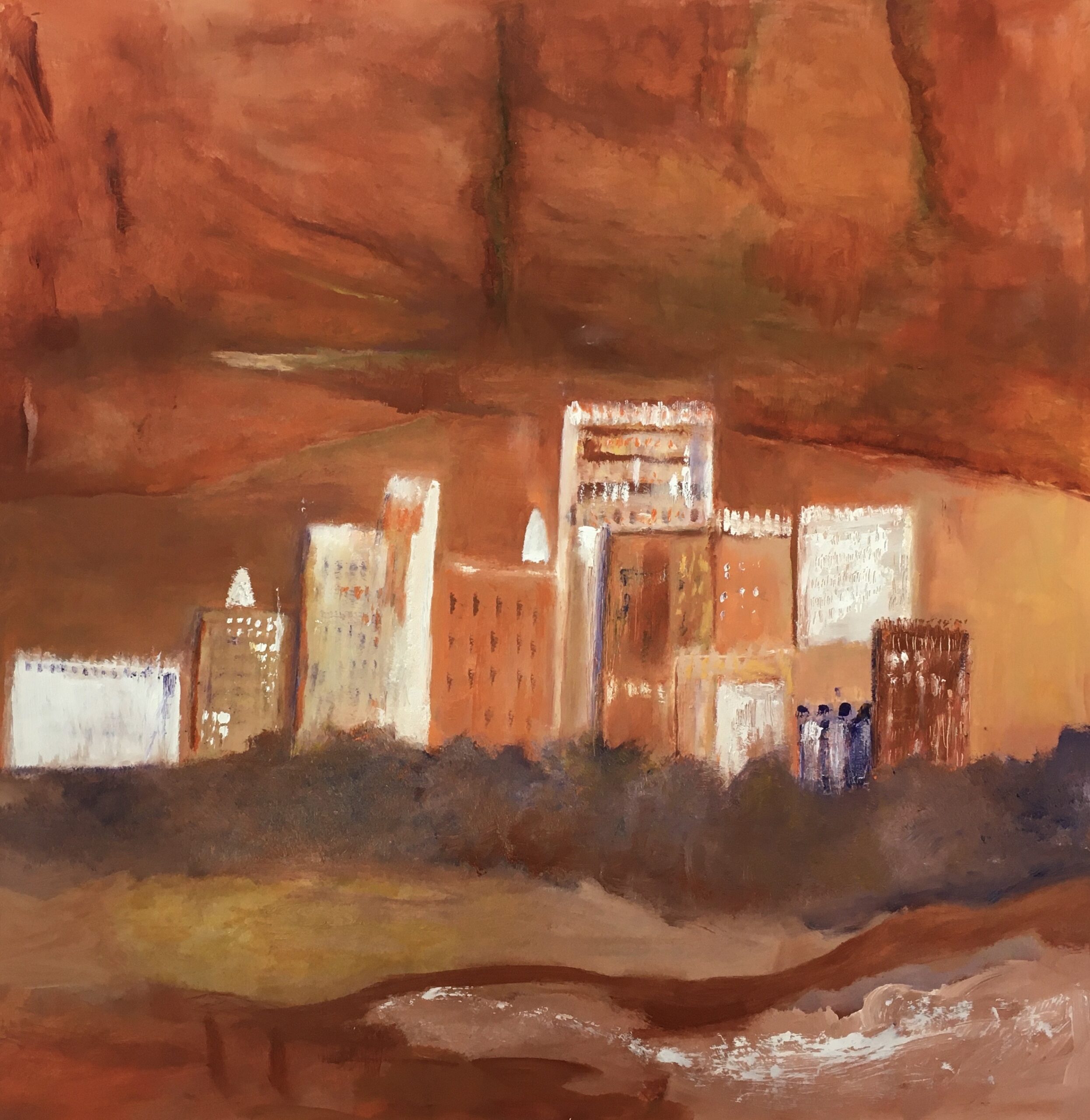Villes et villages du Yémen, peinture à l’huile avec rehauts au pastel et collages