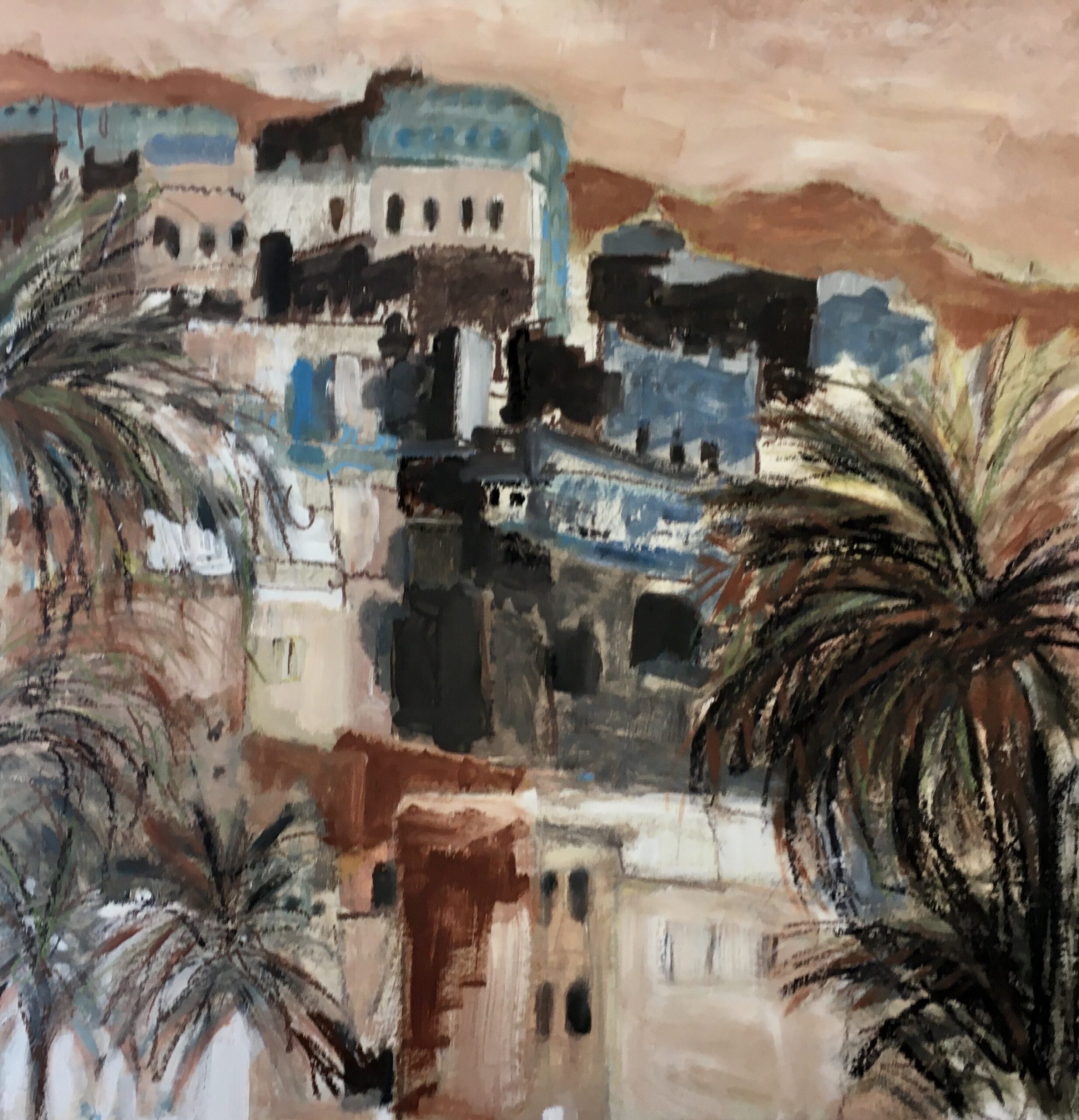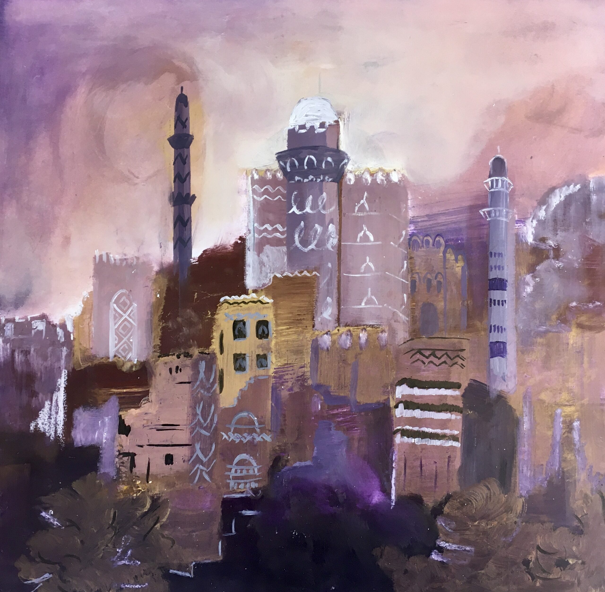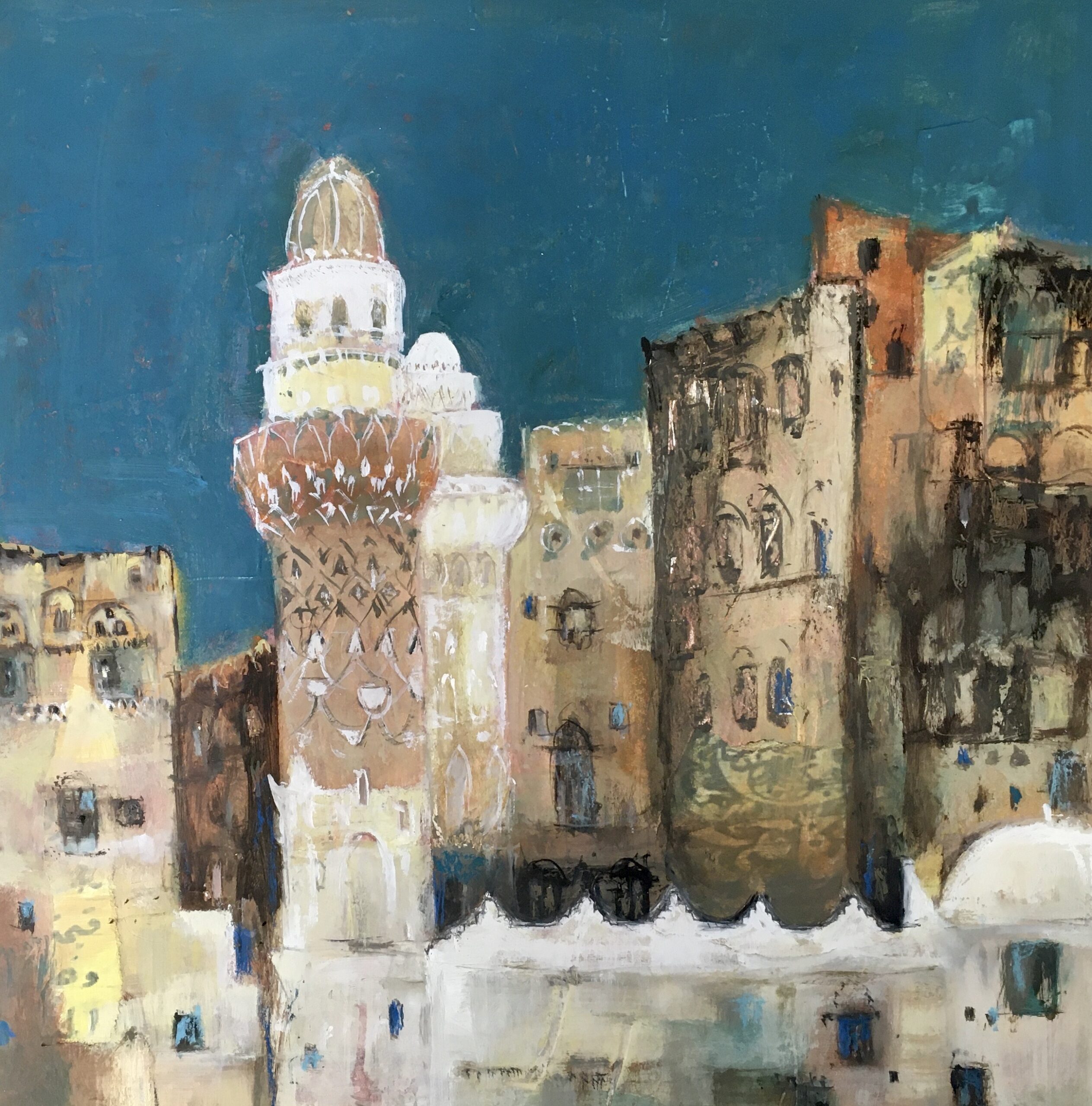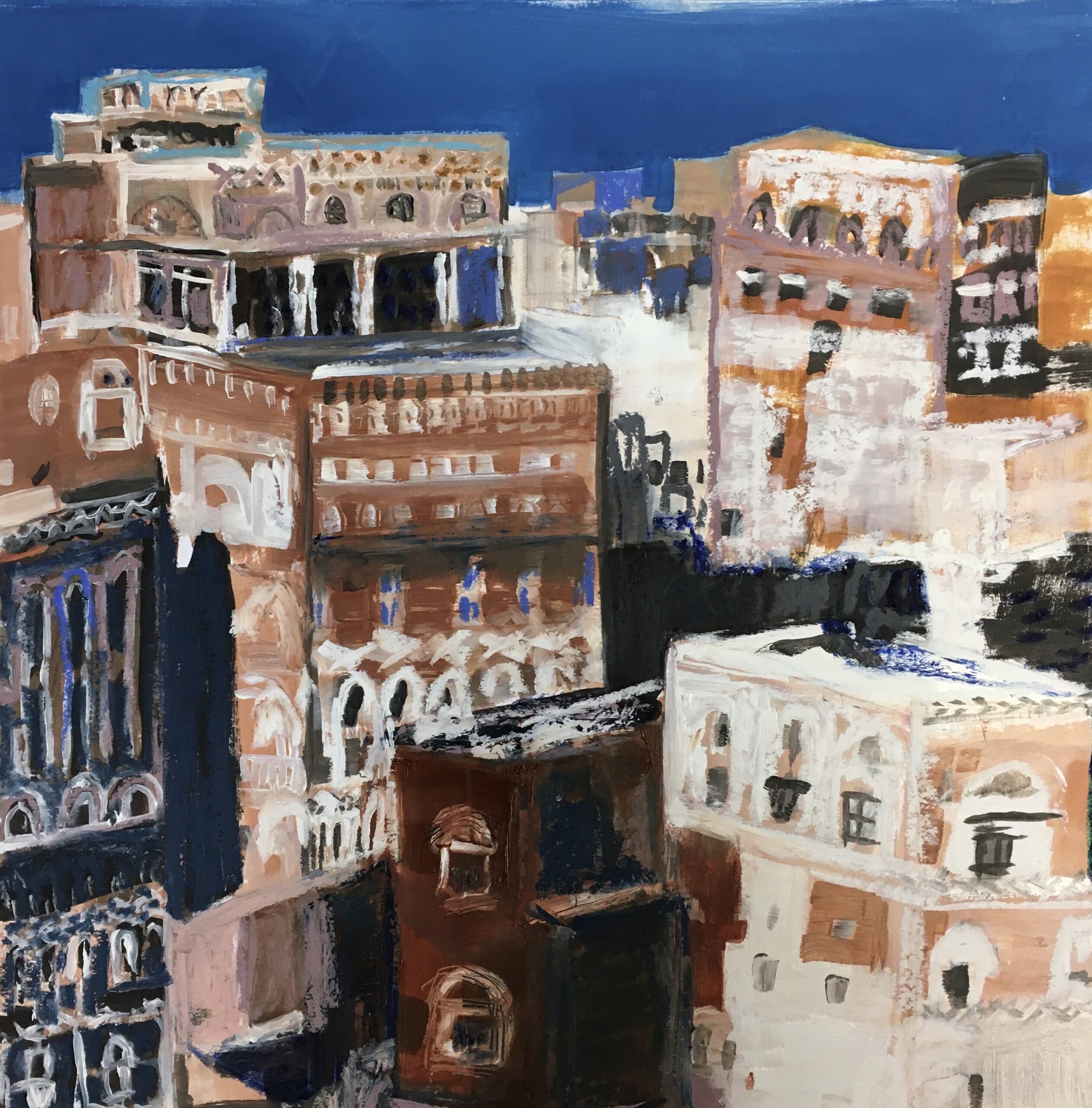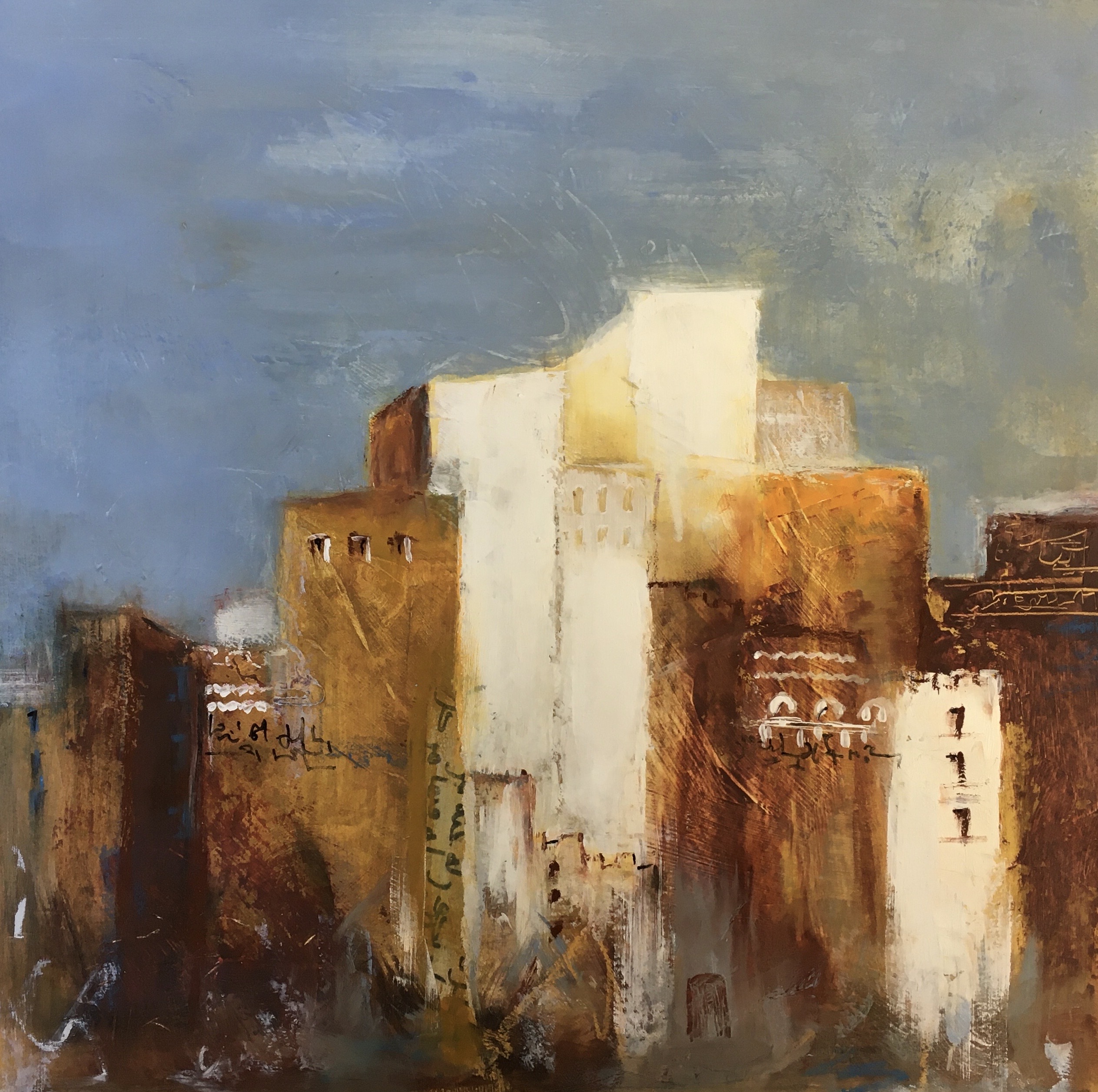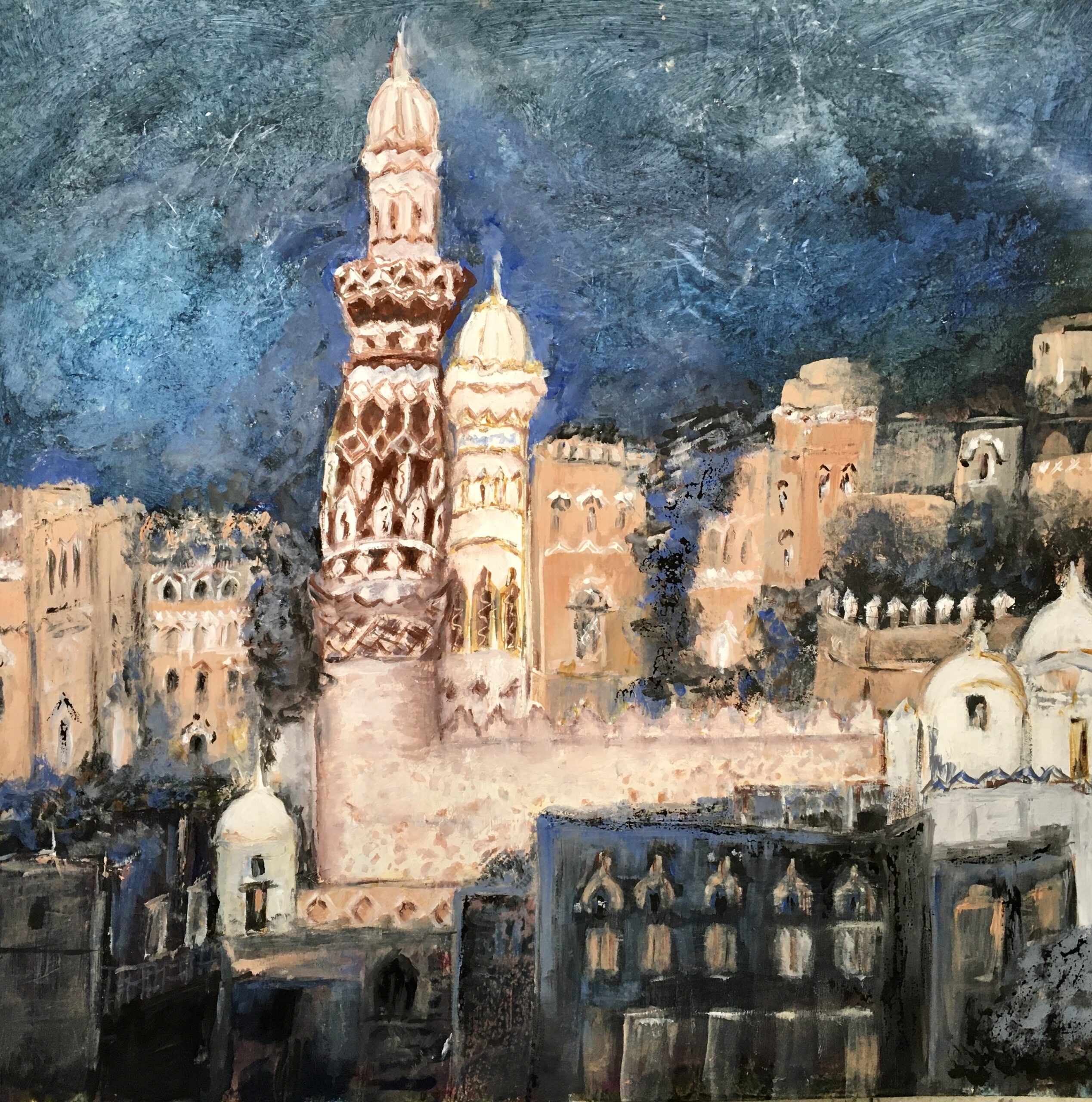 Villes et villages du Yémen, peinture à l’huile avec rehauts au pastel et collages