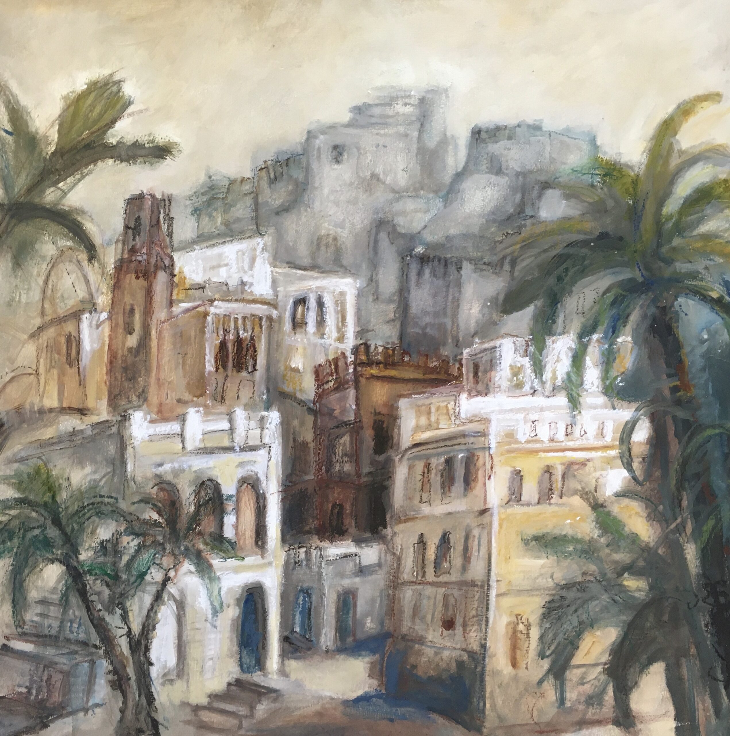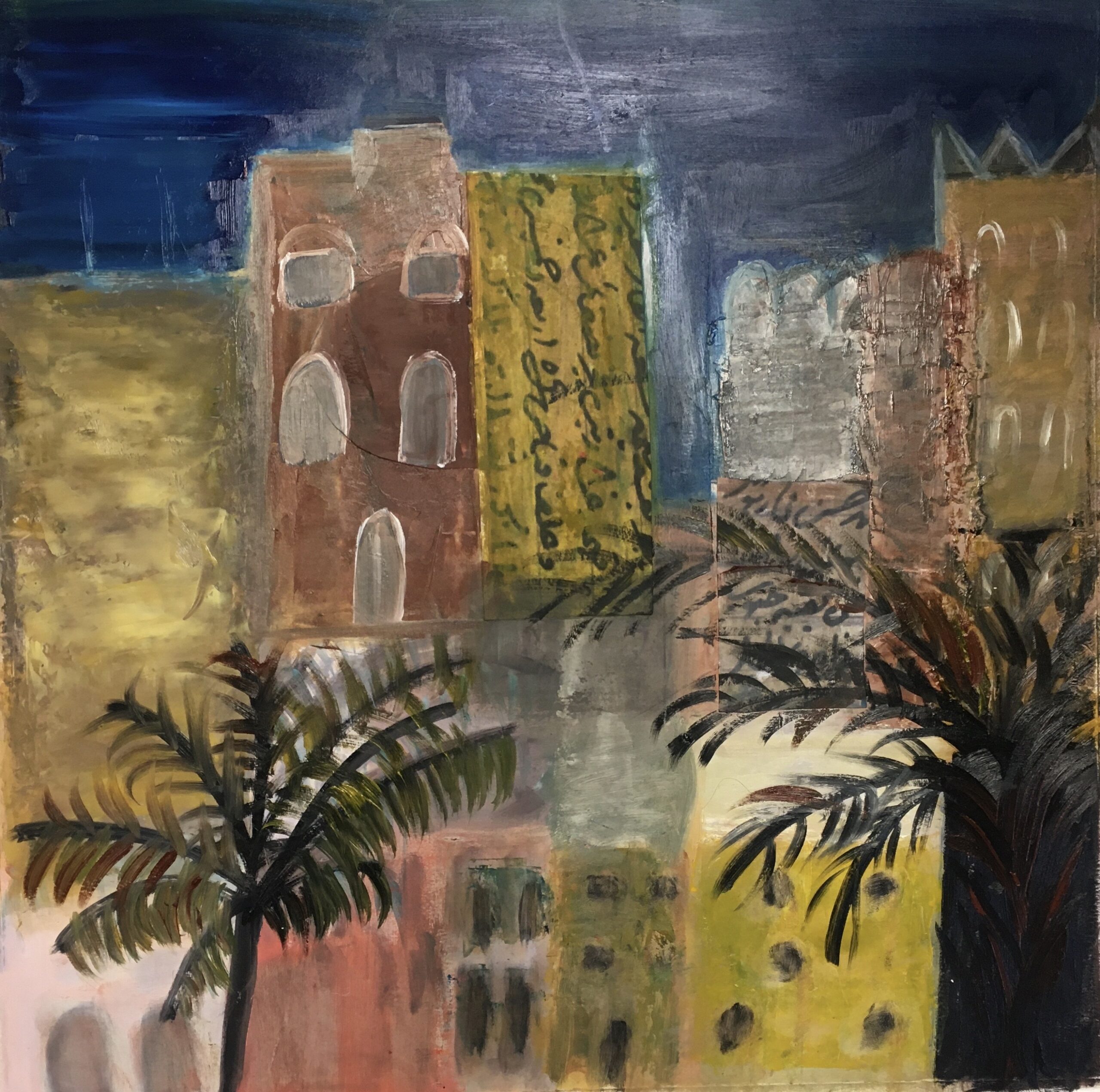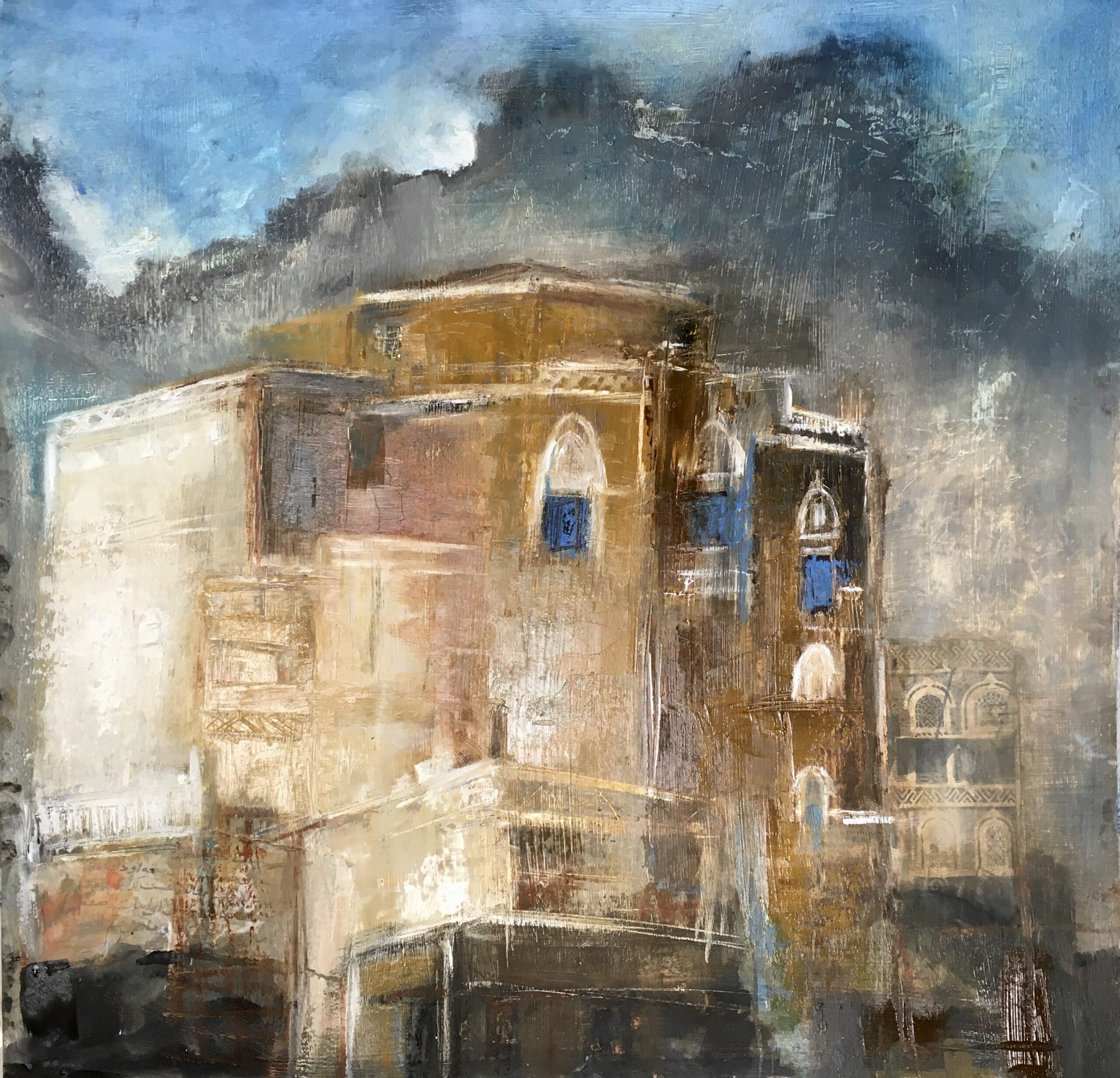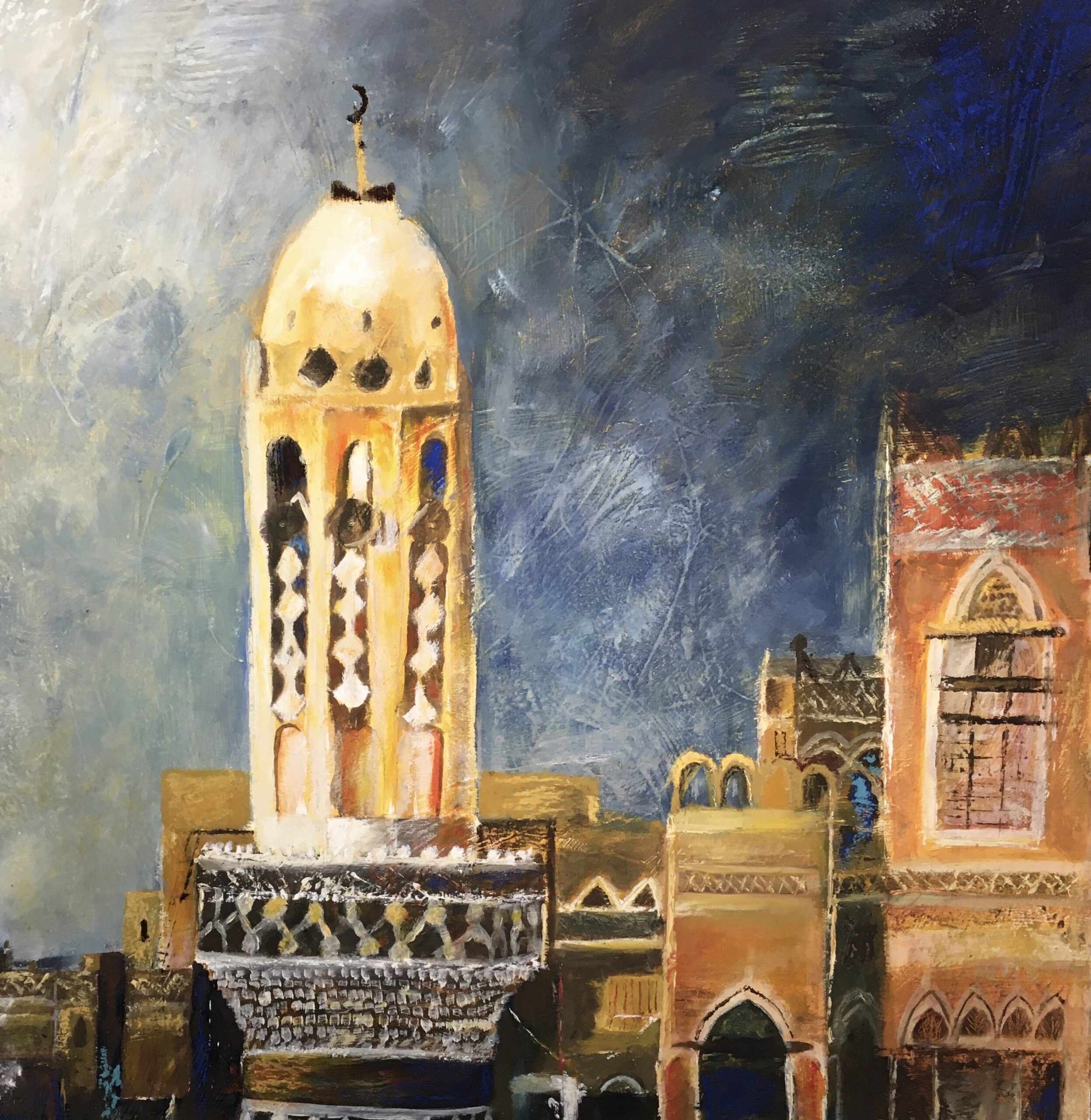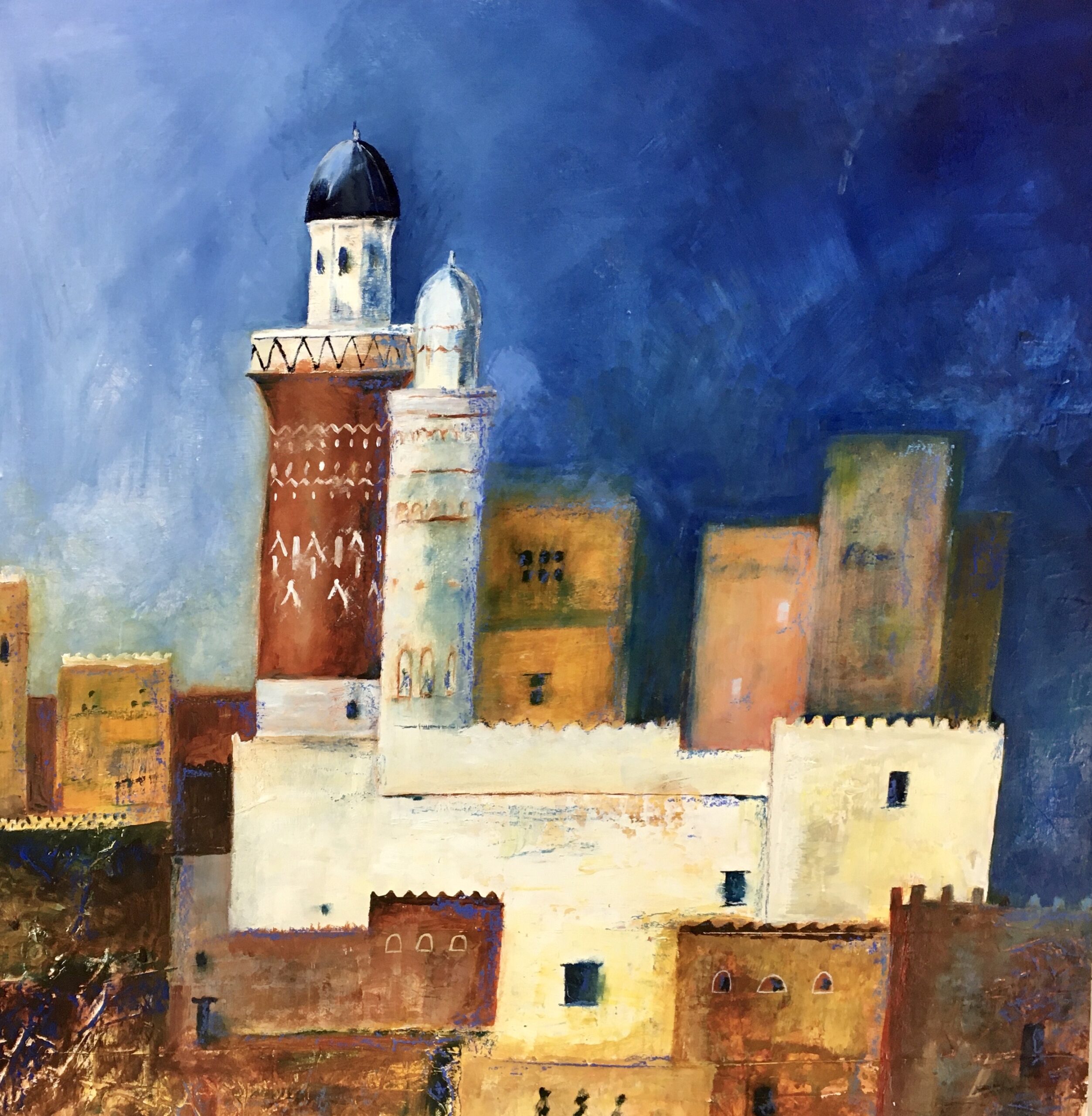 Villes et villages du Yémen, peinture à l’huile avec rehauts au pastel et collages