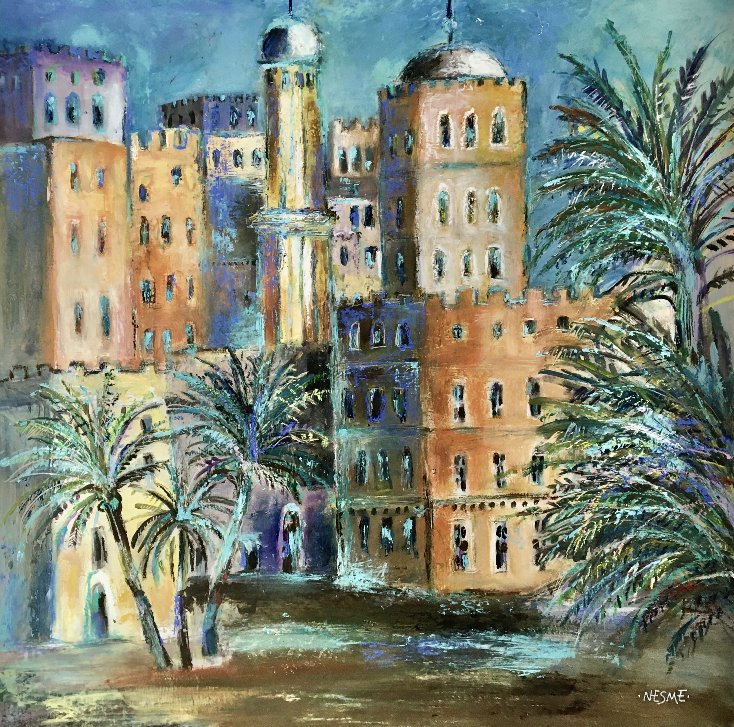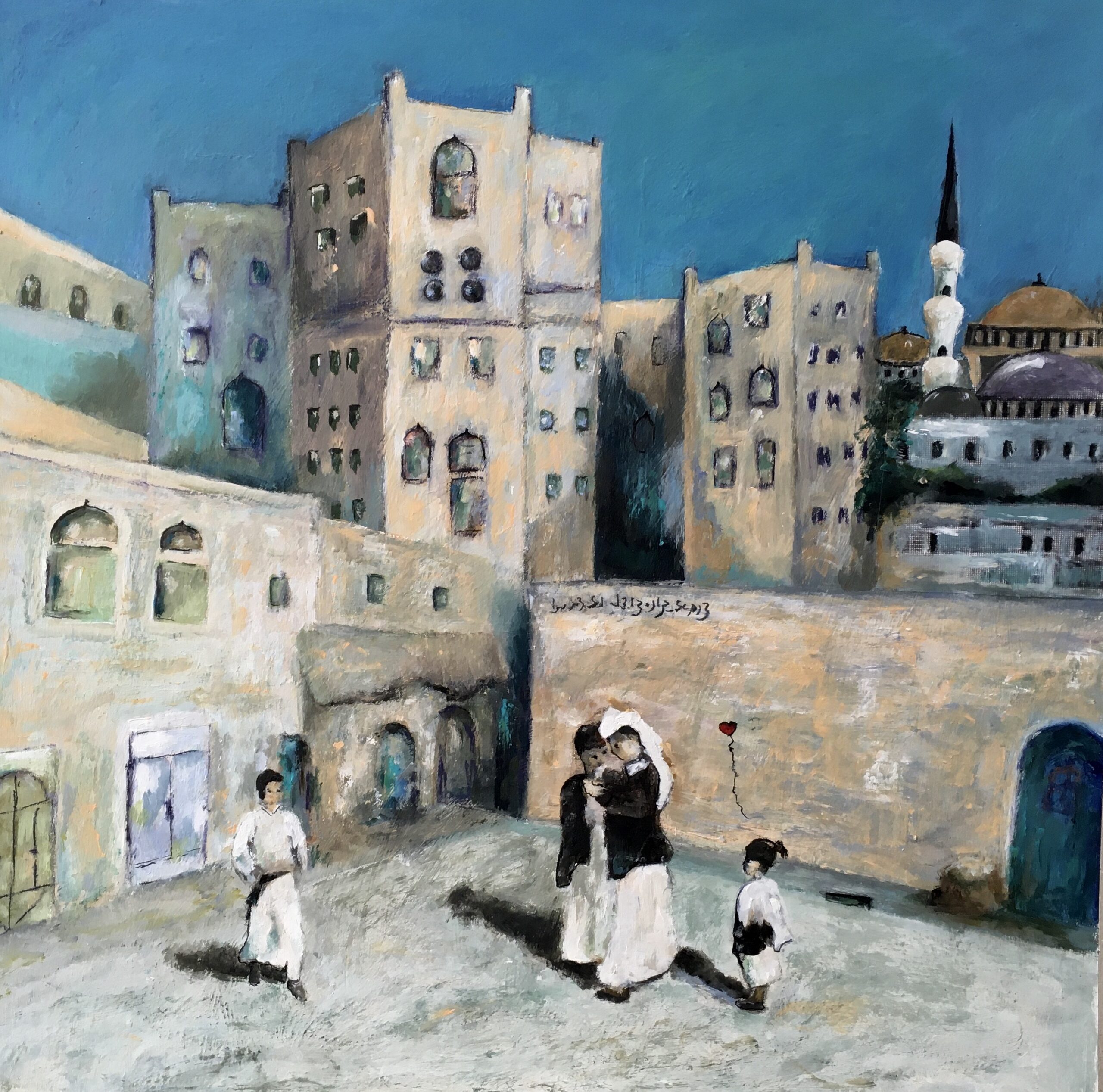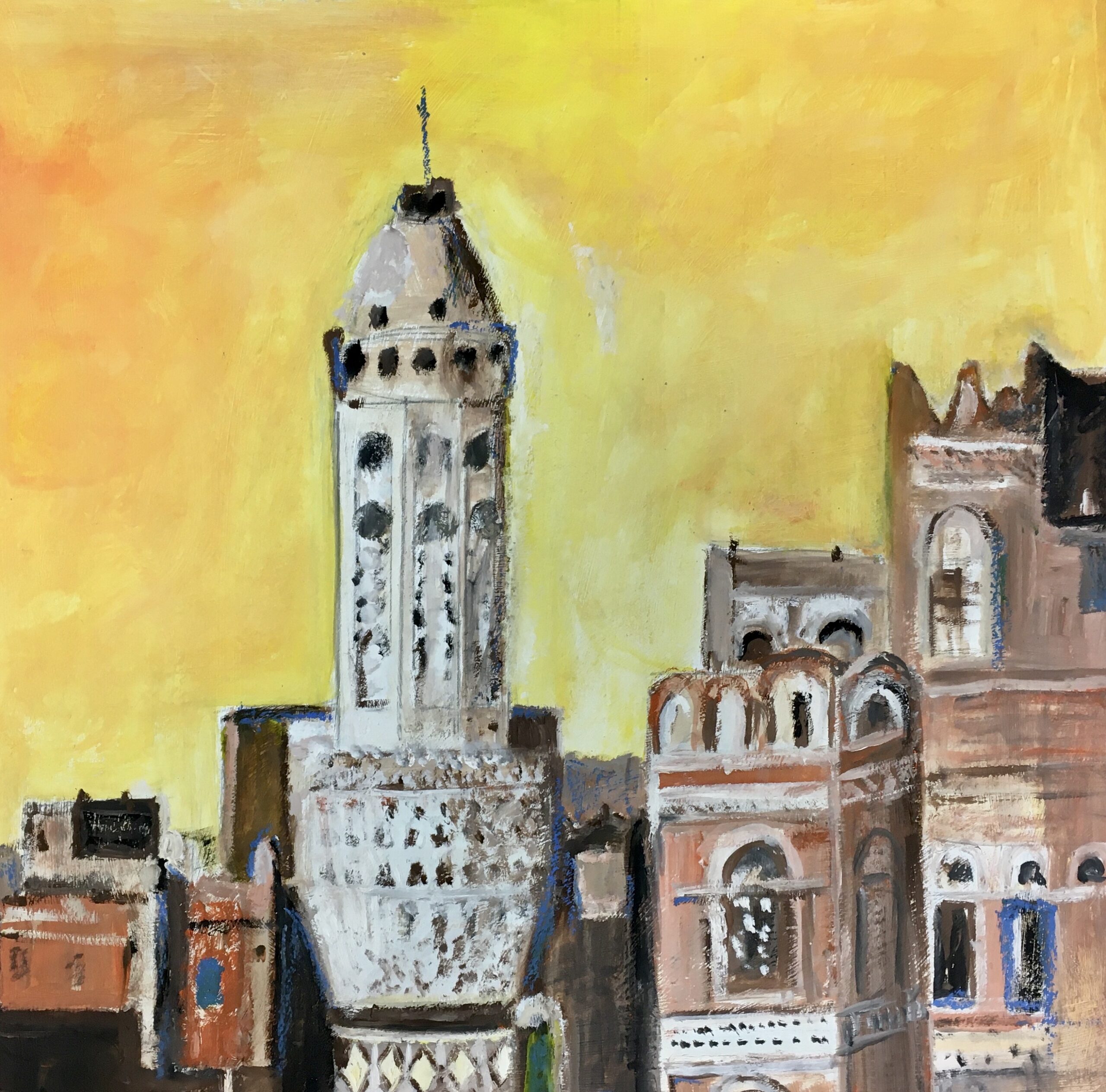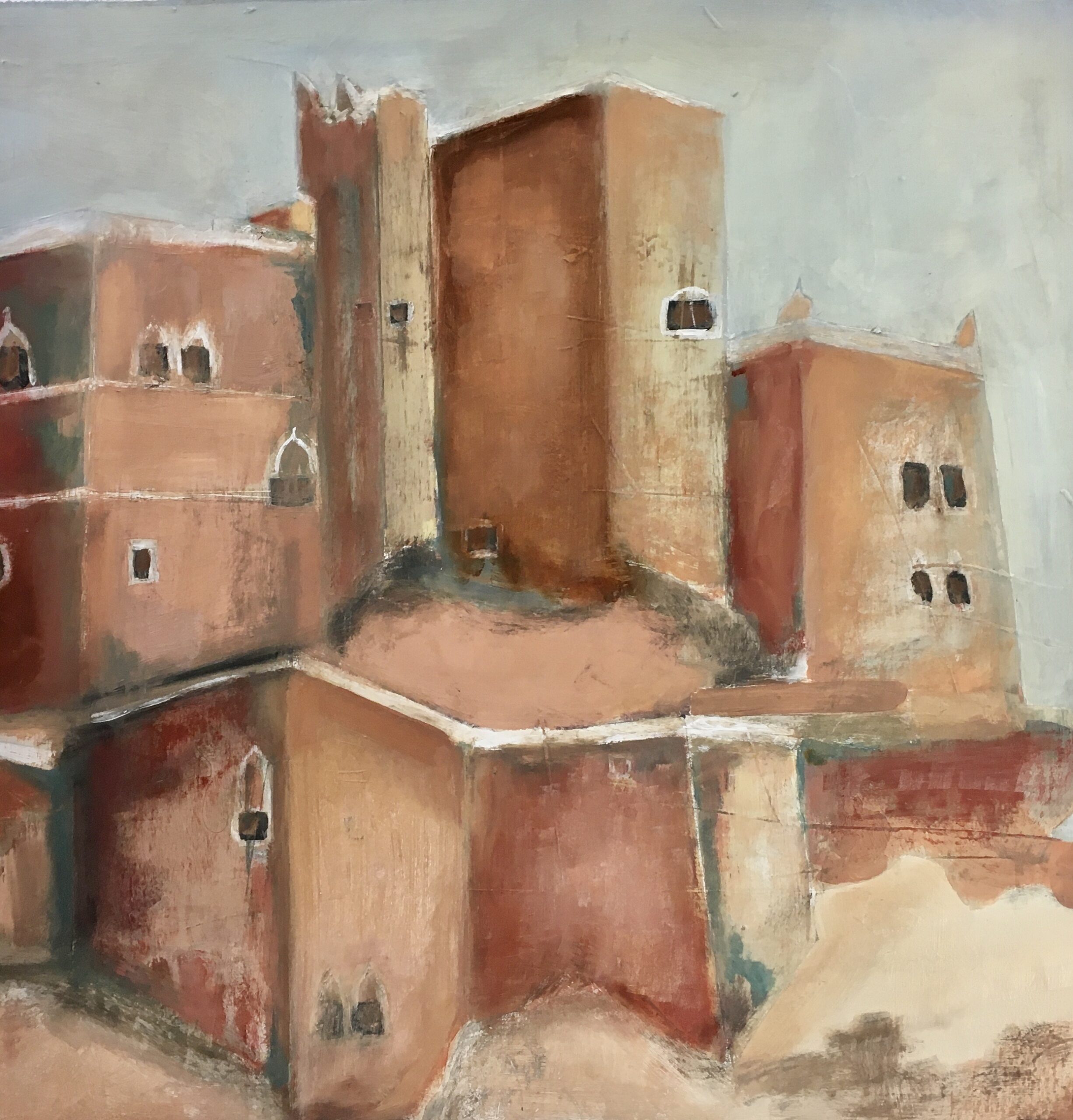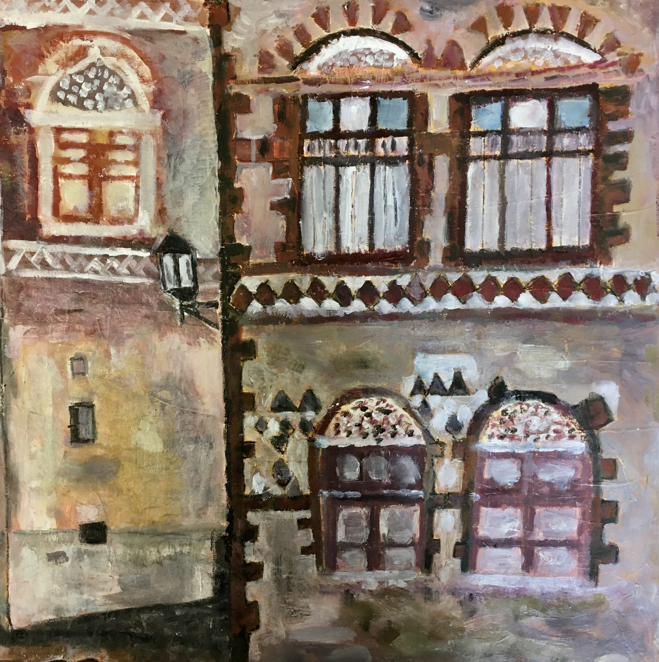 Villes et villages du Yémen, peinture à l’huile avec rehauts au pastel et collages