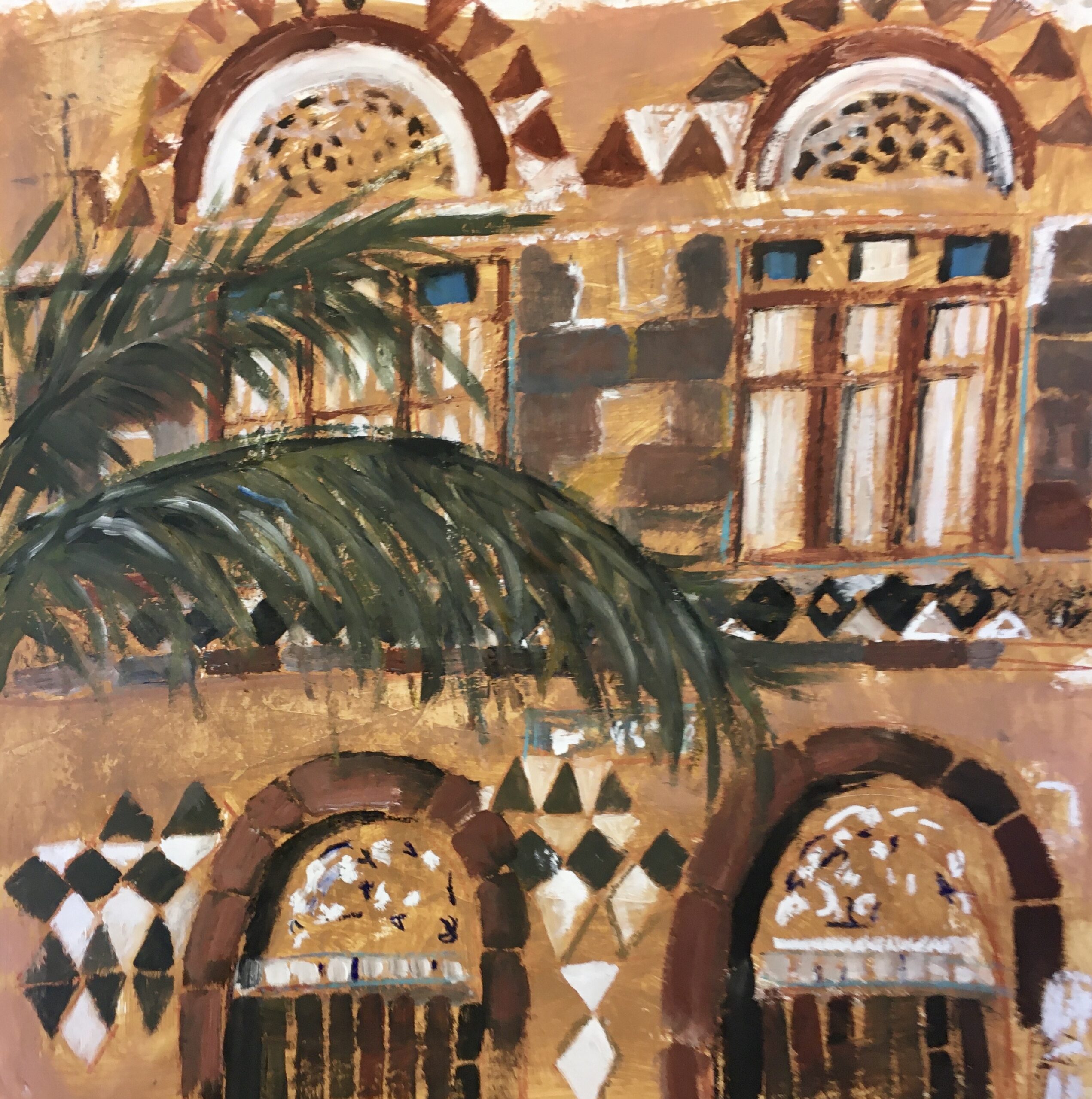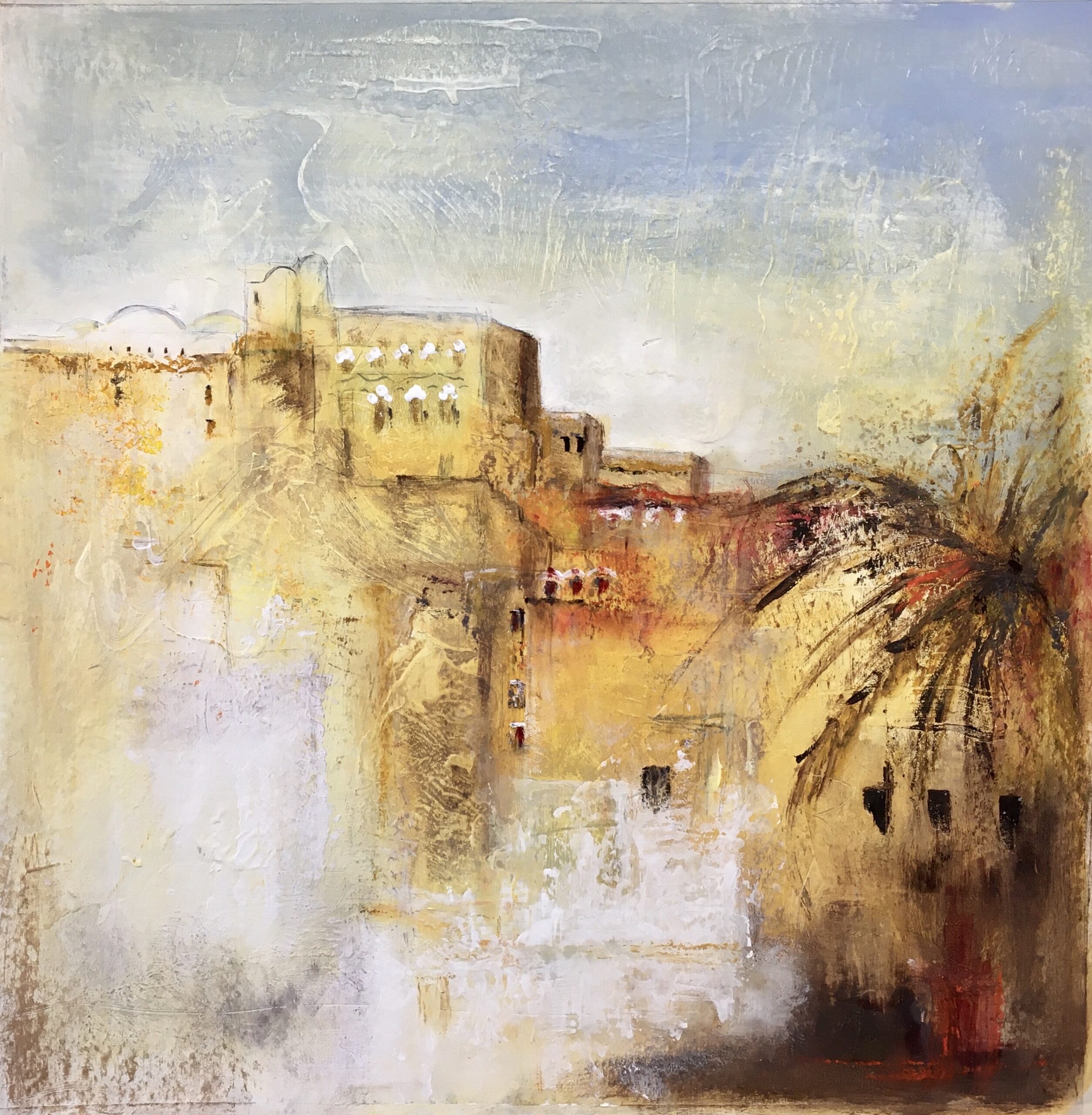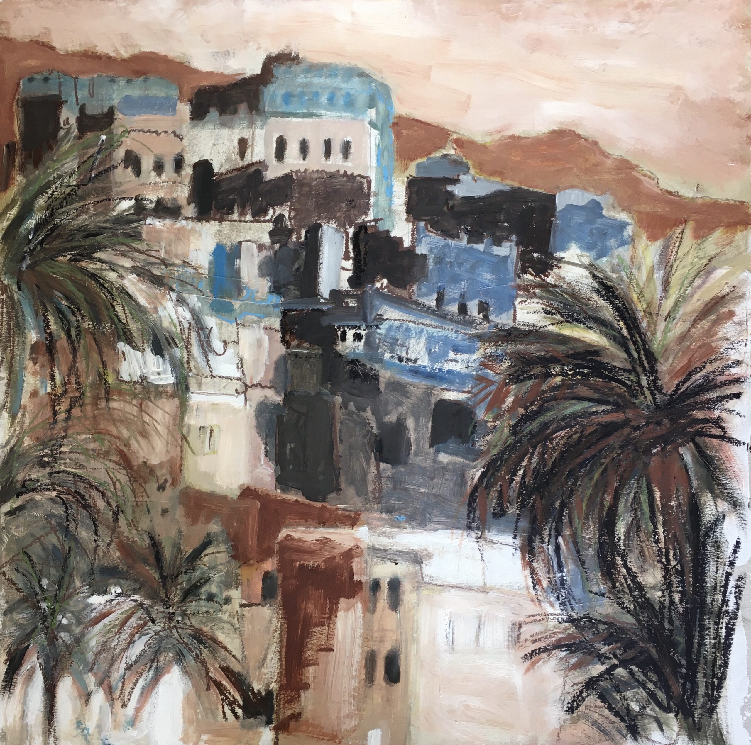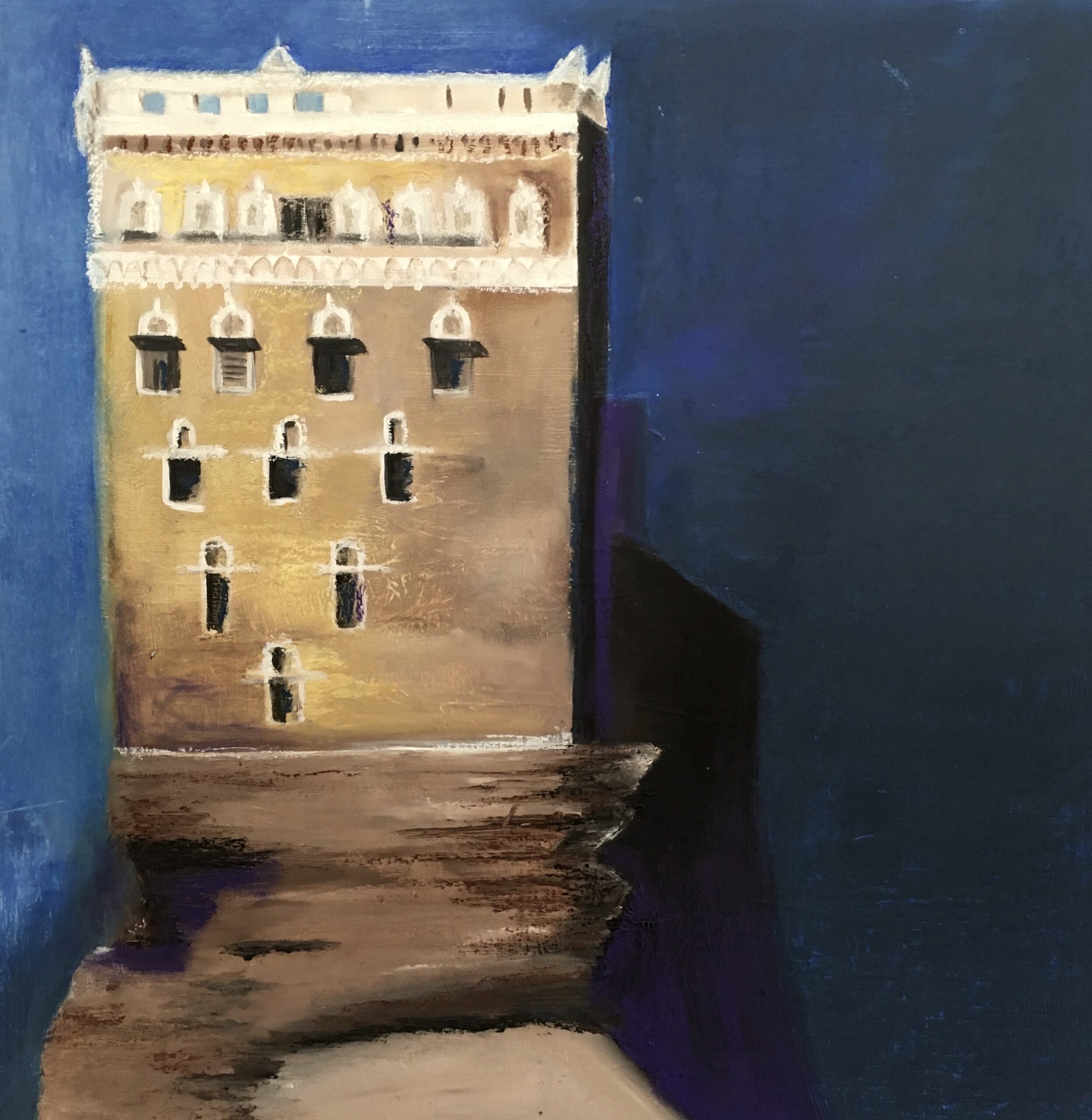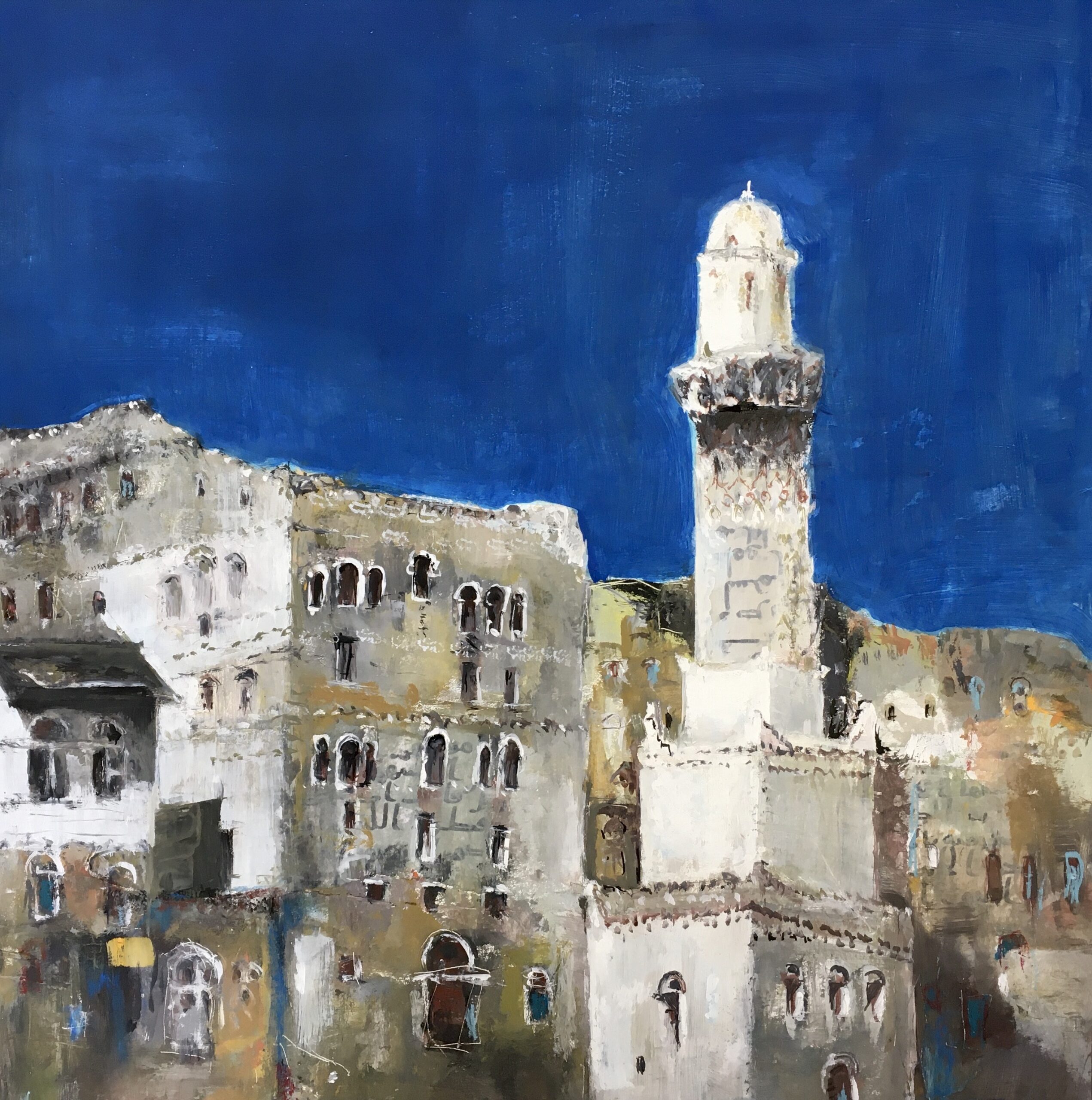 Villes et villages du Yémen, peinture à l’huile avec rehauts au pastel et collages