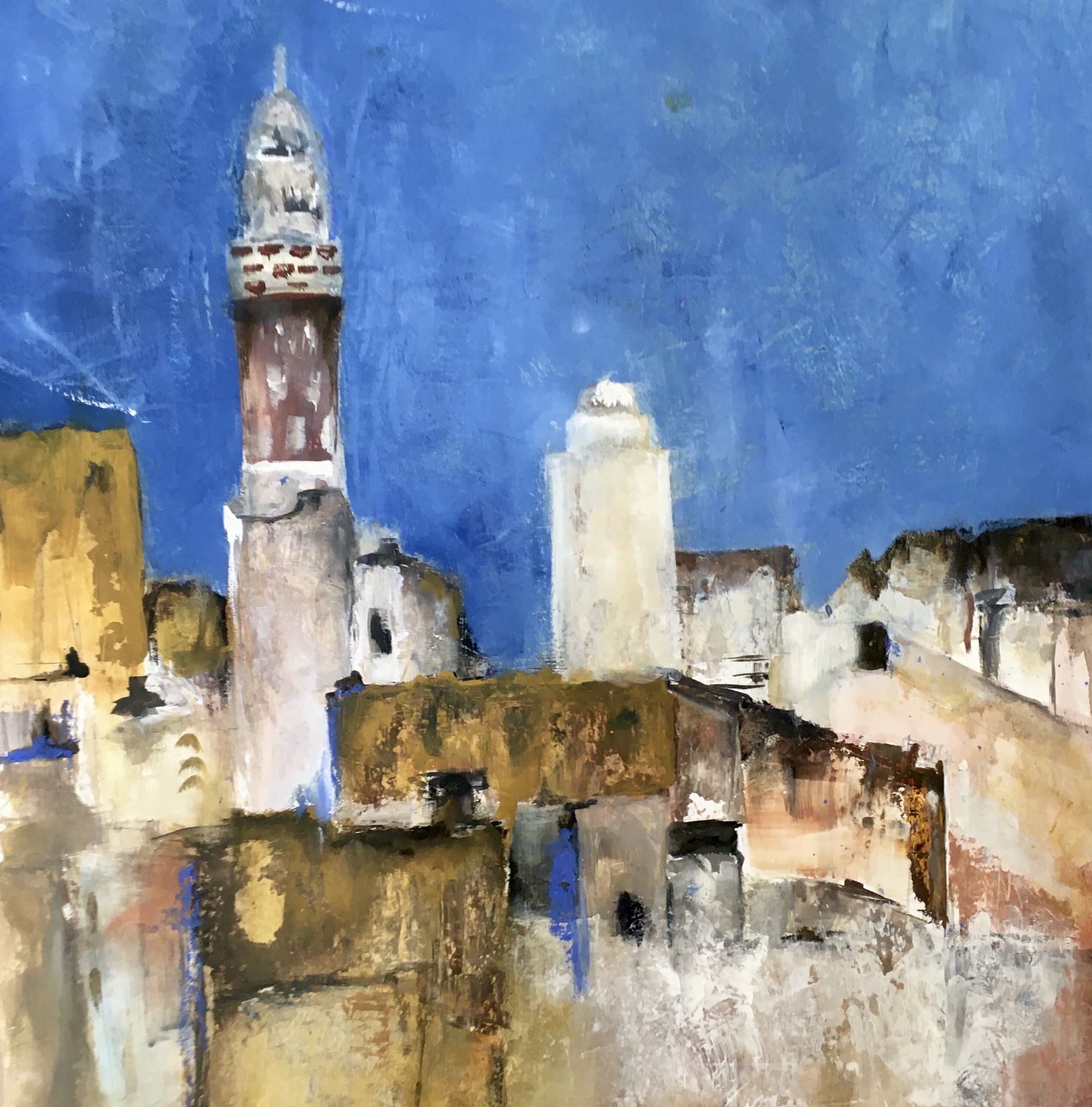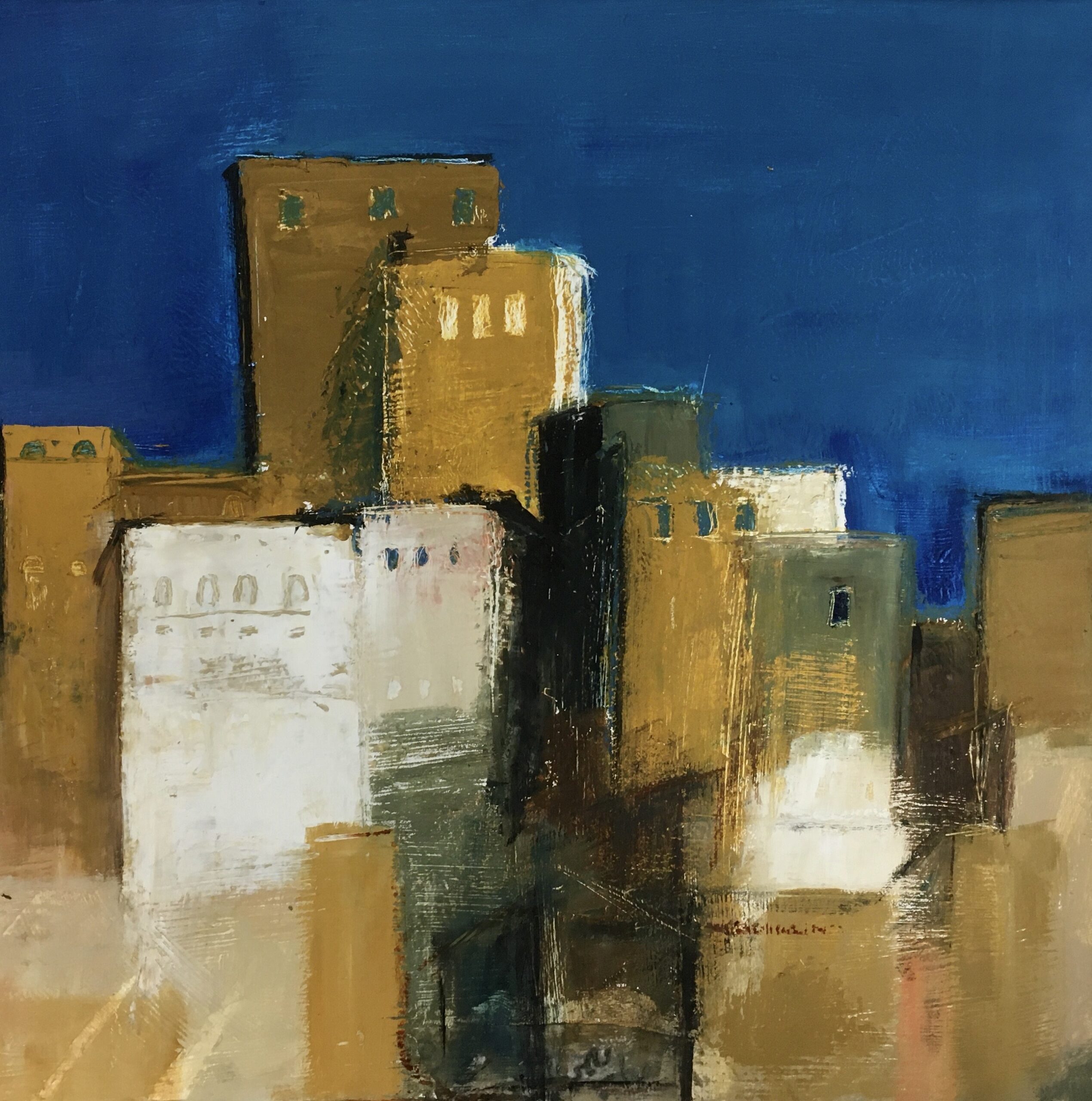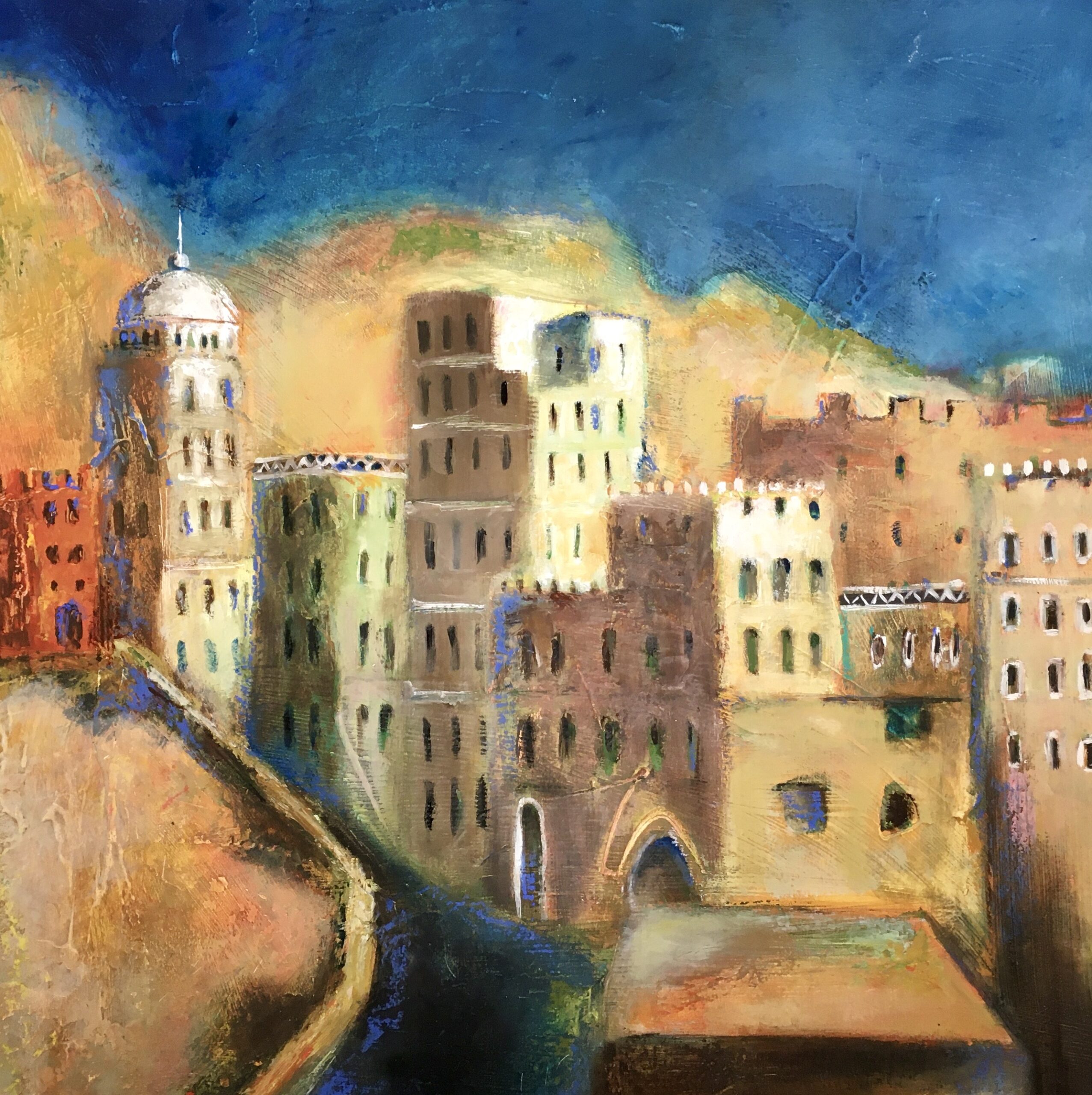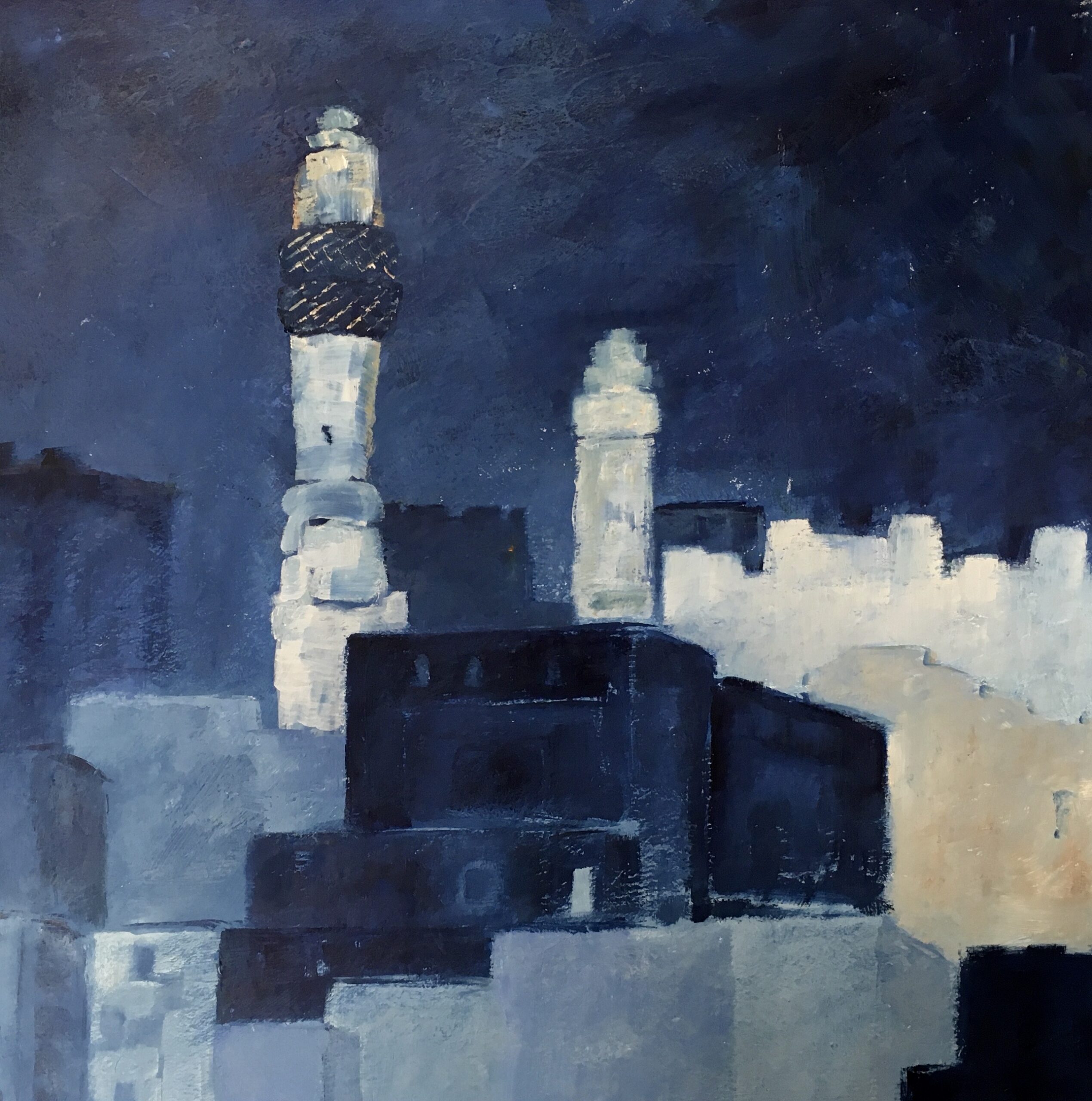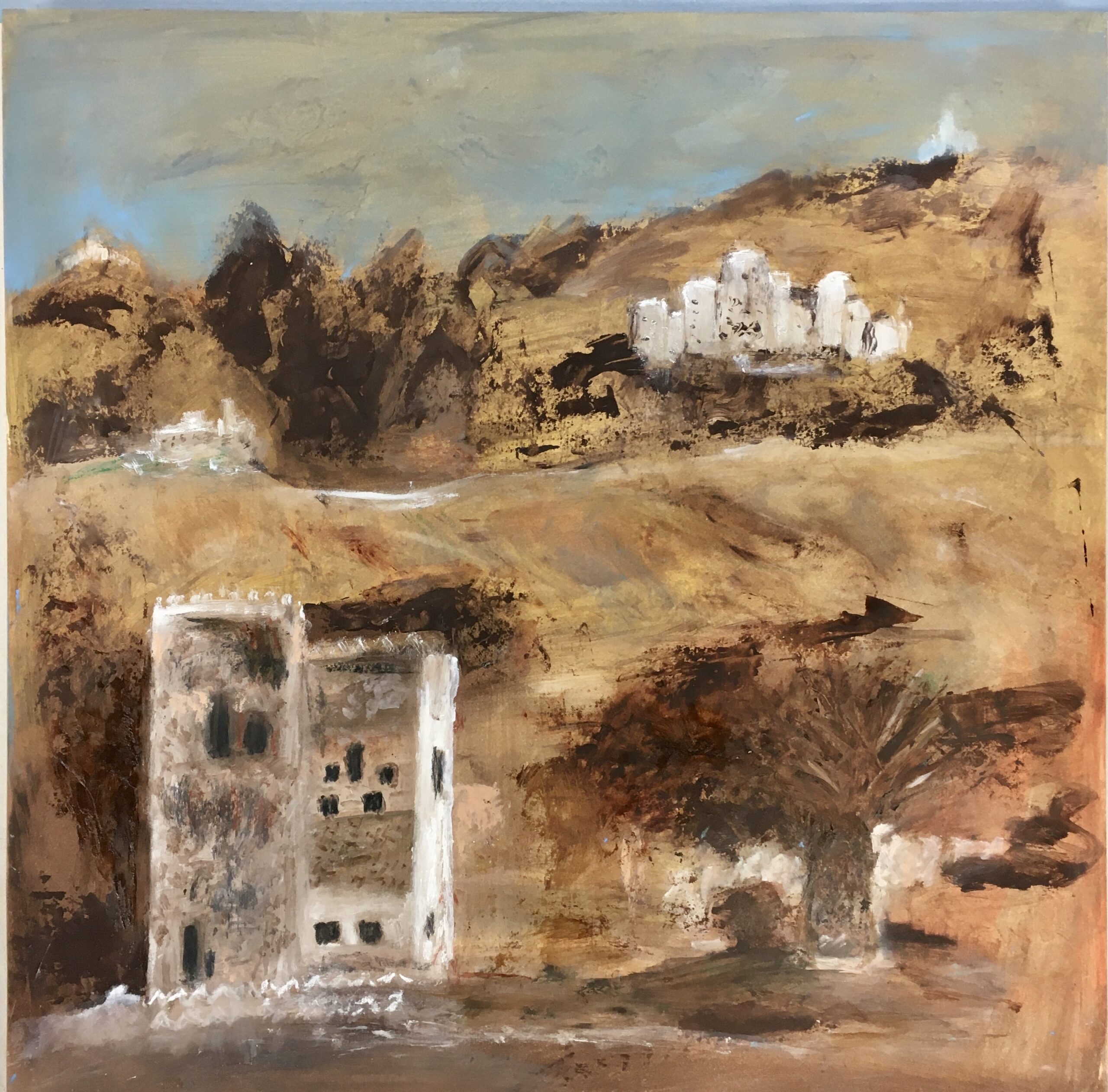 Villes et villages du Yémen, peinture à l’huile avec rehauts au pastel et collages