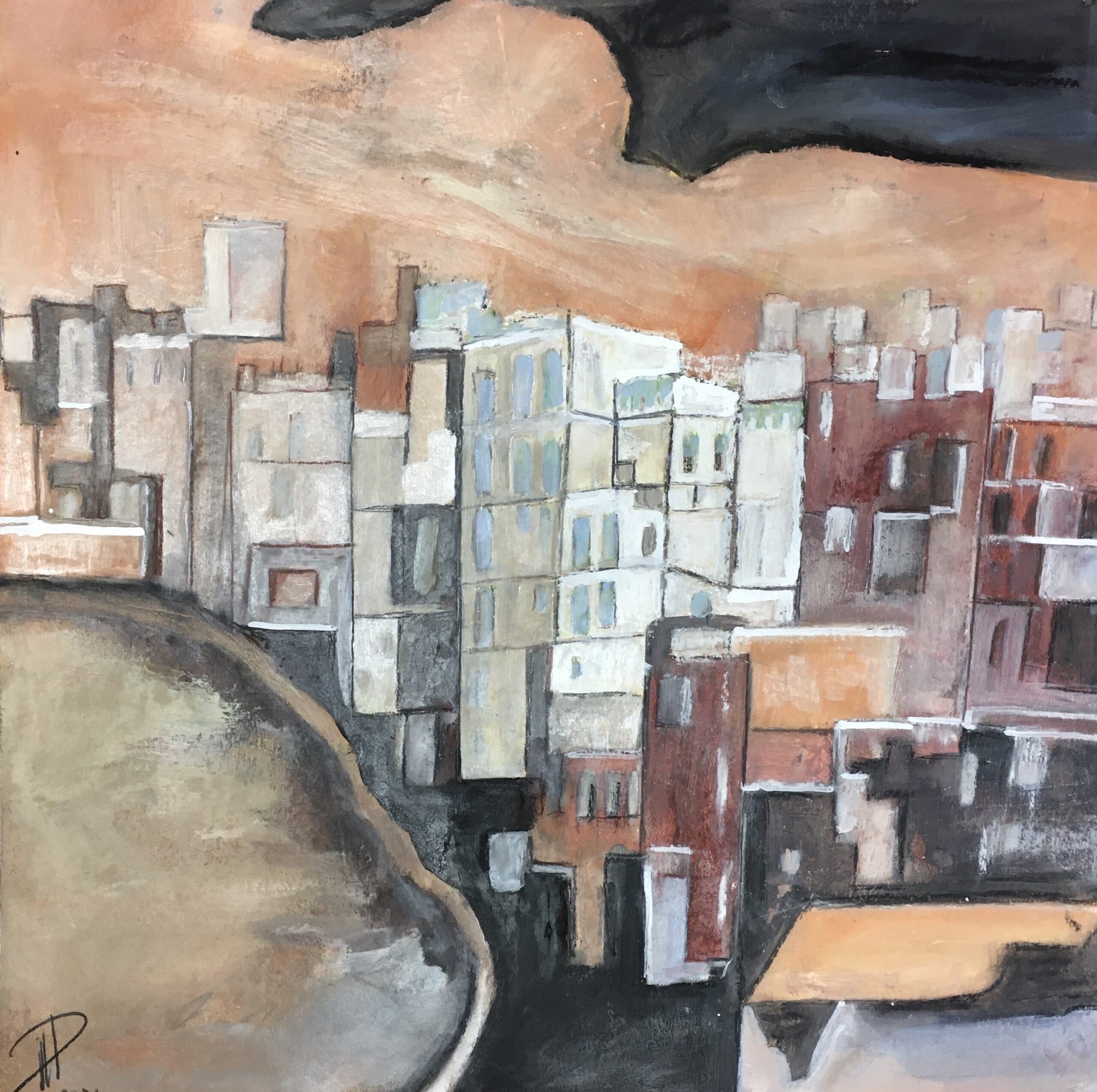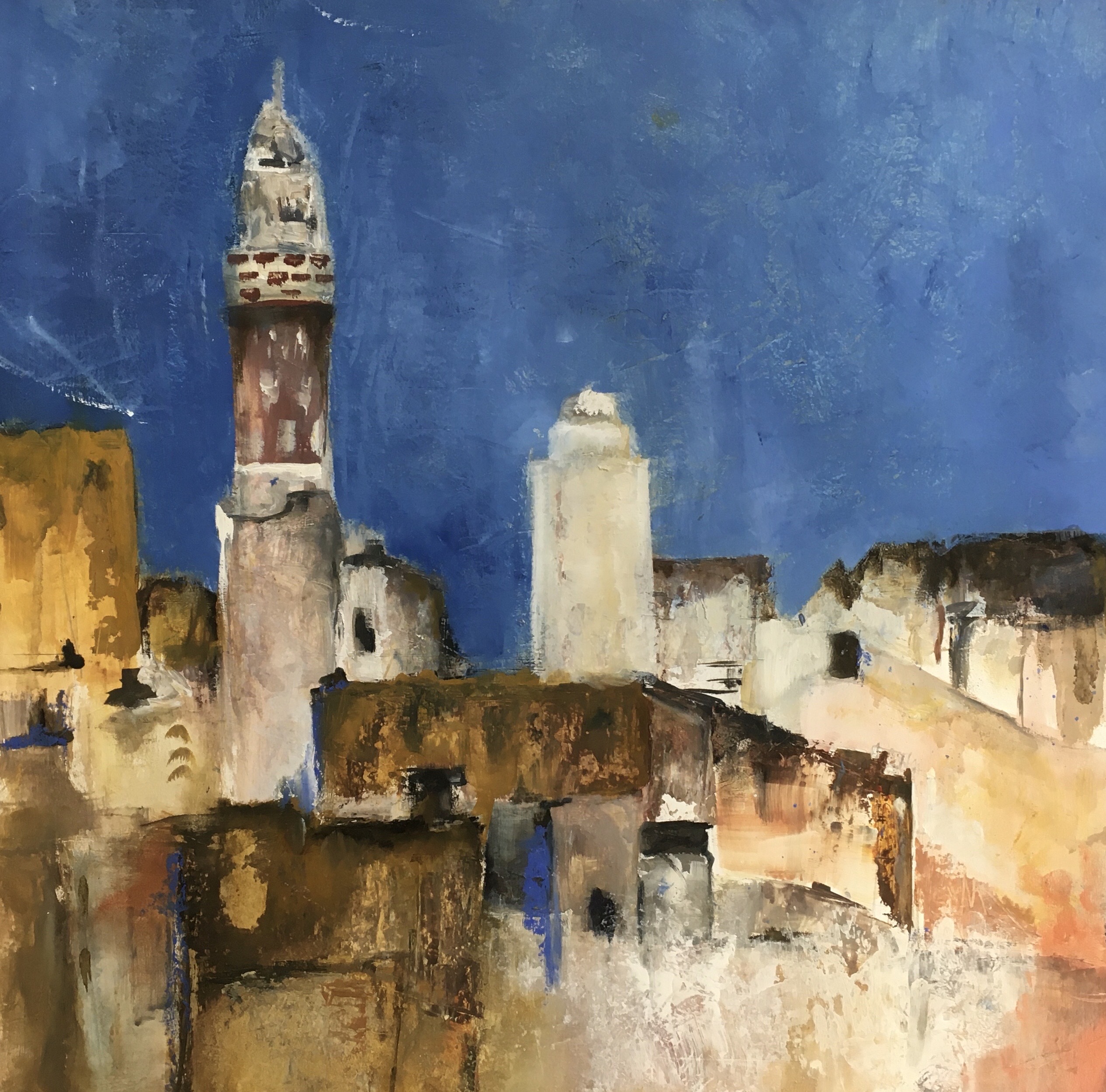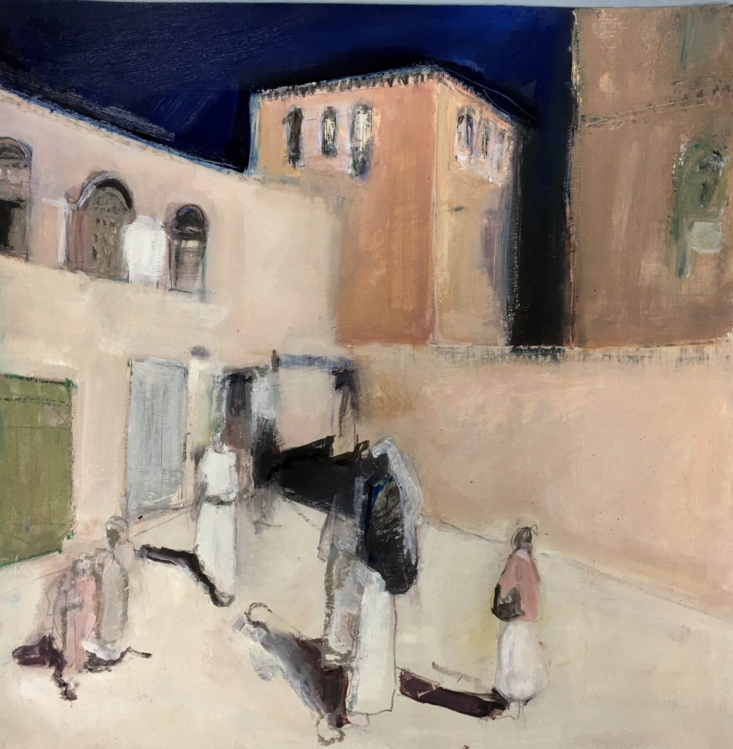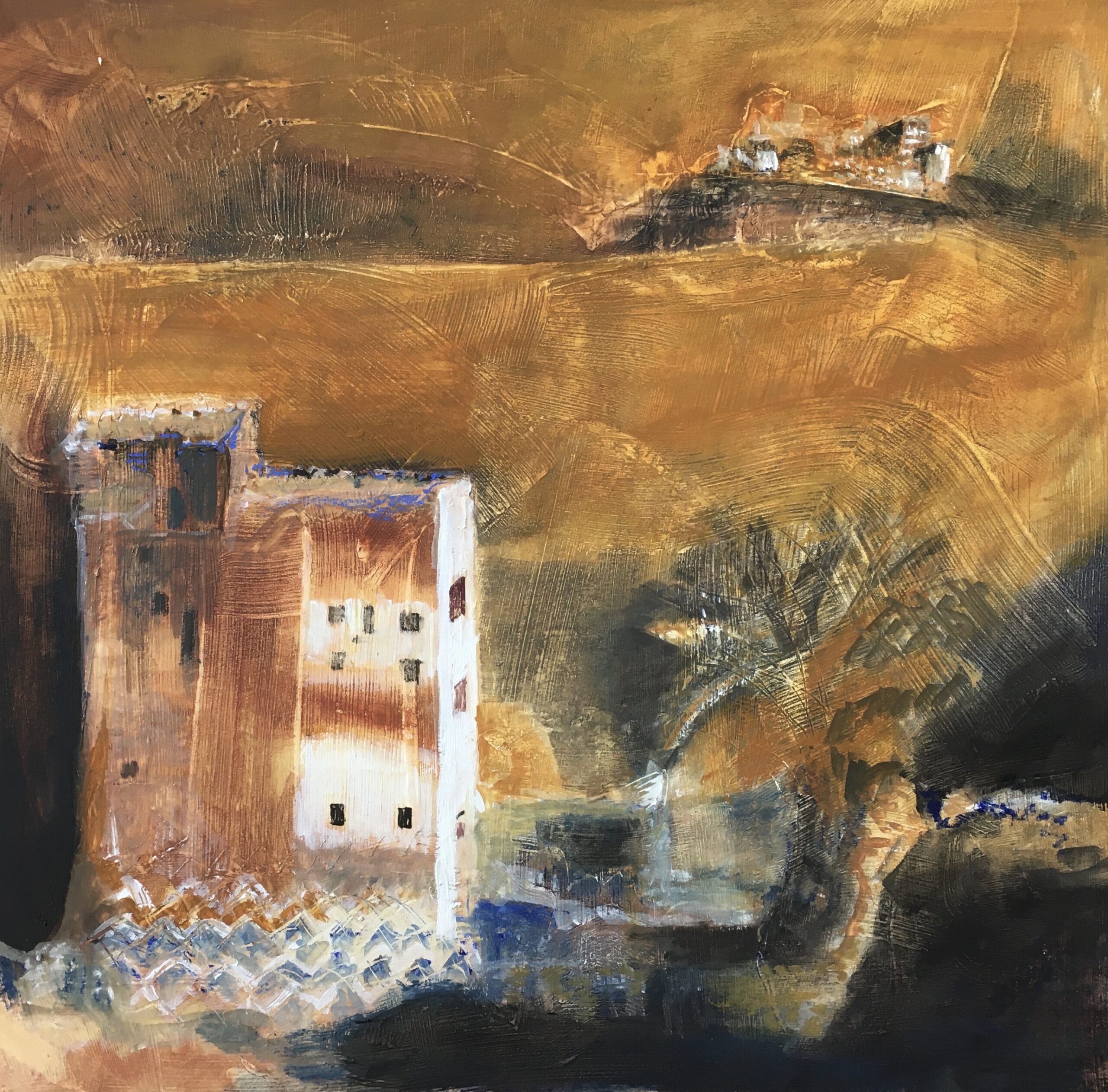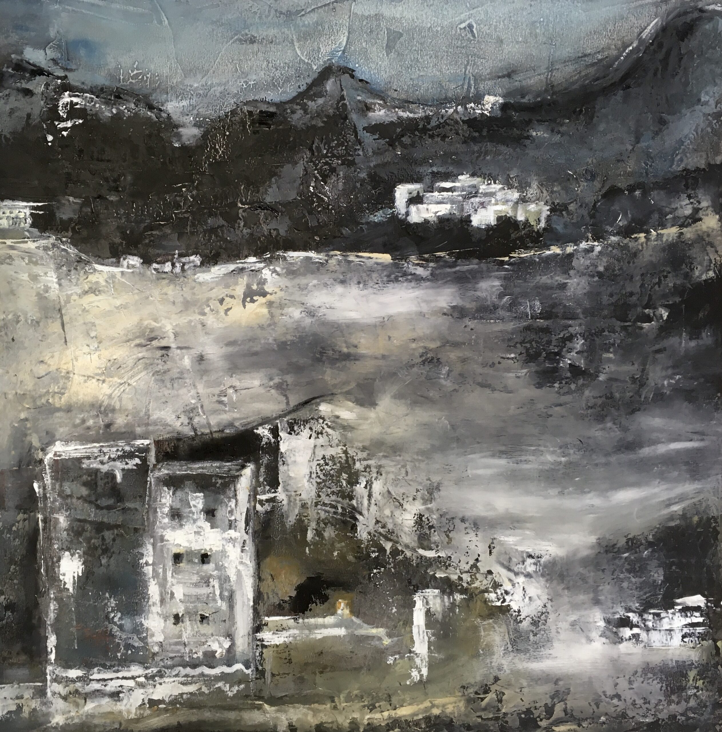 Villes et villages du Yémen, peinture à l’huile avec rehauts au pastel et collages