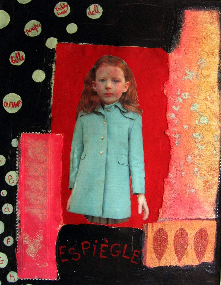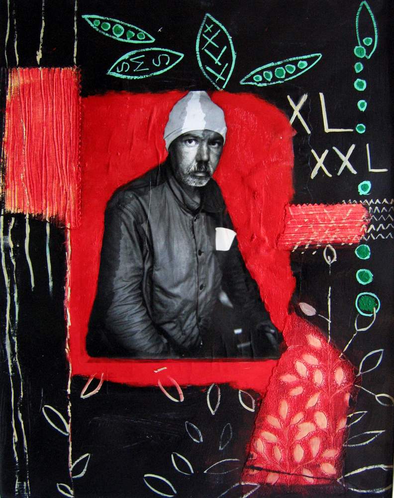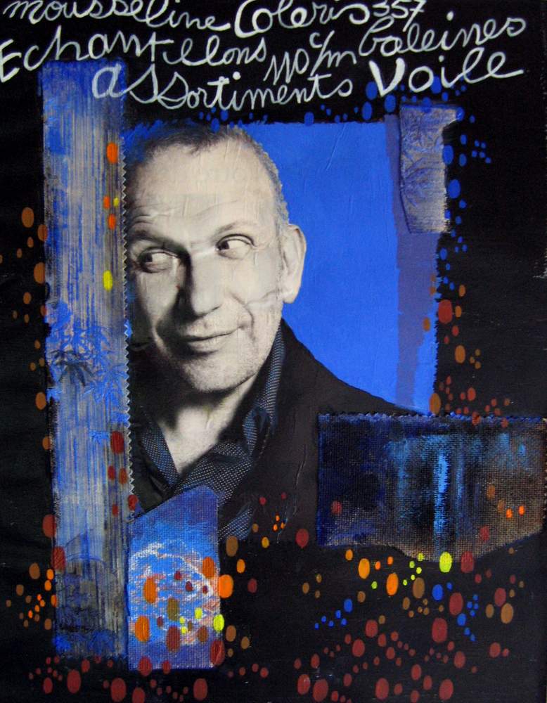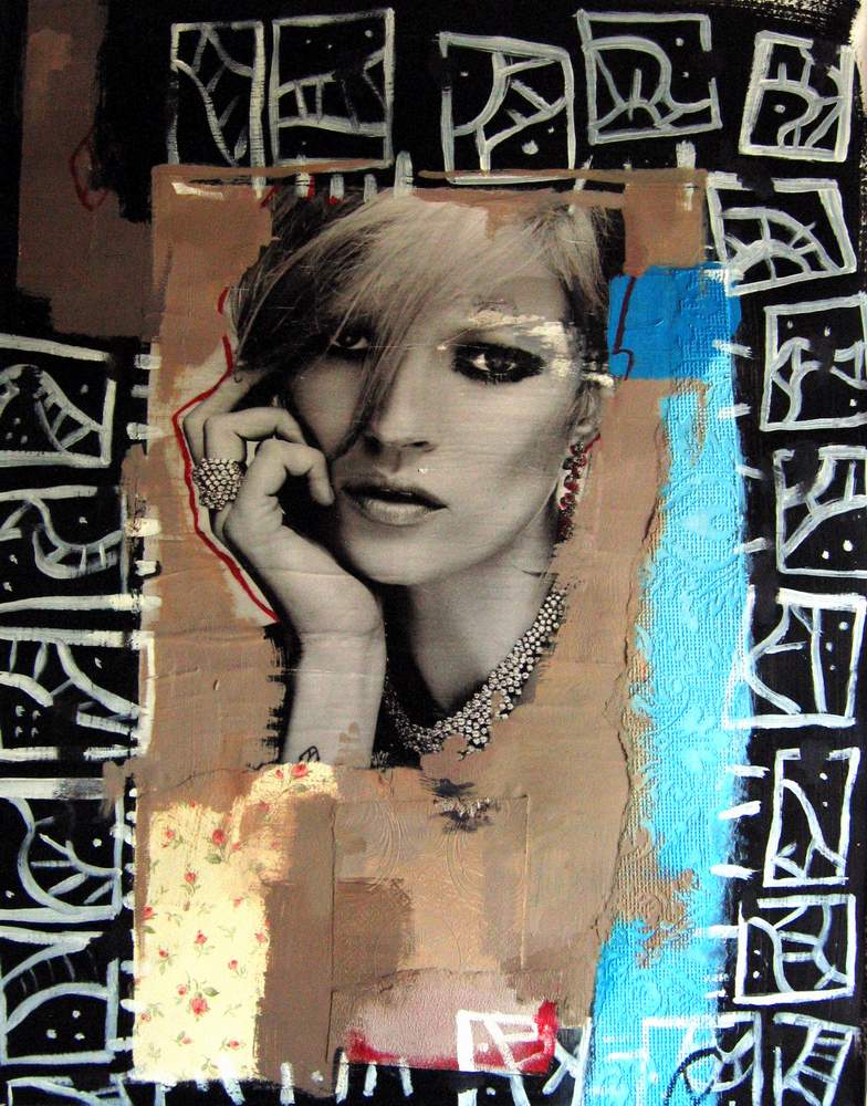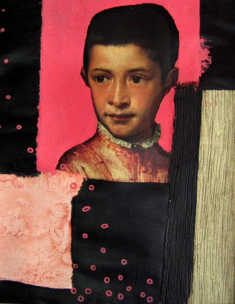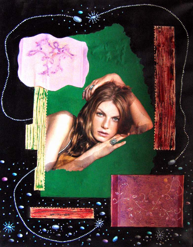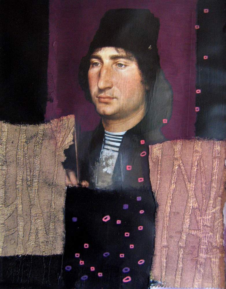 Mai 2009 – Portraits photo détourés Collage de tapisserie Motifs peints à l’huile sur fond noir