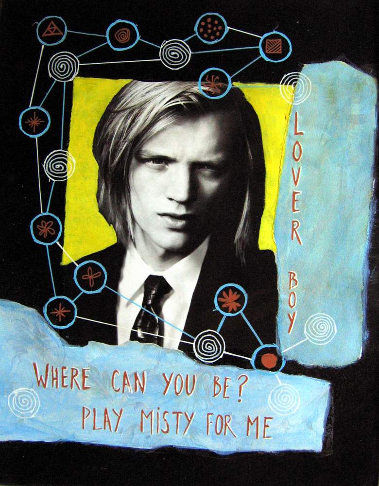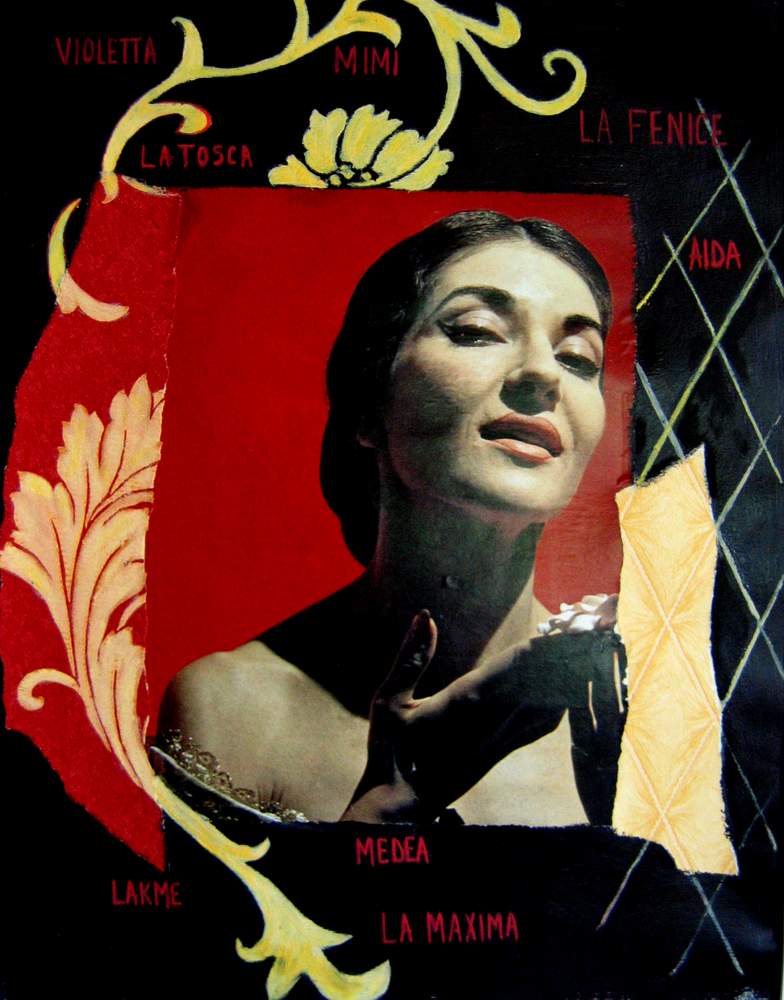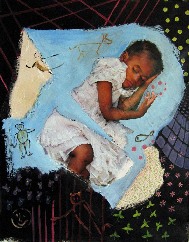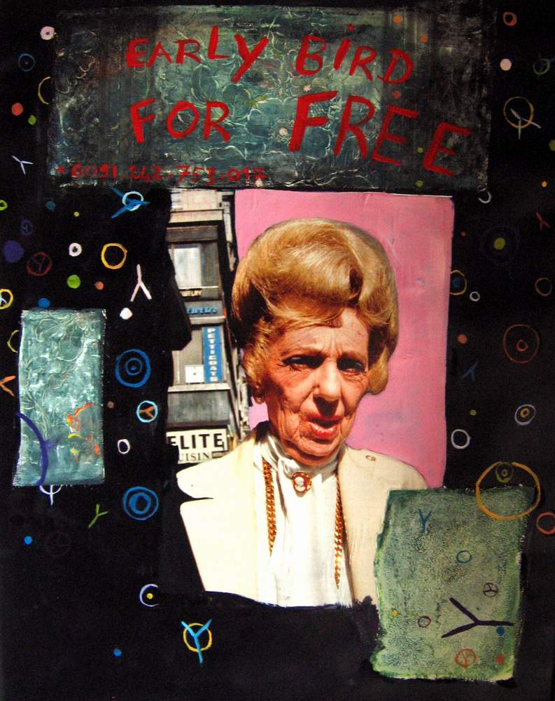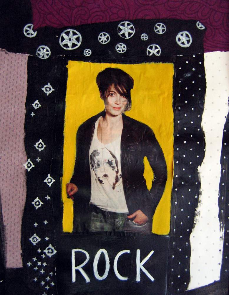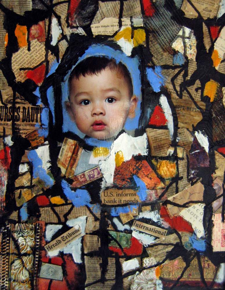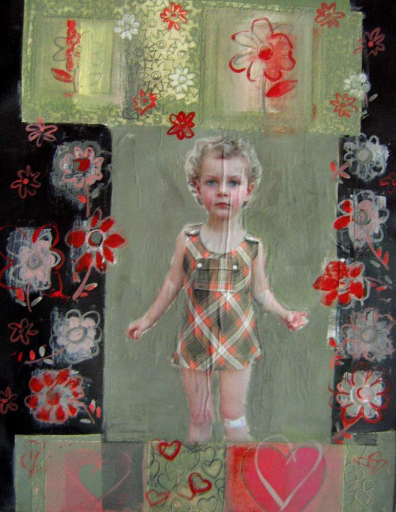 Mai 2009 – Portraits photo détourés Collage de tapisserie Motifs peints à l’huile sur fond noir